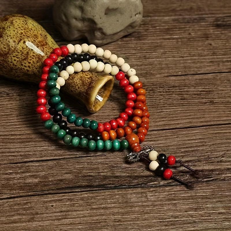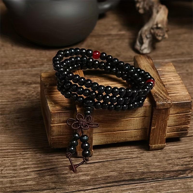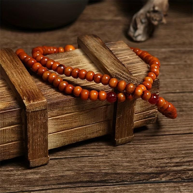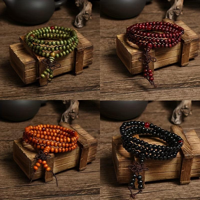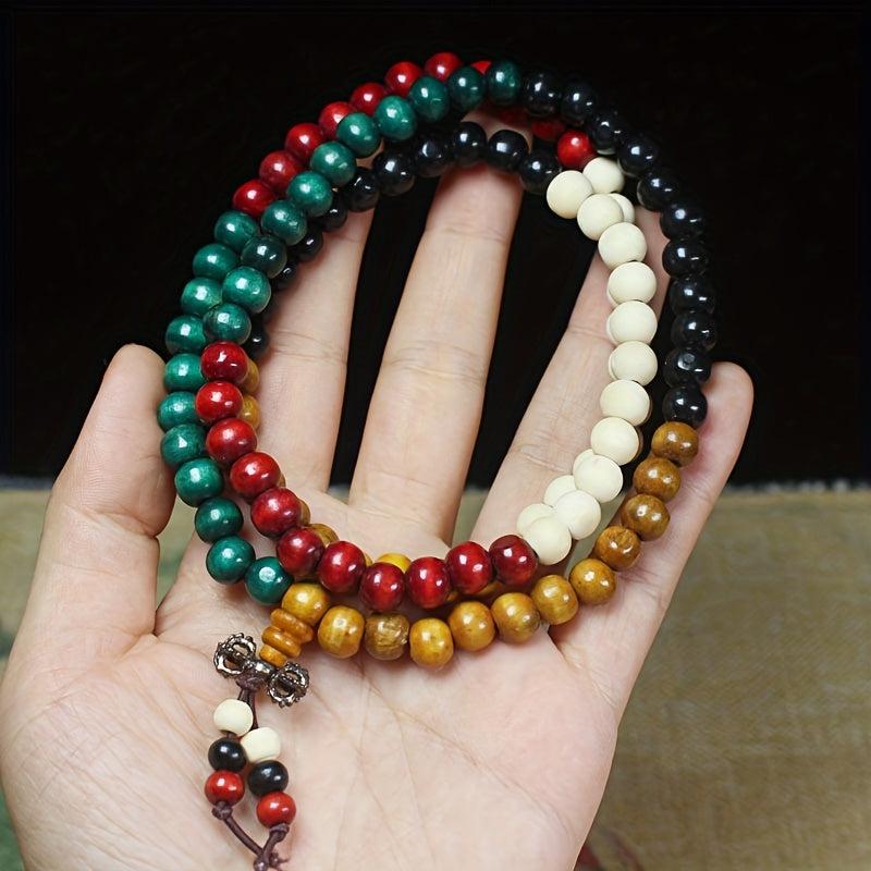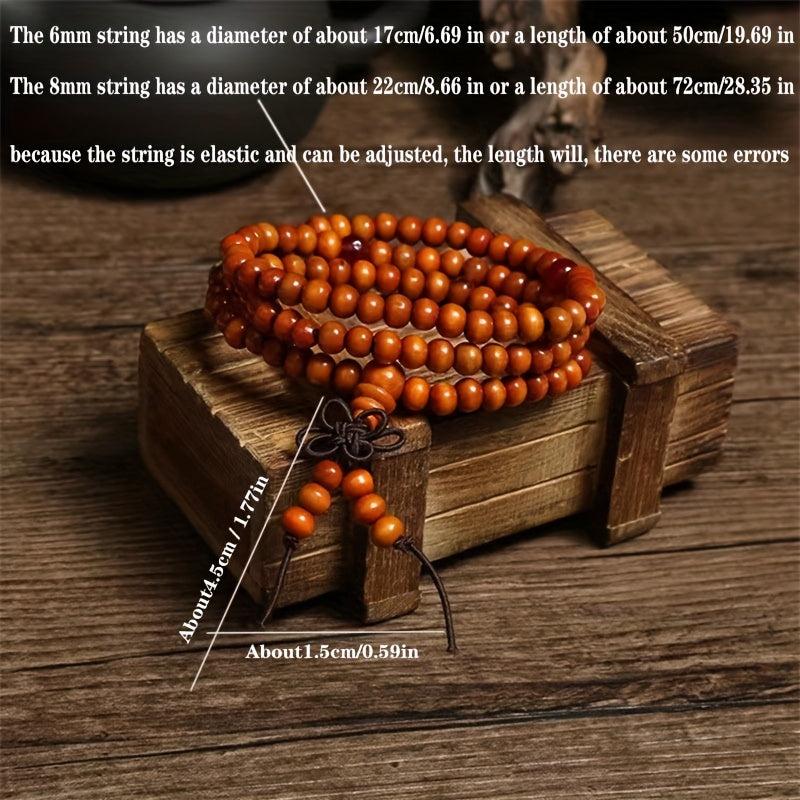 This beaded bracelet features 108pcs prayer beads in a multiple circle design made of faux sandalwood. It can be used as a hand string for meditation and relaxation.