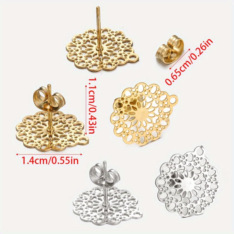 Get this set of 10 stainless steel flower ear studs with hollowed out design and earplug for easy jewelry making. Perfect for DIY earring projects.