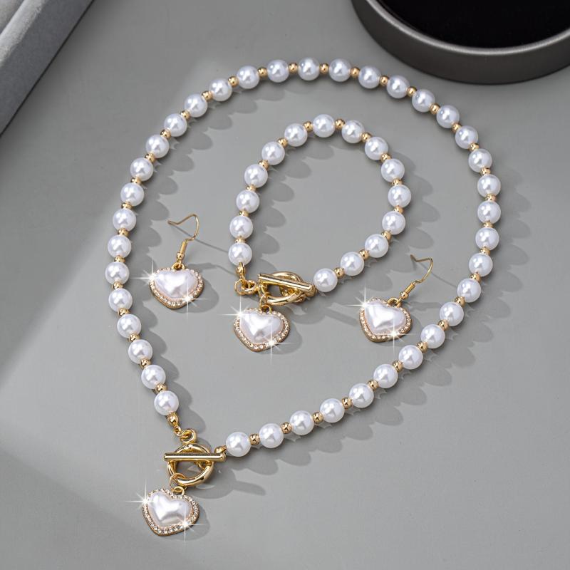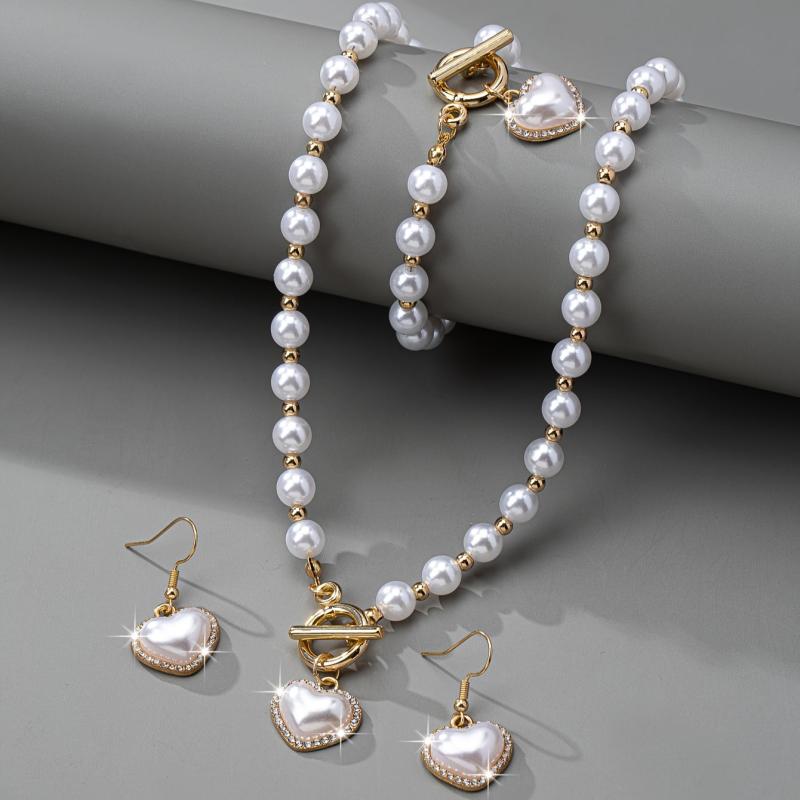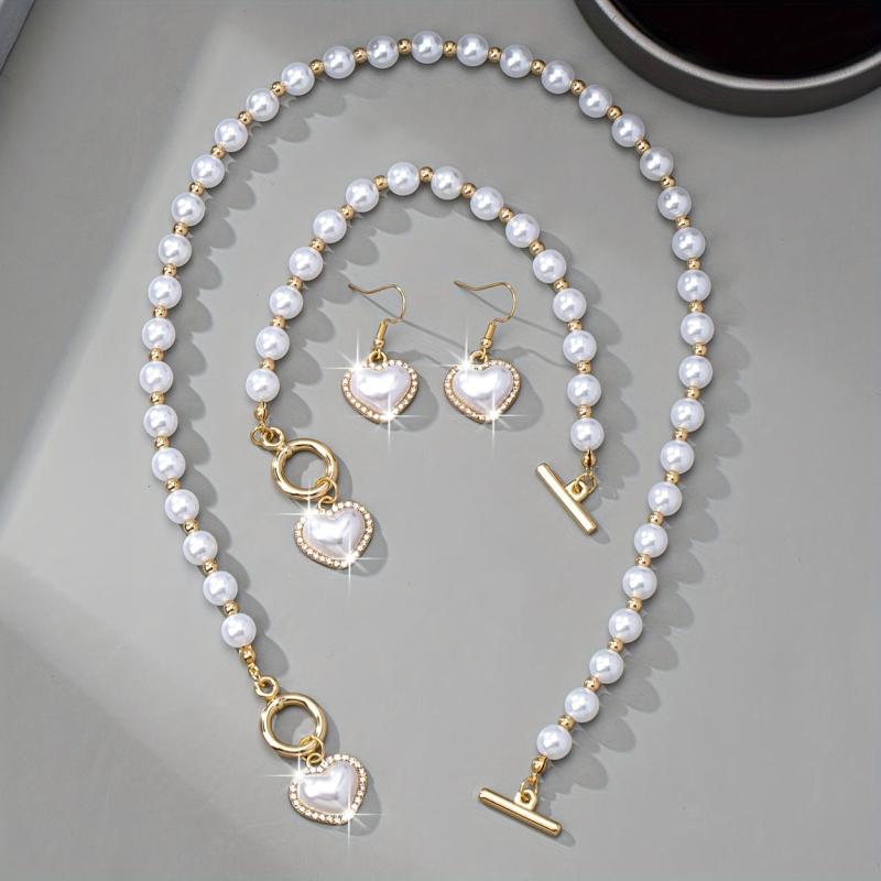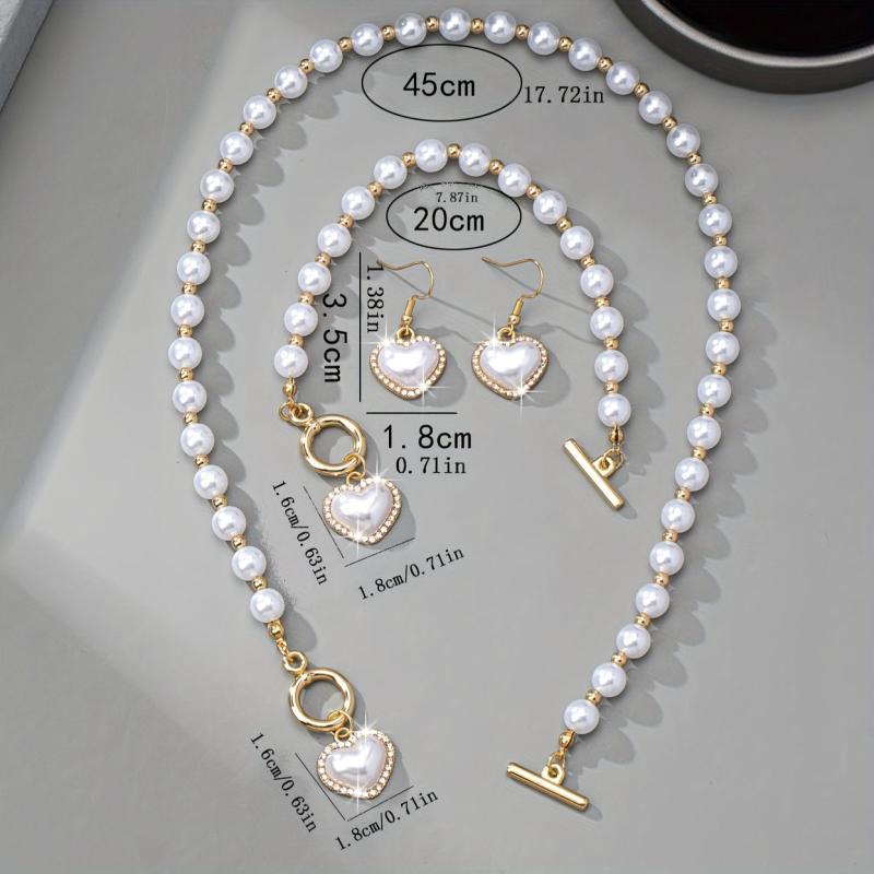 Complete your daily look with this elegant jewelry set featuring a necklace, earrings, and bracelet. The set is crafted with artificial pearls and rhinestone accents to add a touch of sophistication to any outfit.