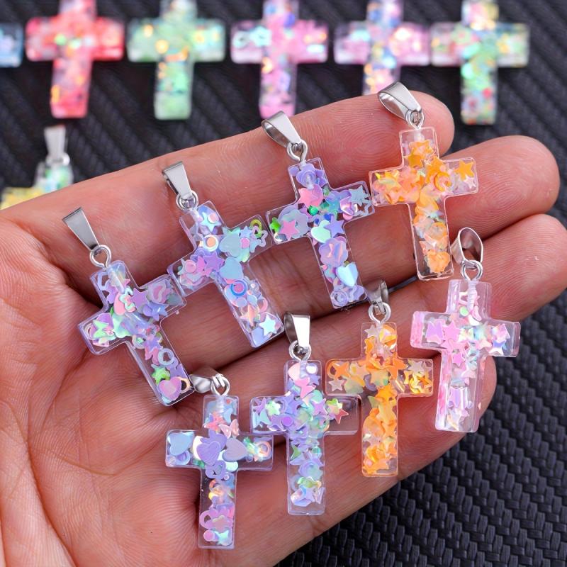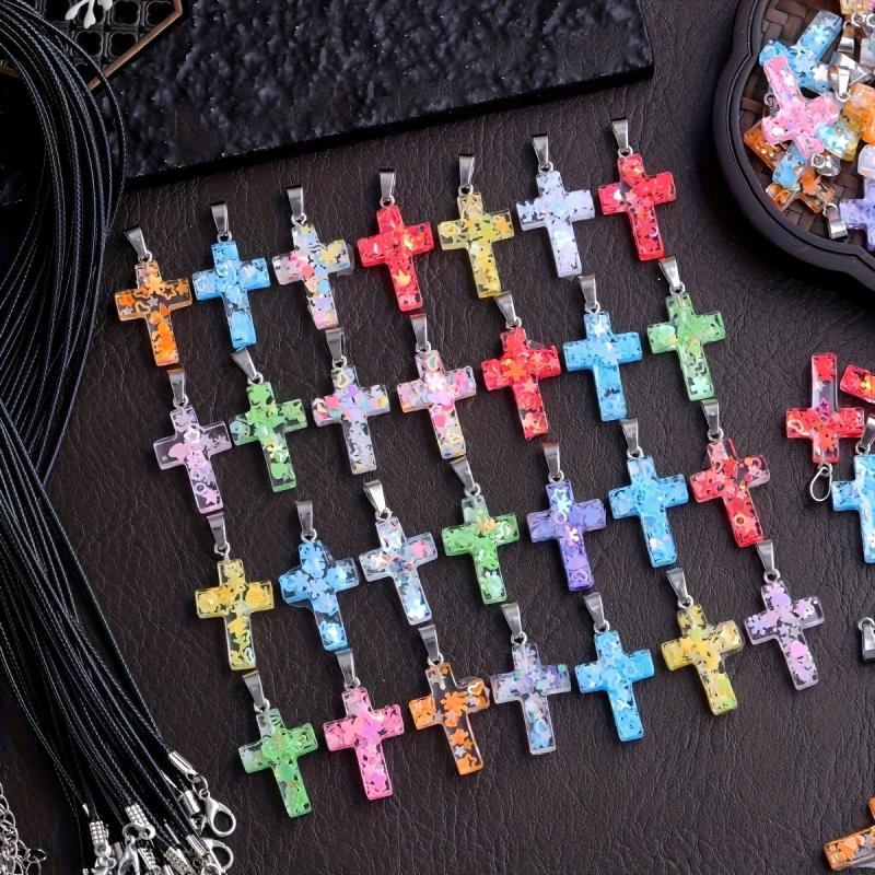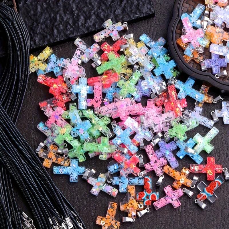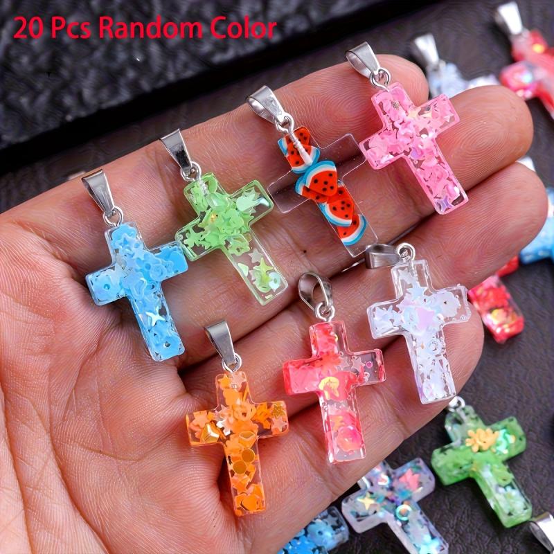 Bulk set of 20 cross-shaped artificial crystal pendants featuring flower and fruit patterns, perfect for crafting decorative accessories like necklaces. Each charm is made of resin and has a unique design.