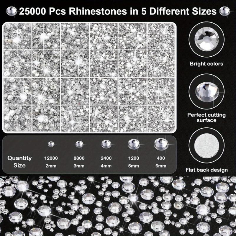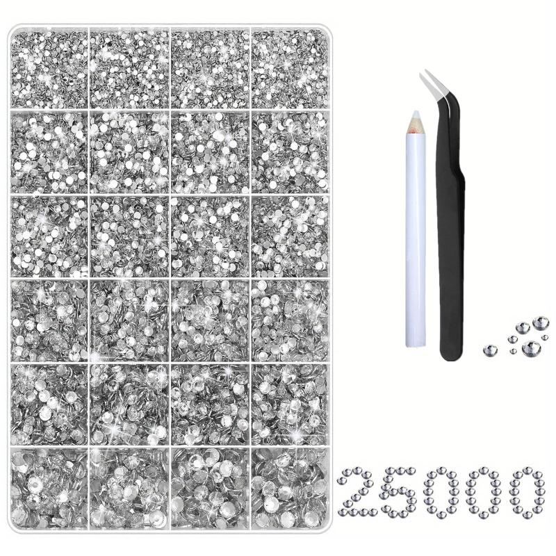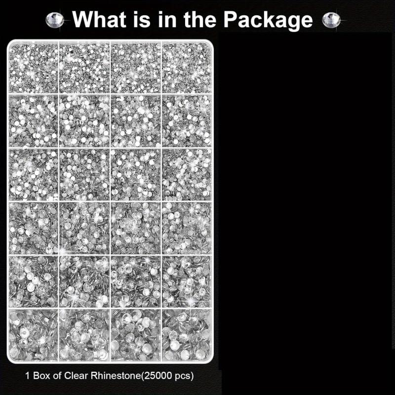 This set includes 25000 clear silvery rhinestones along with pens and tweezers, perfect for adding sparkle to your DIY crafts and clothing projects.