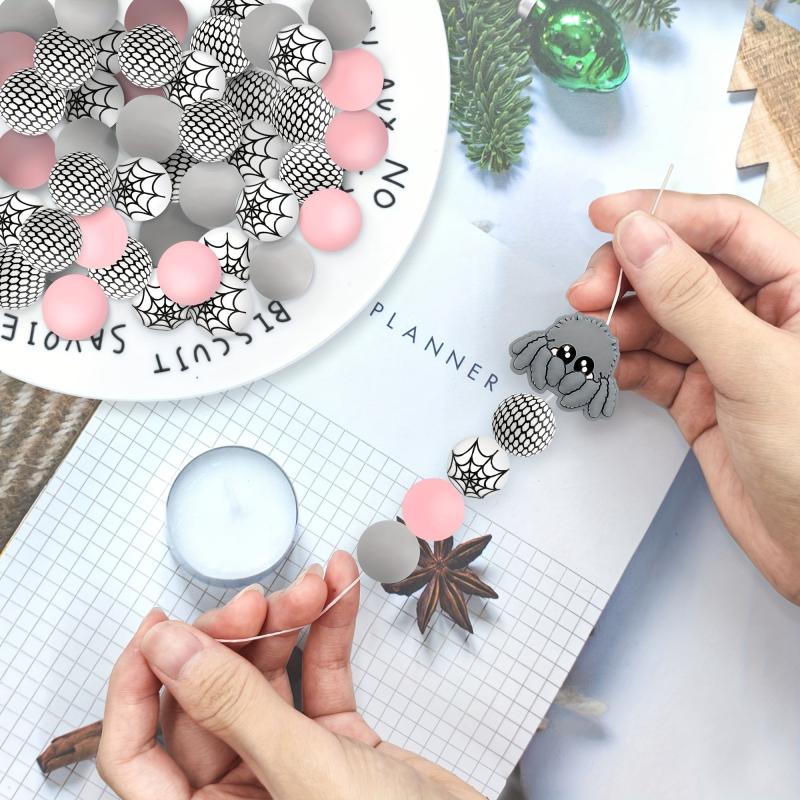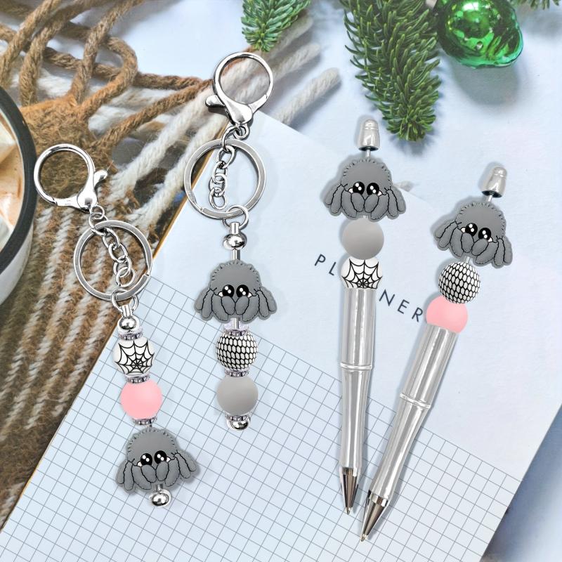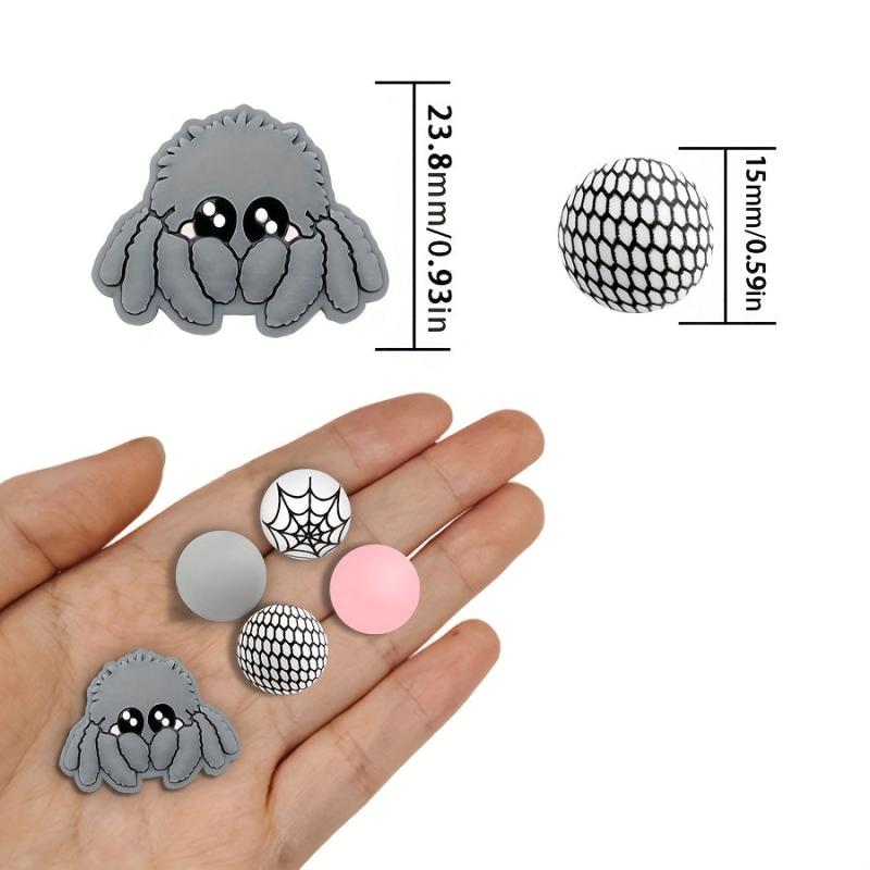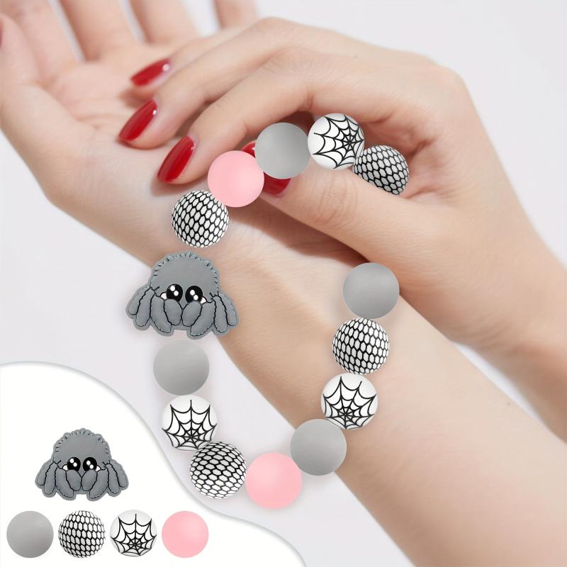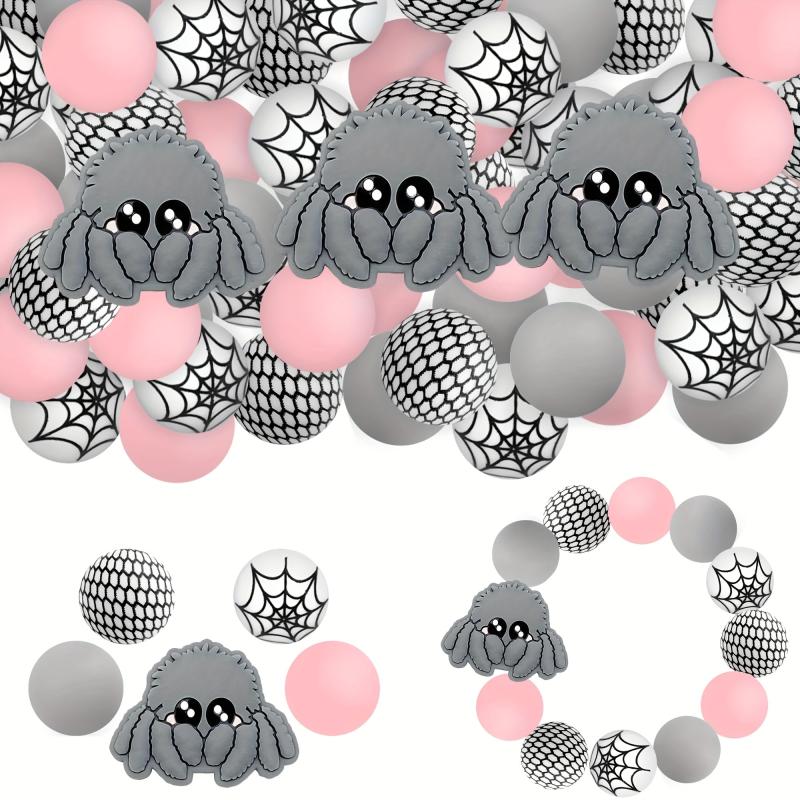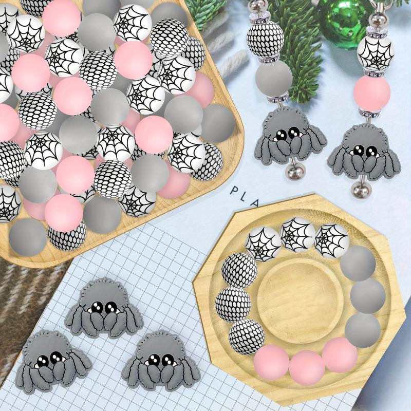 These silicone beads in gray and pink with a little spider design are perfect for making earrings, necklaces, bag chains, phone charms, makeup brush holders, and keychains.