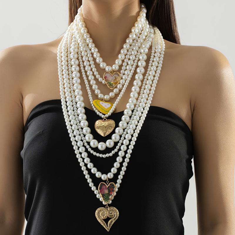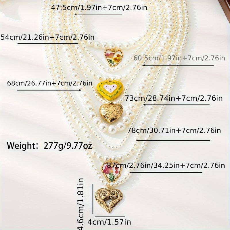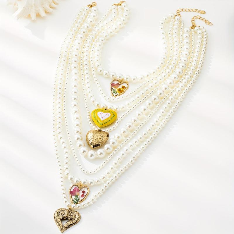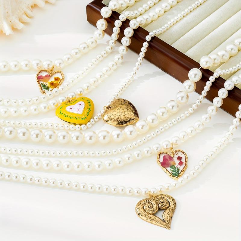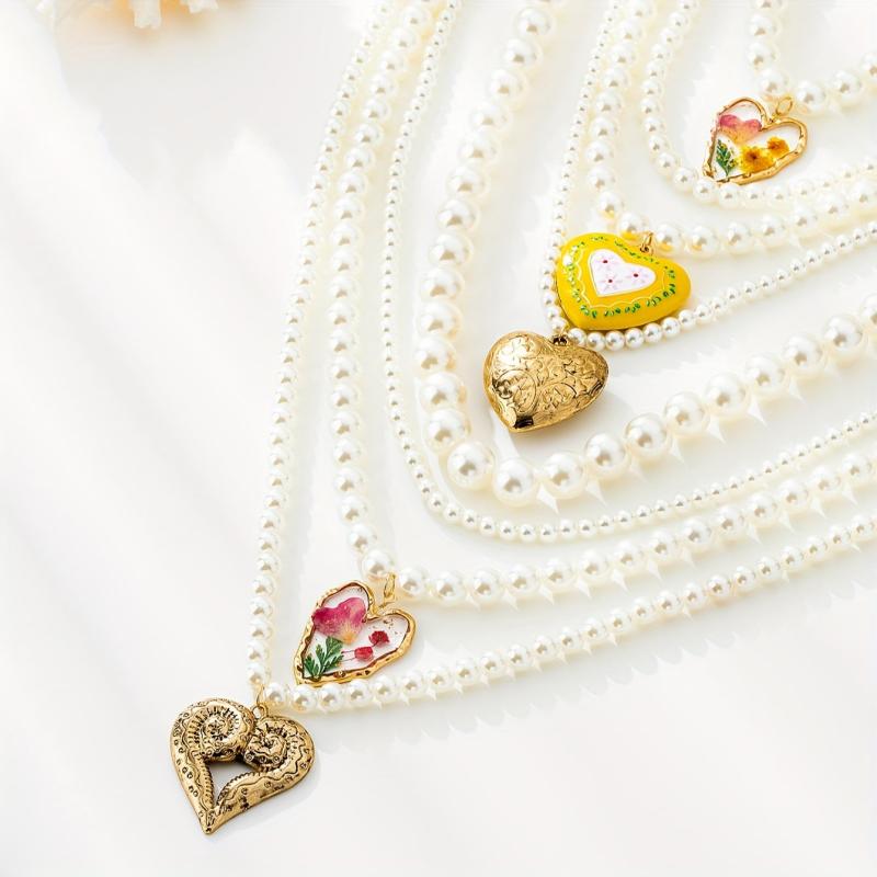 Elegant 2pcs necklace set featuring faux pearl strands with alloy heart pendants. Vintage and boho style perfect for women's parties and faux pearl jewelry.