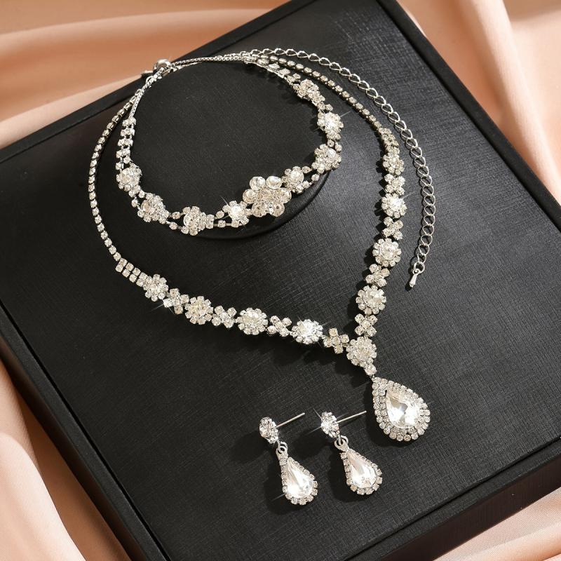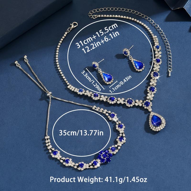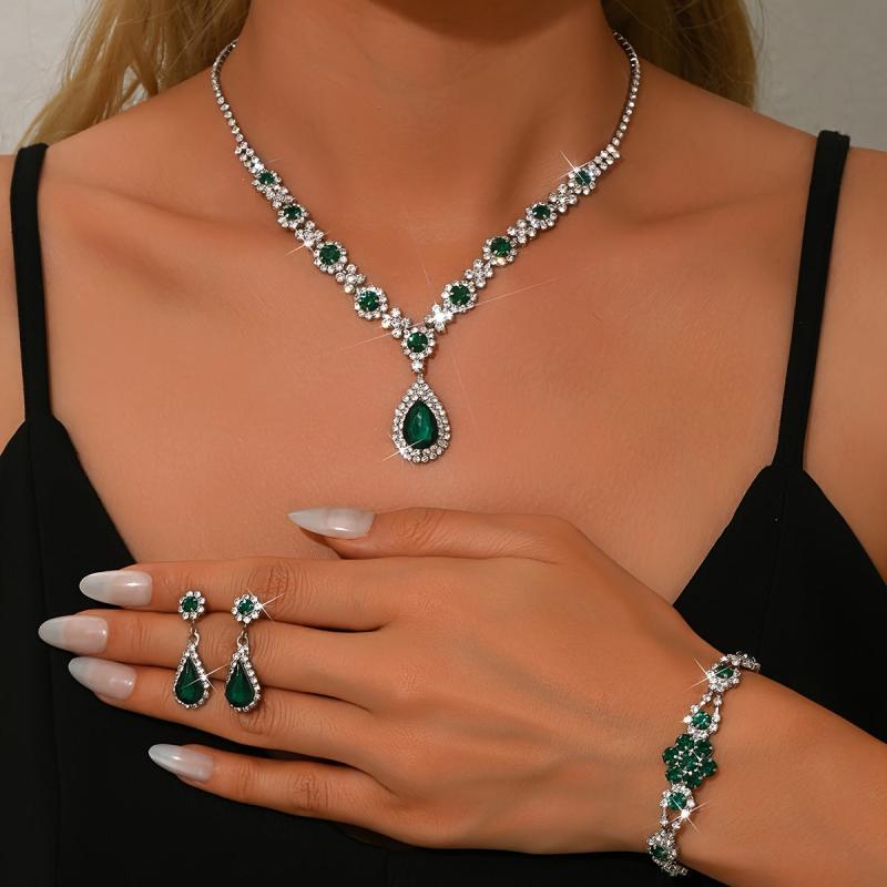 This elegant 3-piece jewelry set features gemstone teardrop design, all silver plated. Perfect for weddings and parties.