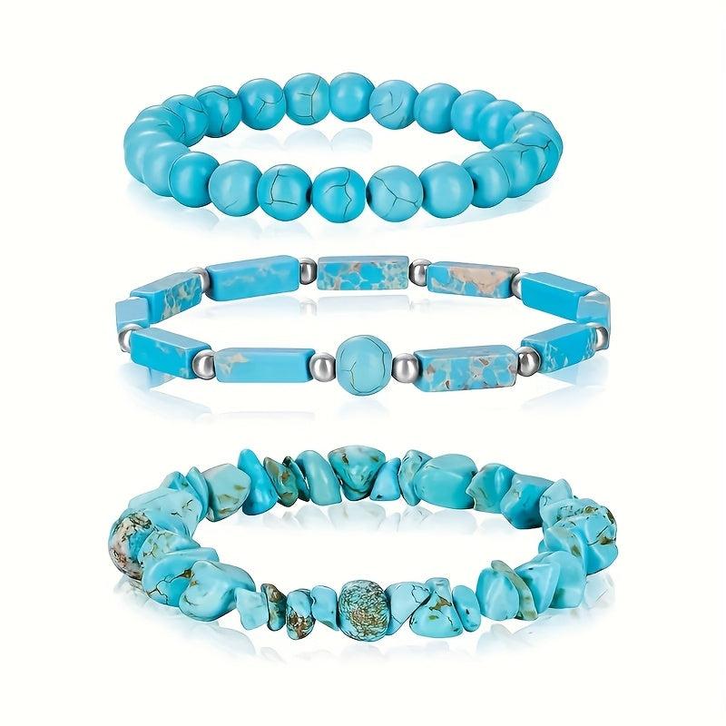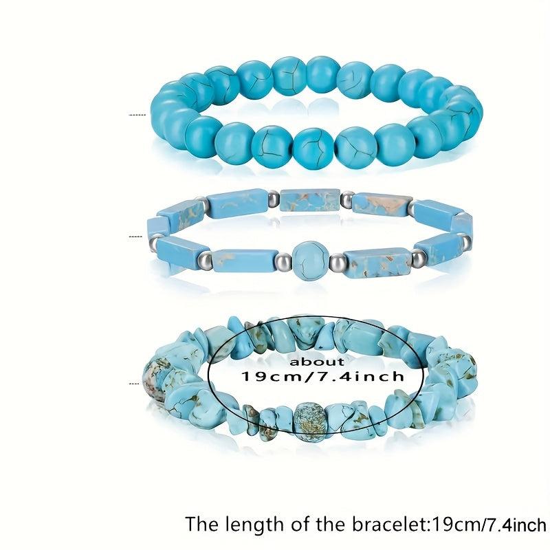 Enhance your summer beach look with this set of 3 turquoise beaded bracelets that are suitable for both men and women. These bohemian-style accessories are perfect for adding a touch of color and style to your outfit.