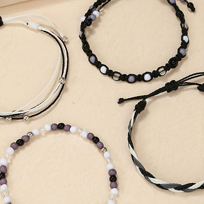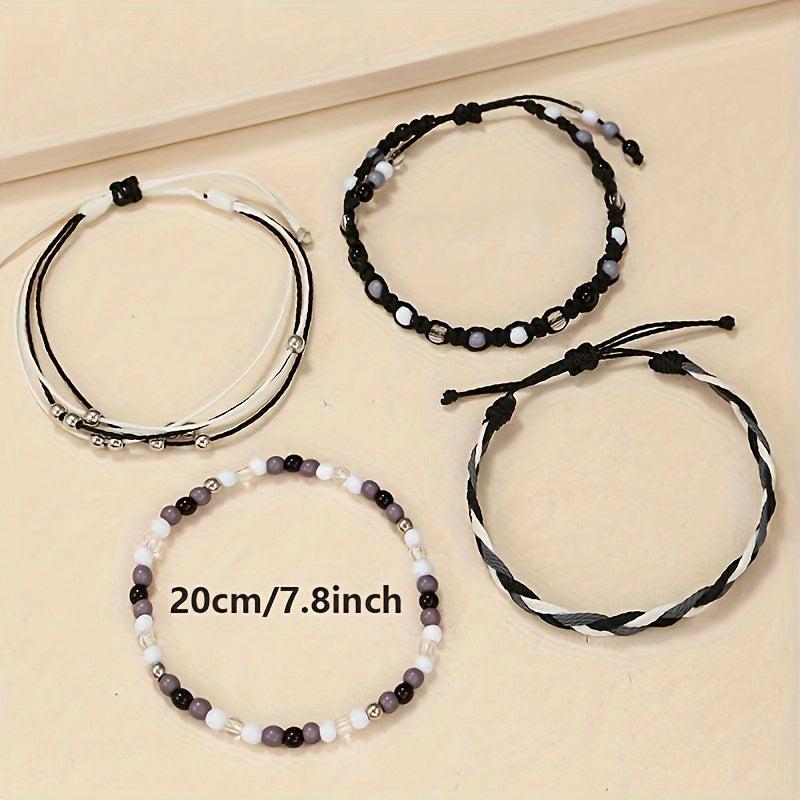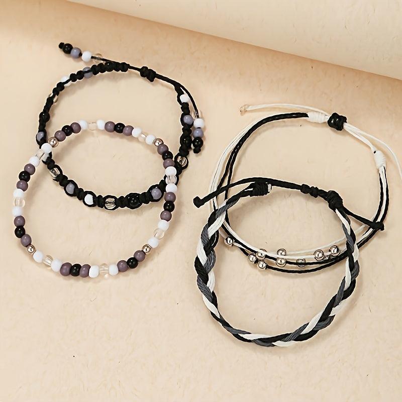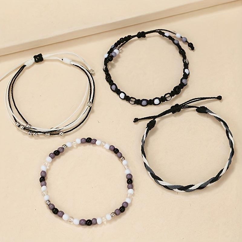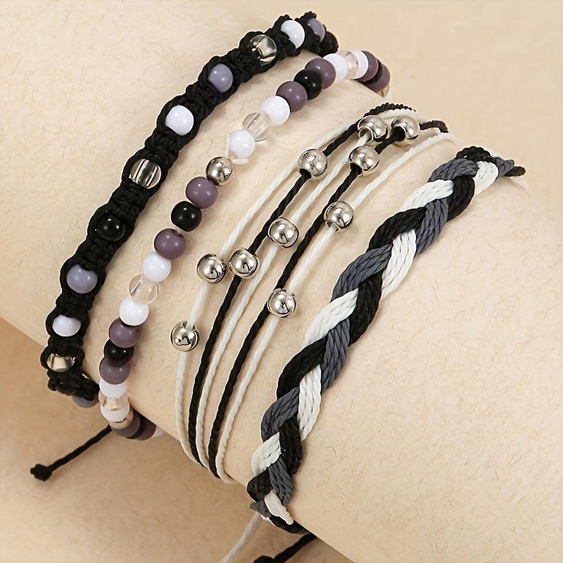 Elevate your summer look with this 4-piece set of handwoven bracelets featuring a mix of beads and braided designs. Perfect accessory for women.
