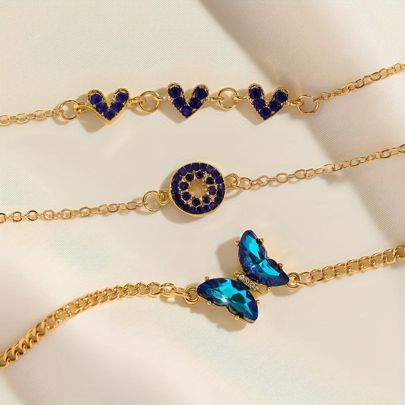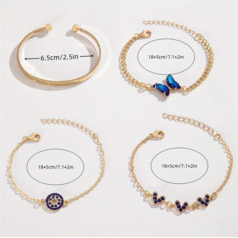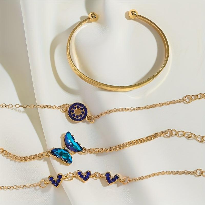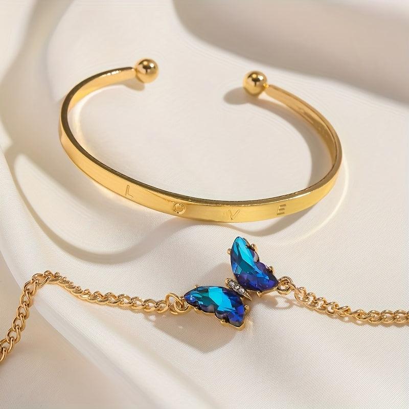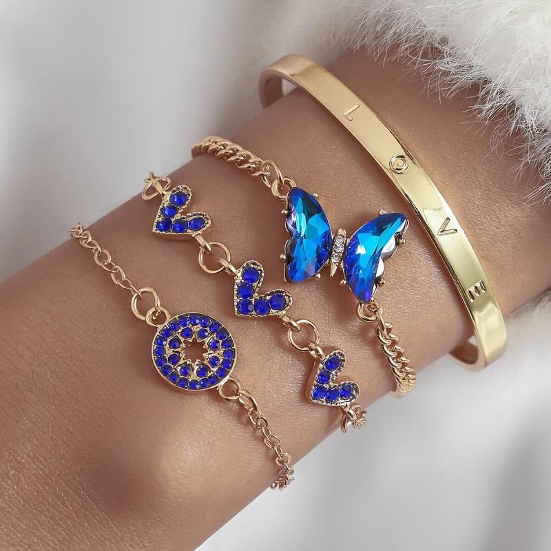 This set includes 4 golden toned bracelets with gemstones, vintage butterfly and heart charms, and LOVE inscription. Perfect for date night or as a gift.