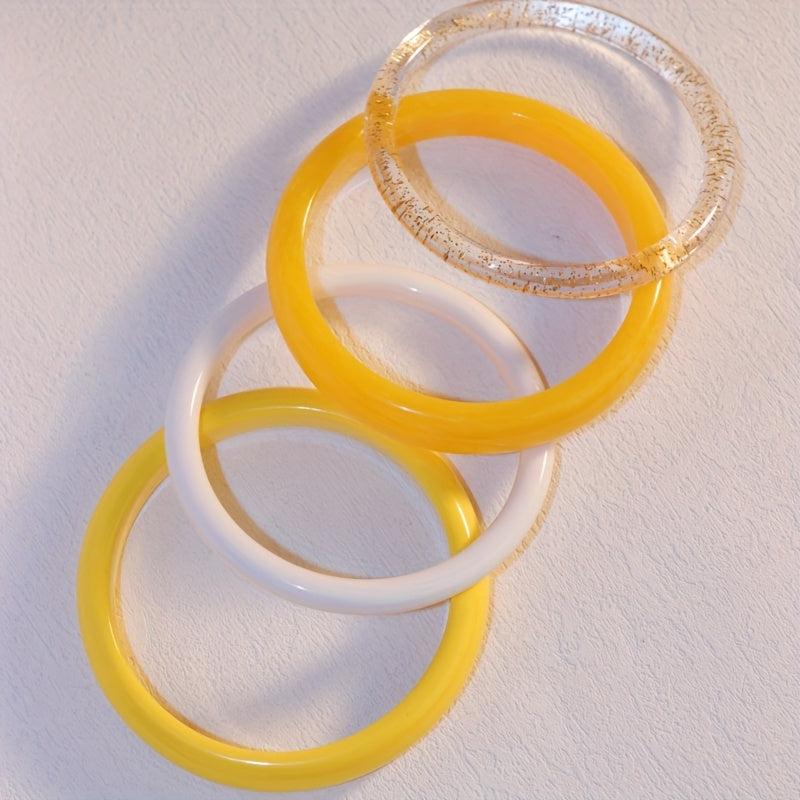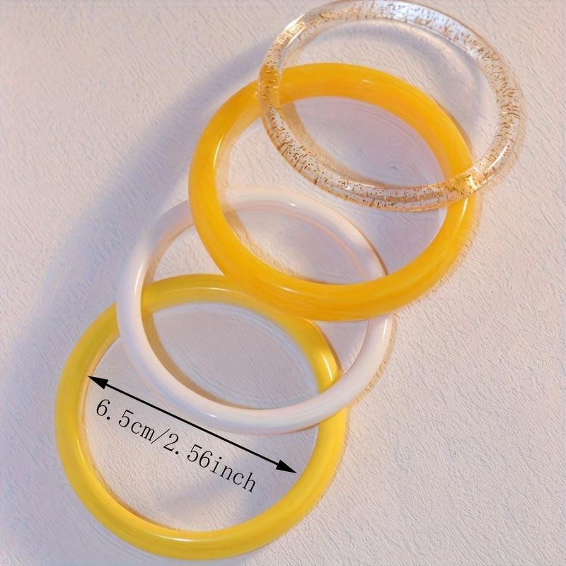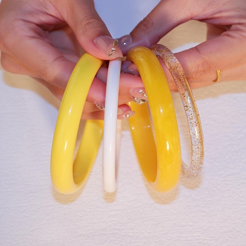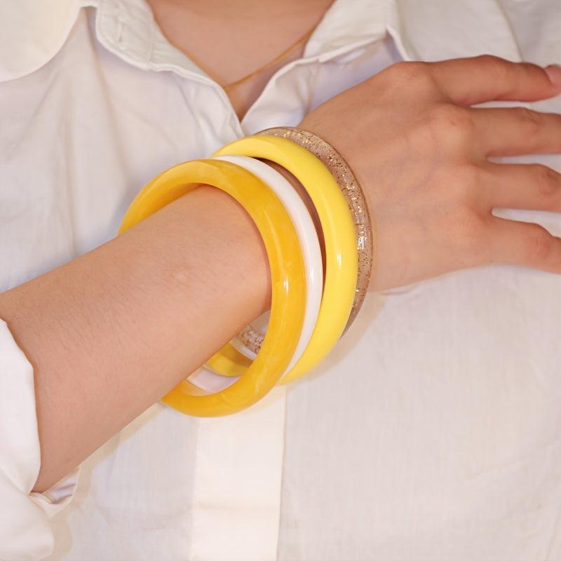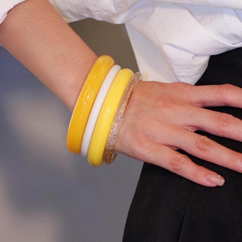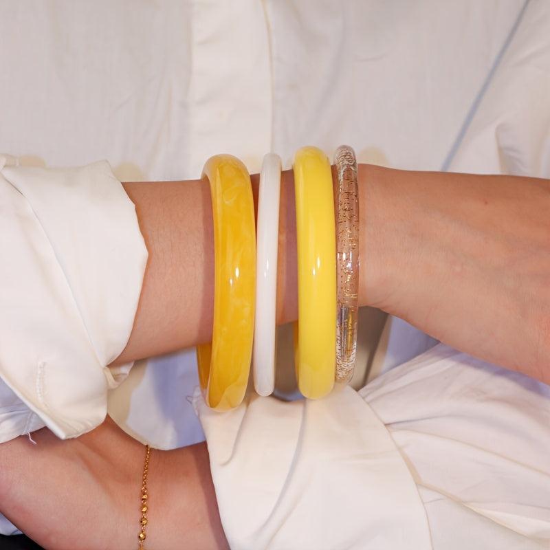 Add a pop of color to your outfit with this set of 4 lemon yellow and contrast resin bangles. These stackable bracelets are perfect for the bohemian minimalist look.