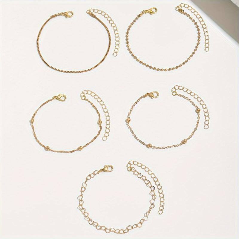 5pcs Golden Toned Bracelet Set with Love Heart Charms & Classic Style