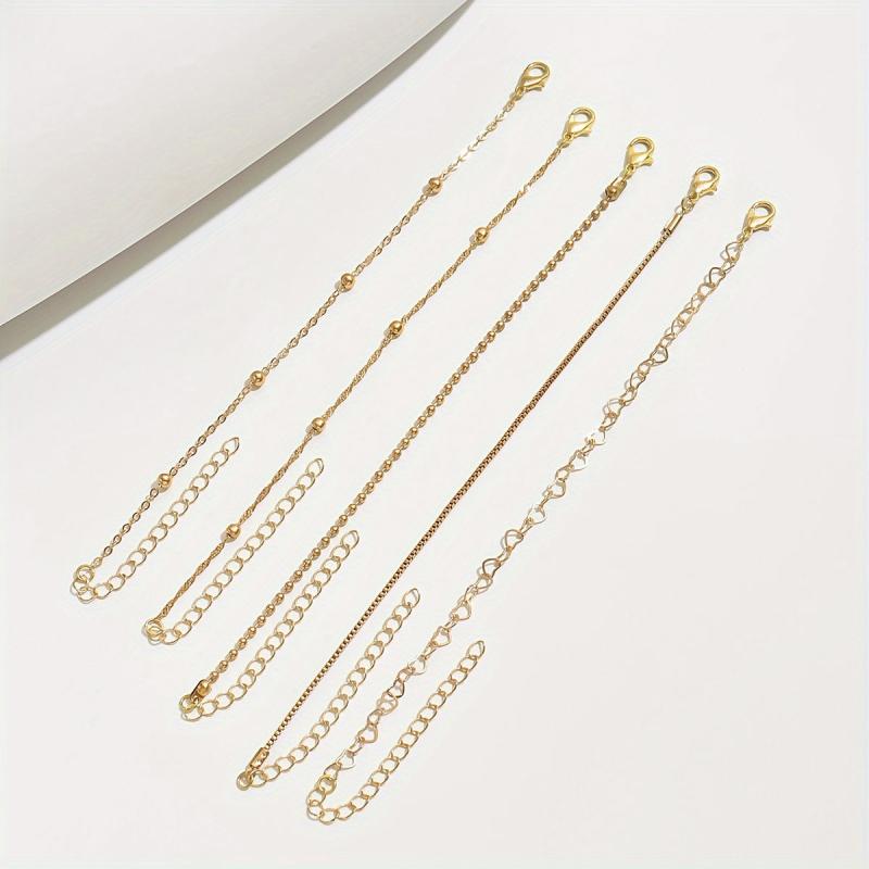 Upgrade your casual attire with this set of 5 golden toned bracelets featuring love heart charms. The thin chain design adds a touch of elegance to your outfit.