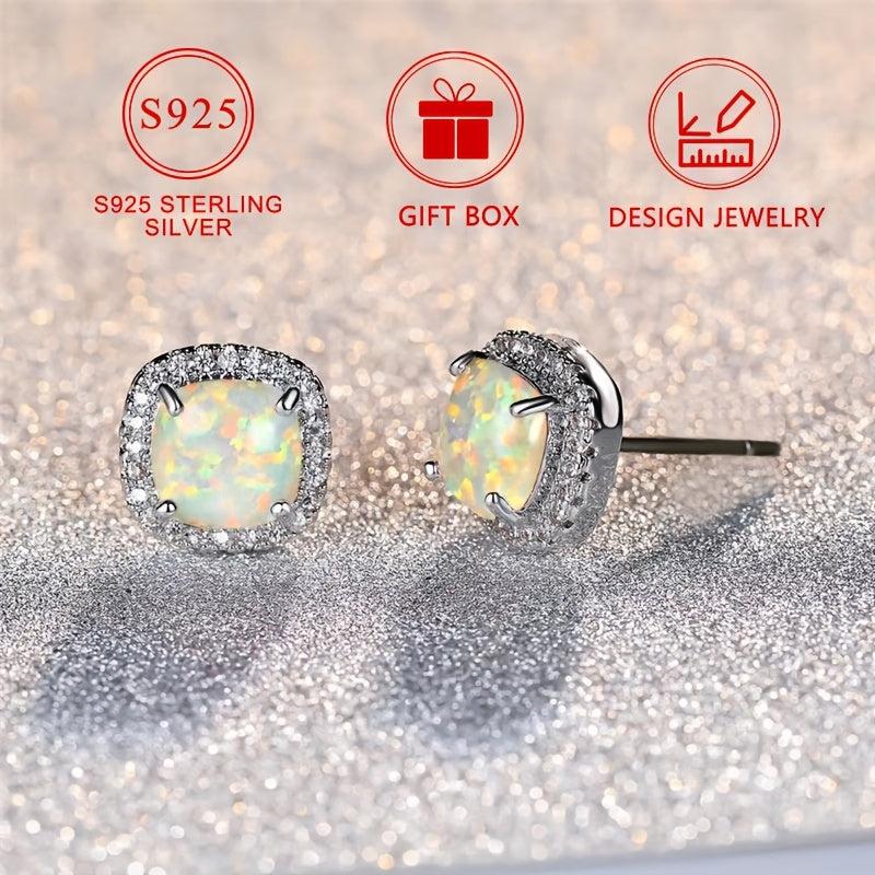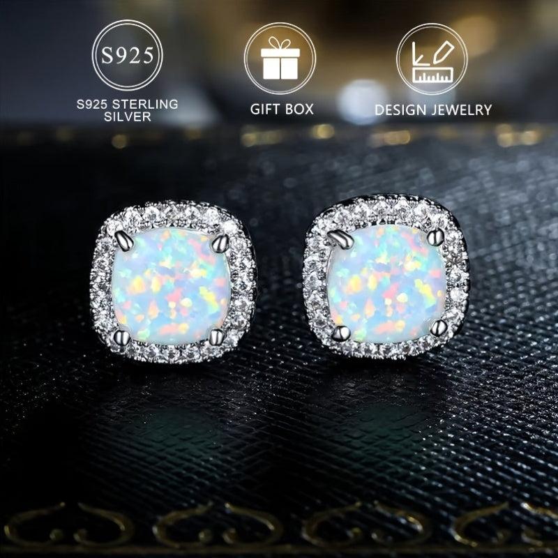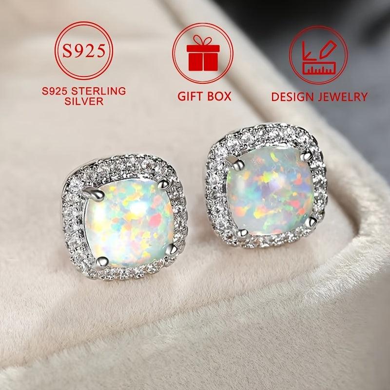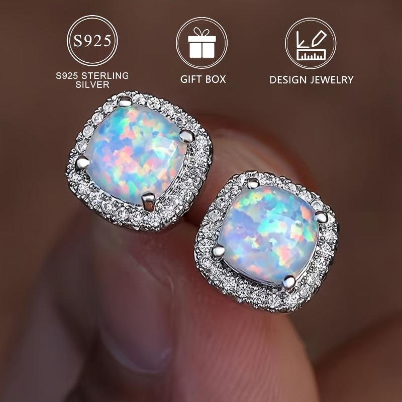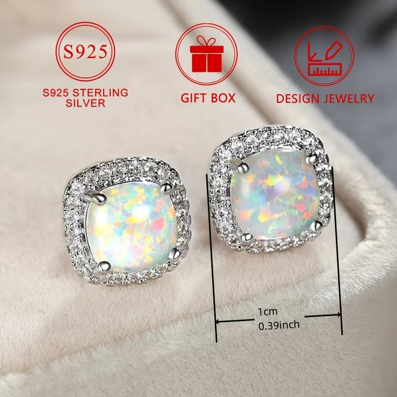 Stunning pair of 925 sterling silver earrings with synthetic opal, perfect for engagement, wedding, and daily wear. Rhodium plated for a sparkling finish.