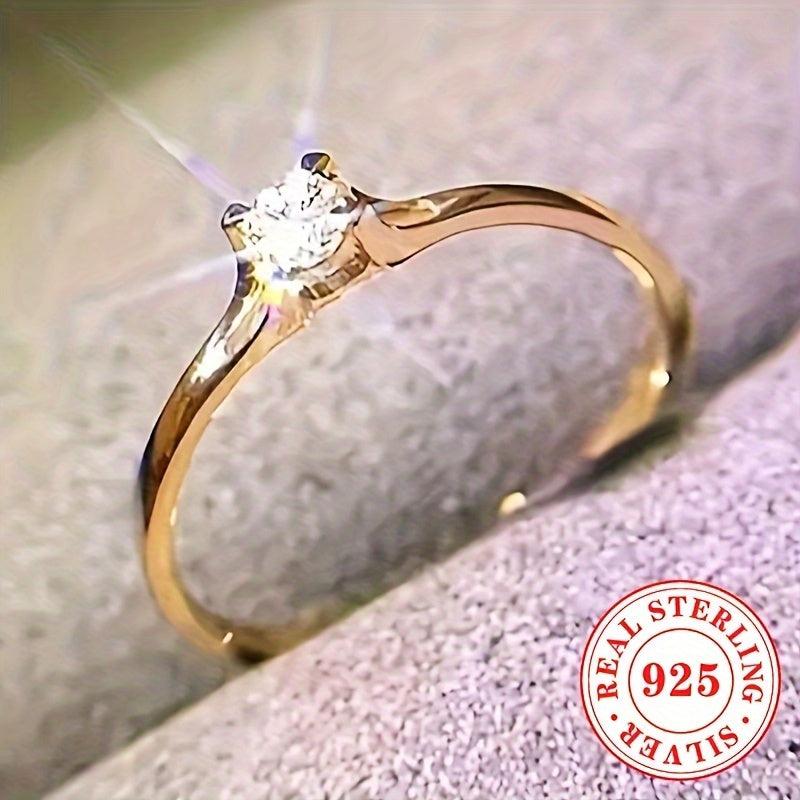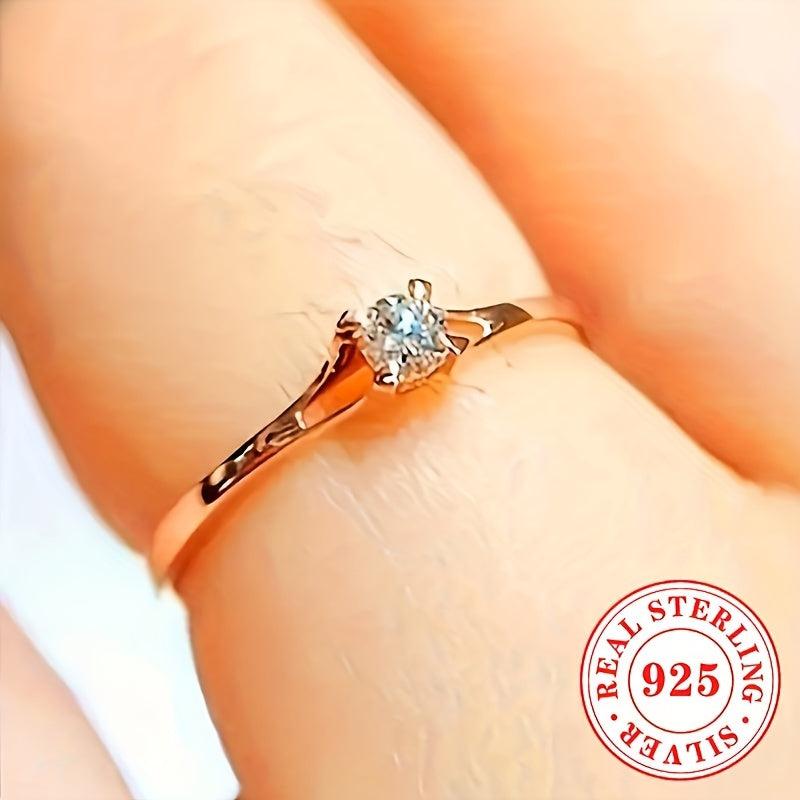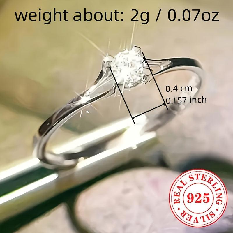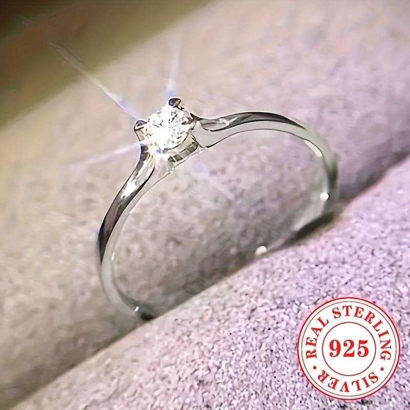 Stunning 925 sterling silver engagement ring featuring a round synthetic zirconia stone in a four-prong setting. Perfect for weddings and holiday celebrations.