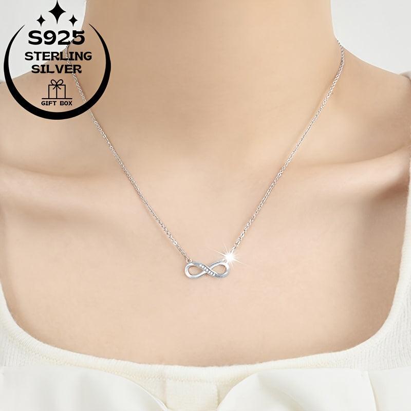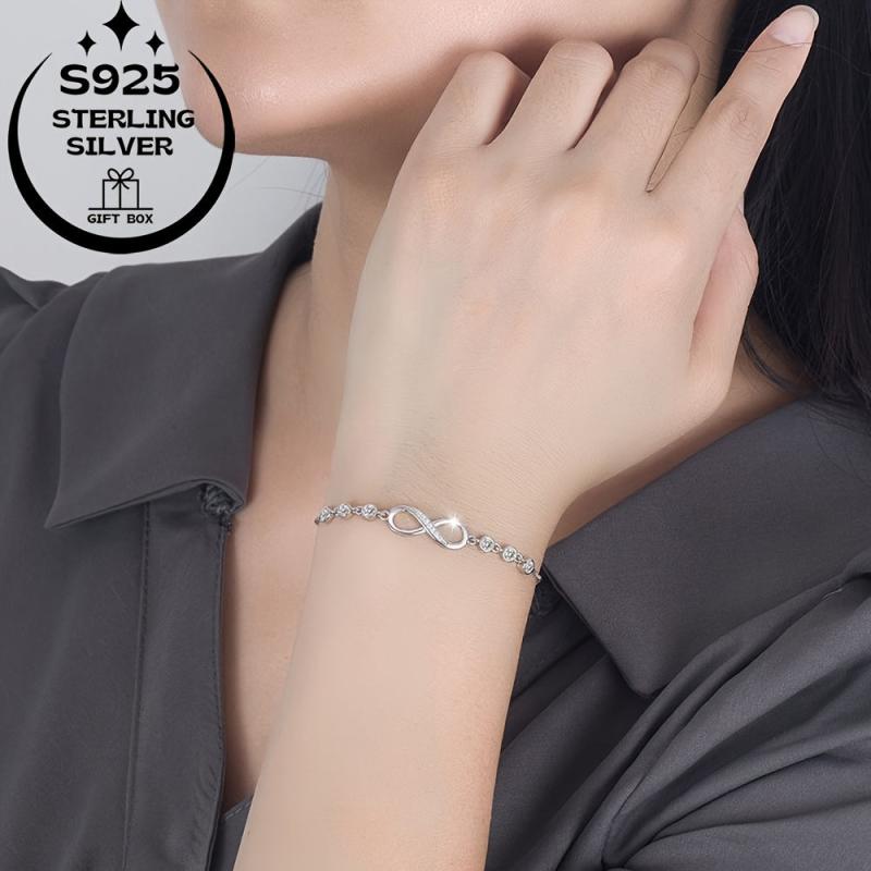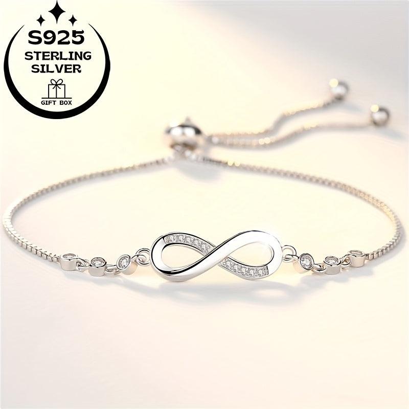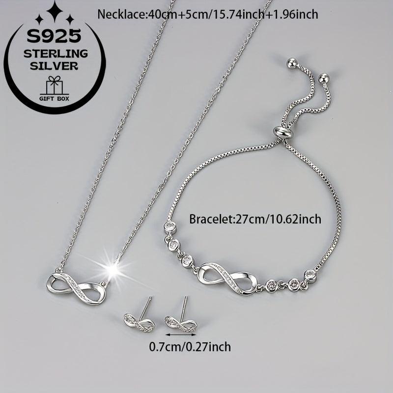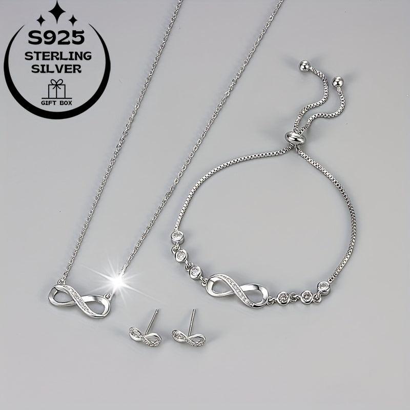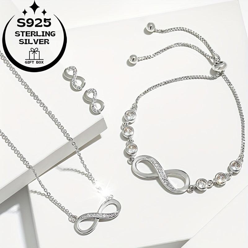 Elegant 925 Silver Jewelry Set featuring Infinity Loop design with Synthetic Zirconia. Set includes Necklace, Bracelet, and Earrings.