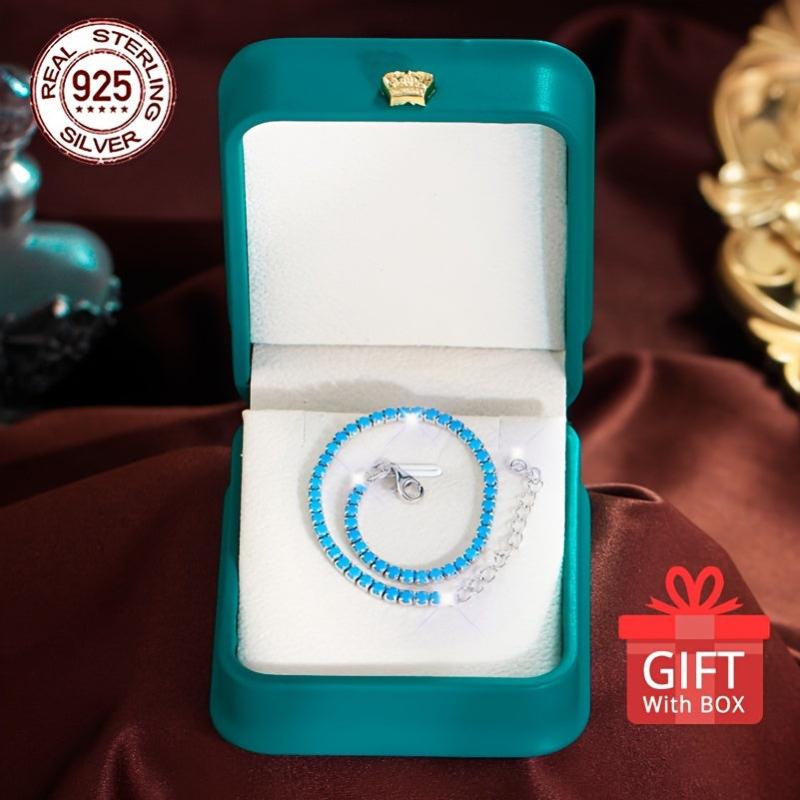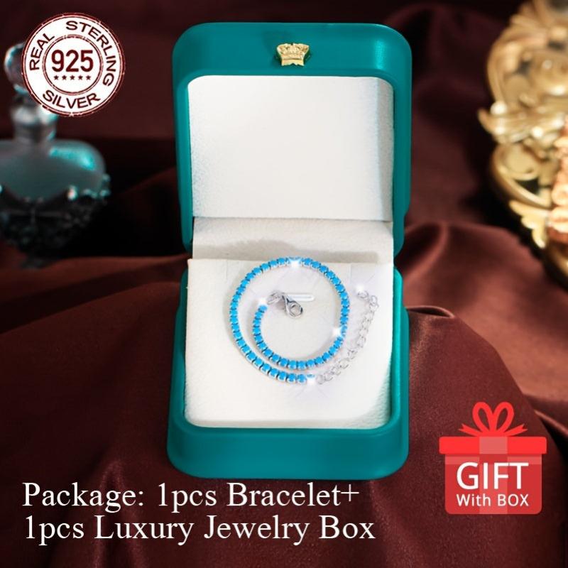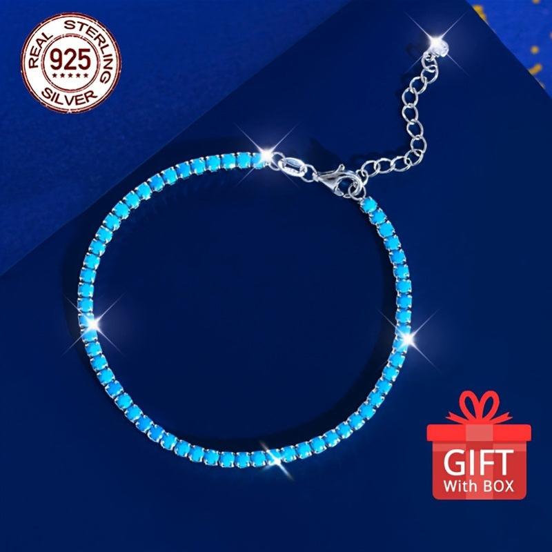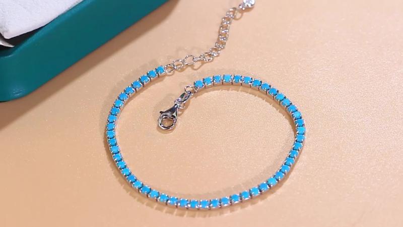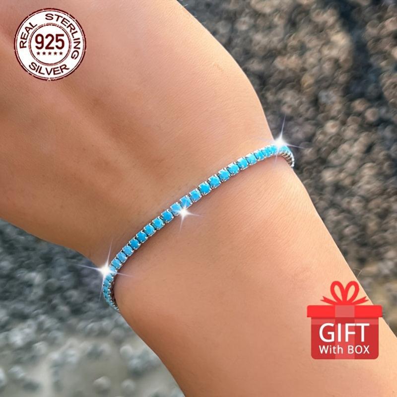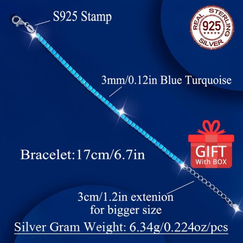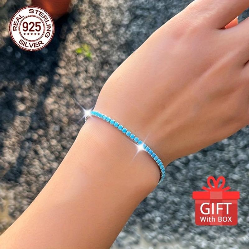 This stunning tennis bracelet is crafted from 925 sterling silver with synthetic turquoise stones. The length is adjustable for a perfect fit.