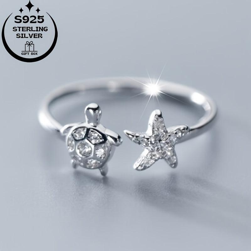 Elegant ocean-themed turtle ring made of 925 sterling silver featuring synthetic Zirconia stones. Comes in a beautiful box.