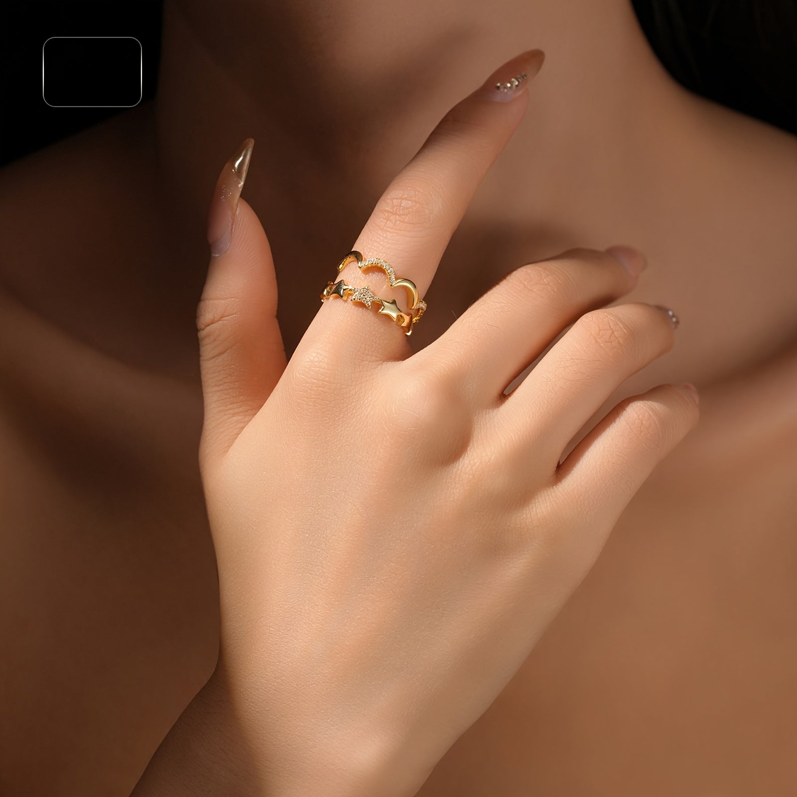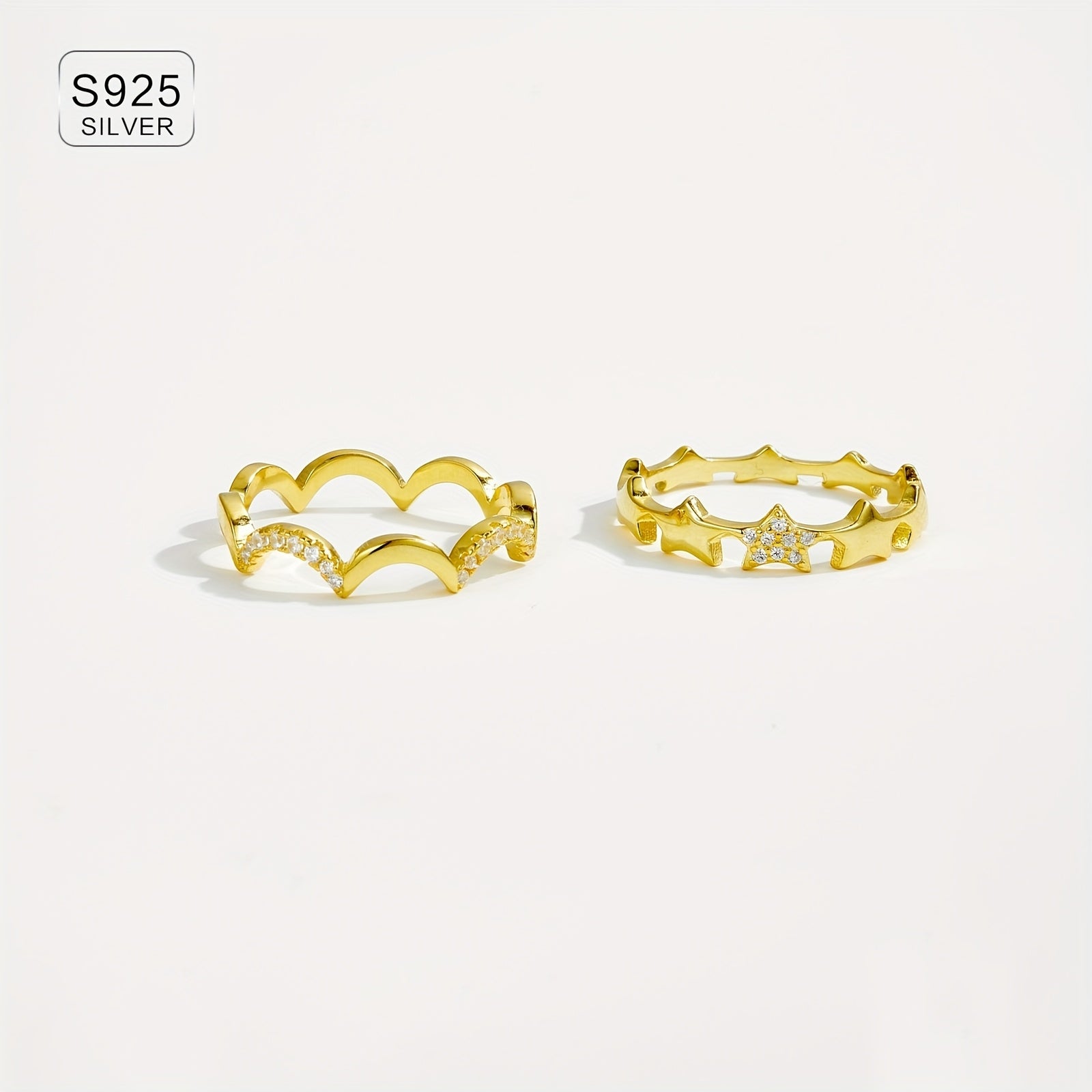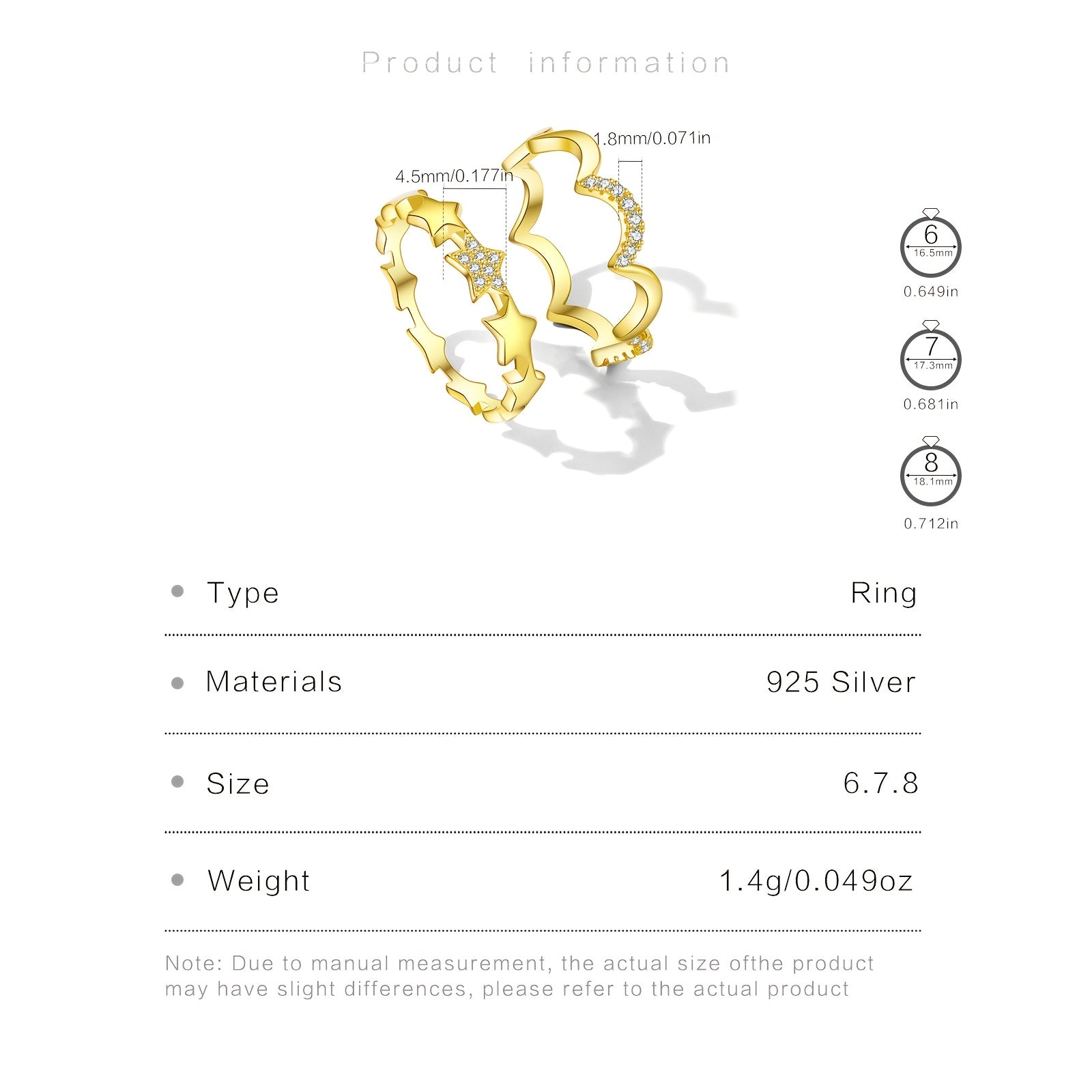 Add a touch of celestial charm with this stunning couple's ring. Crafted from 925 sterling silver and adorned with sparkling synthetic zirconia, this ring features a star and moon pattern with an 18k golden plated finish.