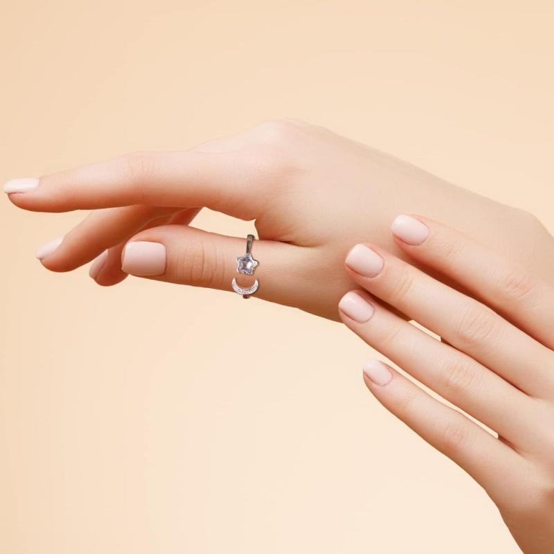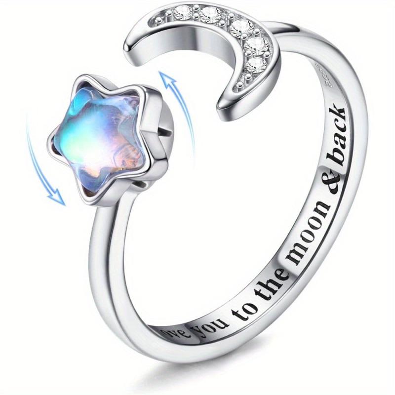 This stunning 925 sterling silver ring features an open adjustable design with moonstone, CZ, and star spinner elements. Perfect for anxiety relief and as a promise or wedding ring.