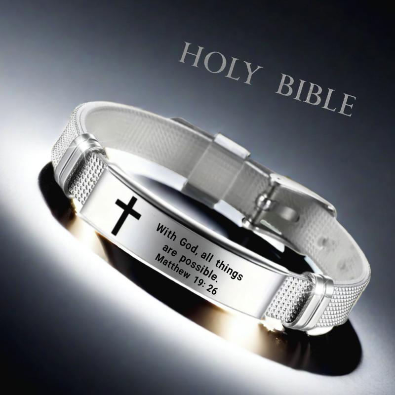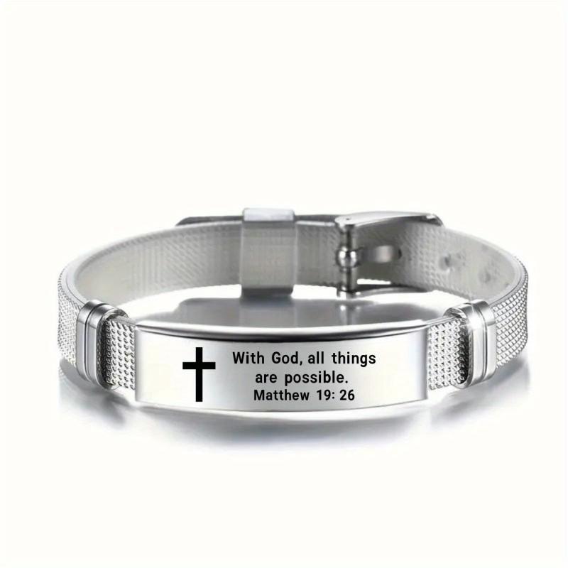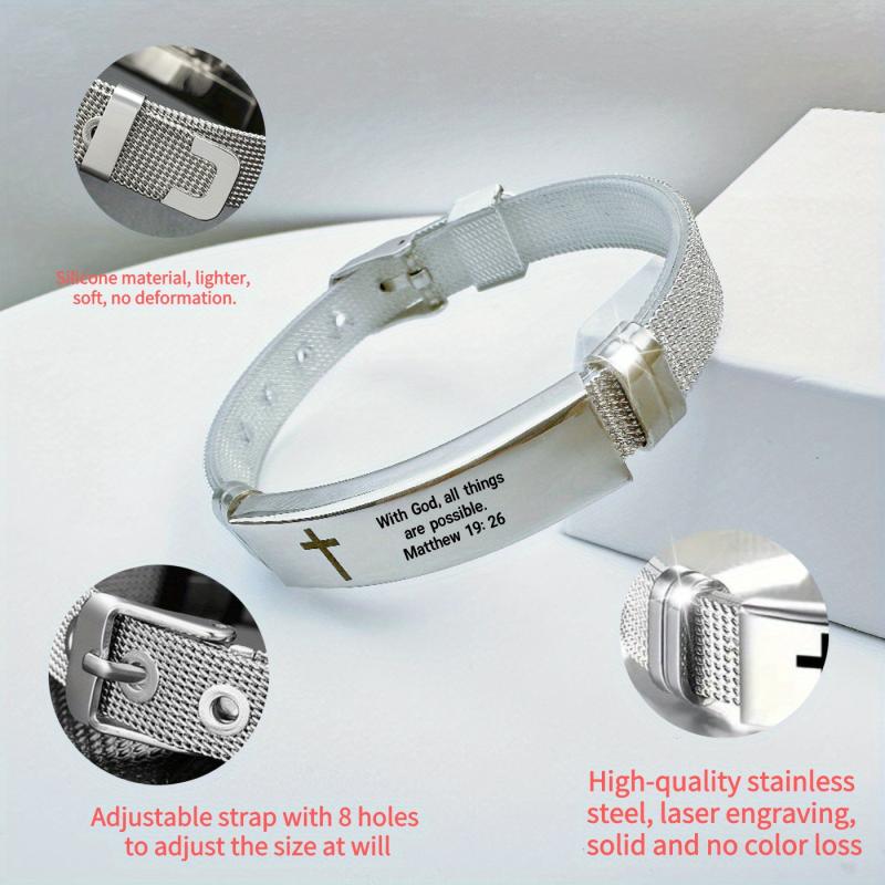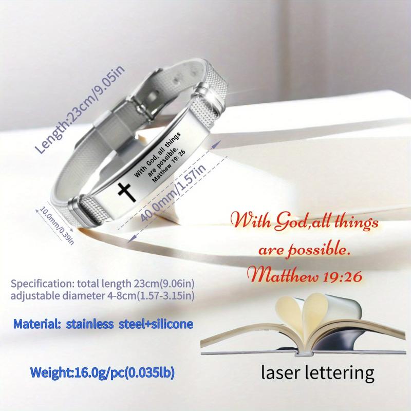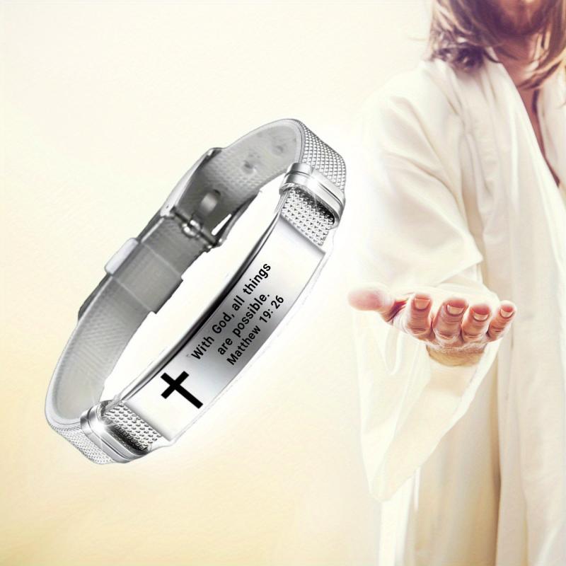 This adjustable bracelet features a Bible verse design, combining stainless steel and silicone materials. It makes a perfect Christian gift for any occasion.