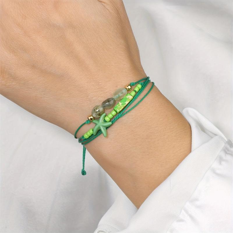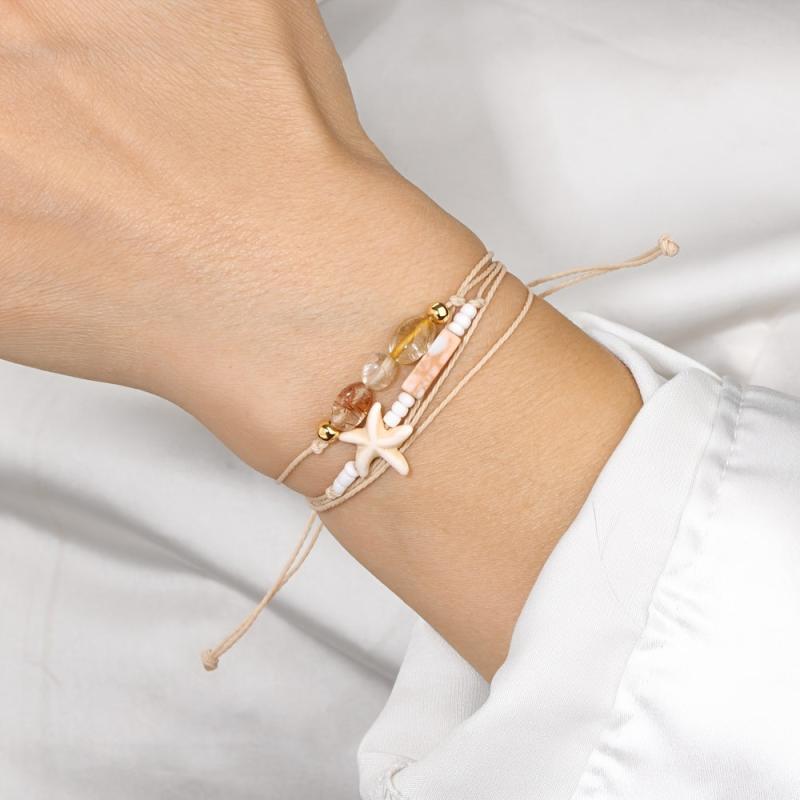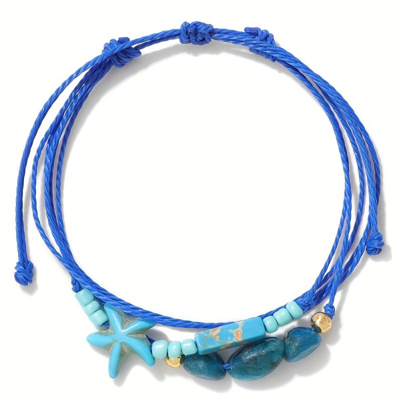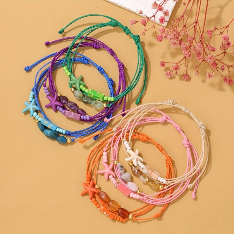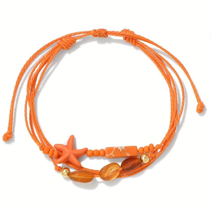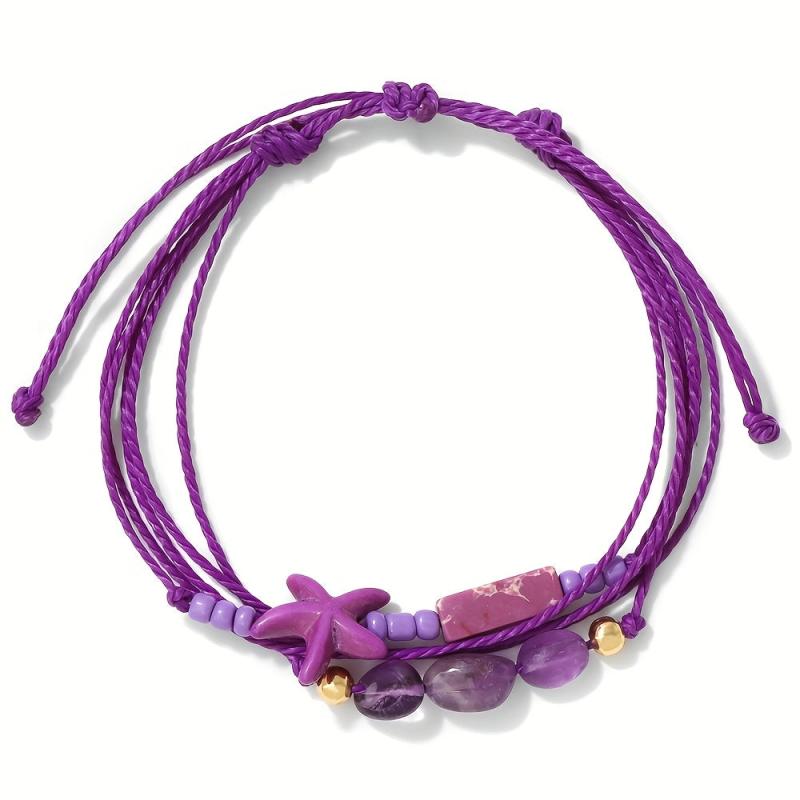 Elevate your everyday accessory game with this colorful braided bracelet featuring a starfish charm and natural stones. Perfect for layering with vibrant beads and charming accents, this bracelet is a casual must-have.