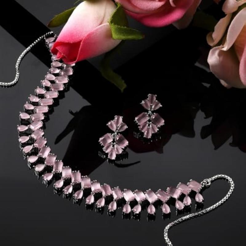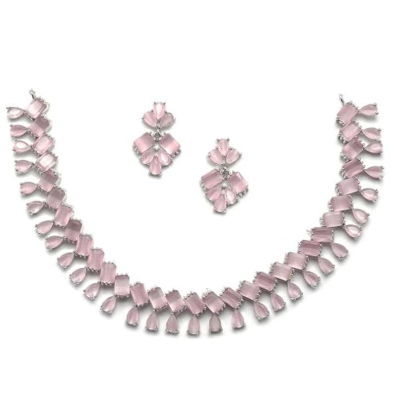 Stylish rhodium-plated silver toned pear-shaped necklace set with shimmering American diamonds. Includes matching earrings for a complete look.