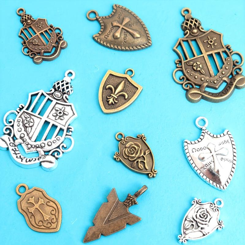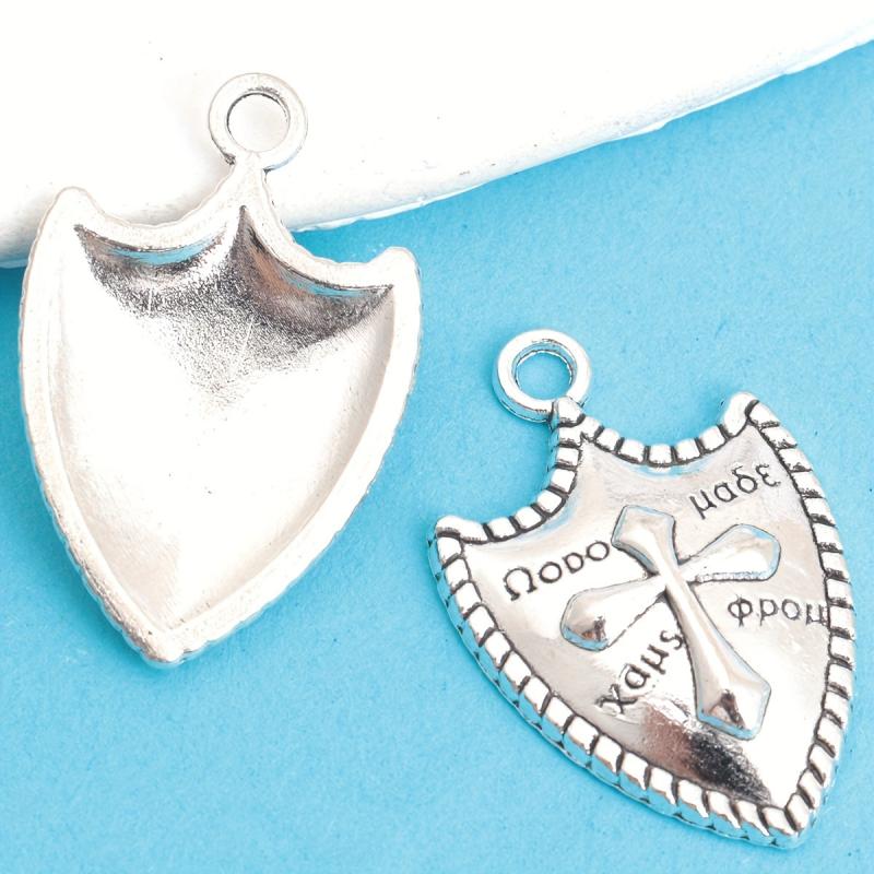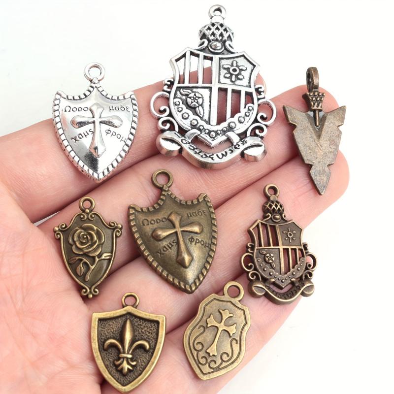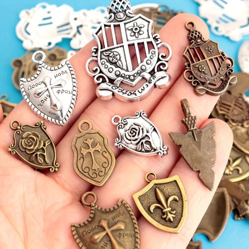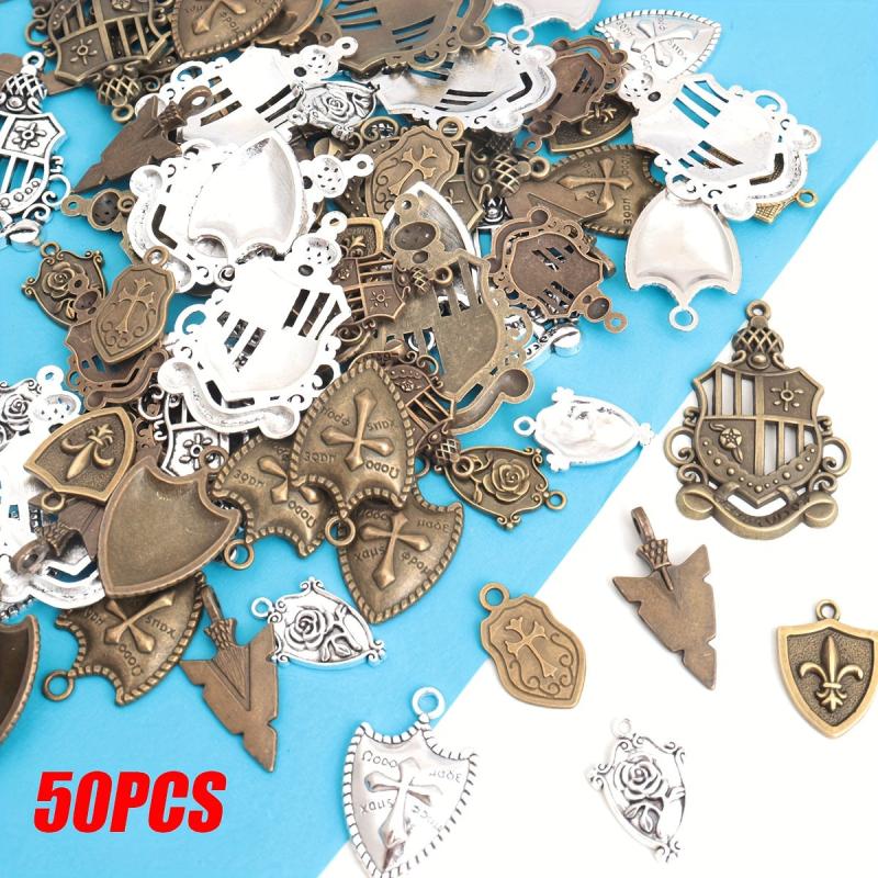 Get a set of 50 antique silver plated pendants featuring geometric patterns, punk armor, warrior shield charms. Perfect for creating stylish necklaces and bracelets for men.