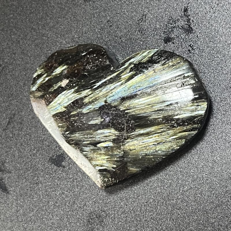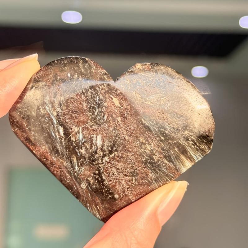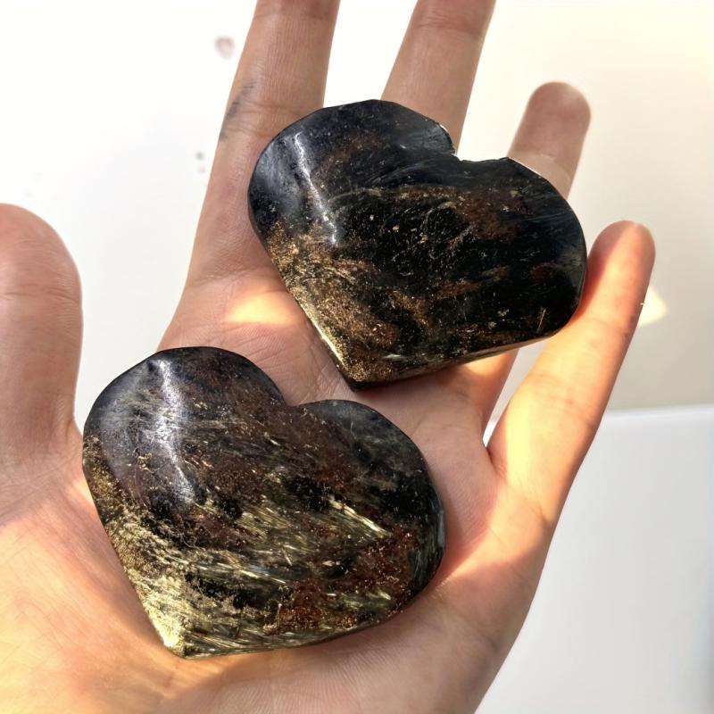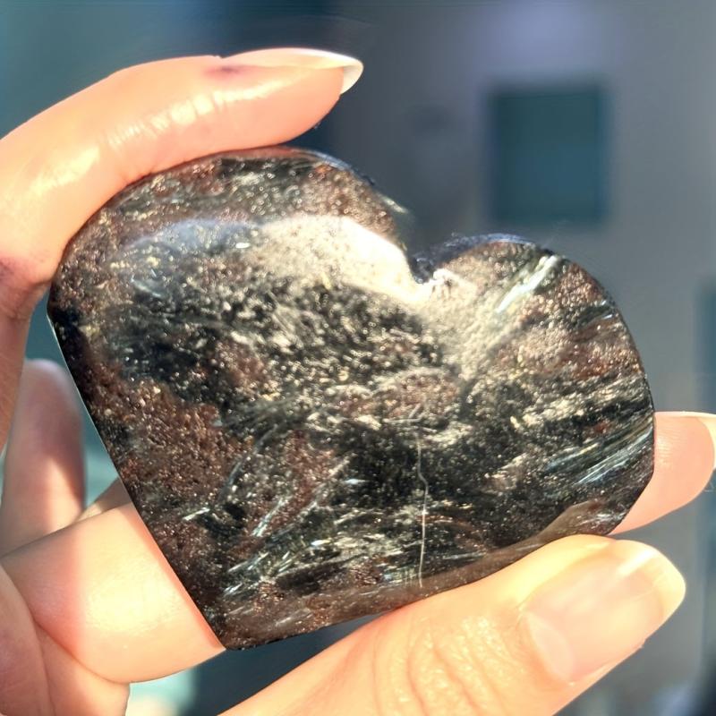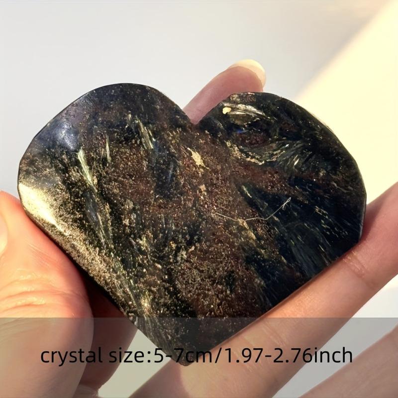 This beautiful heart-shaped Astrophyllite Garnet stone features a yellow flash, making it perfect for jewelry making, beading, desk decor, and as a holiday gift for Valentine's Day or St. Patrick's Day.