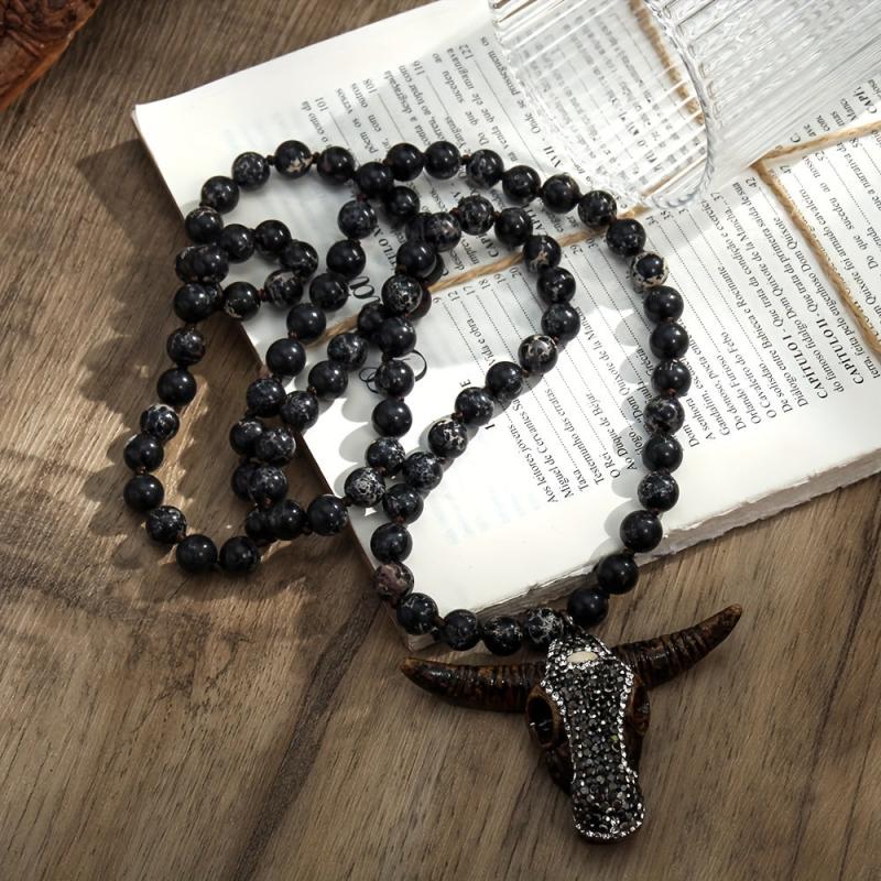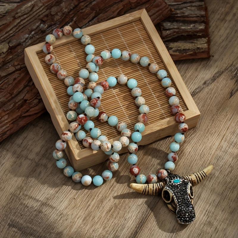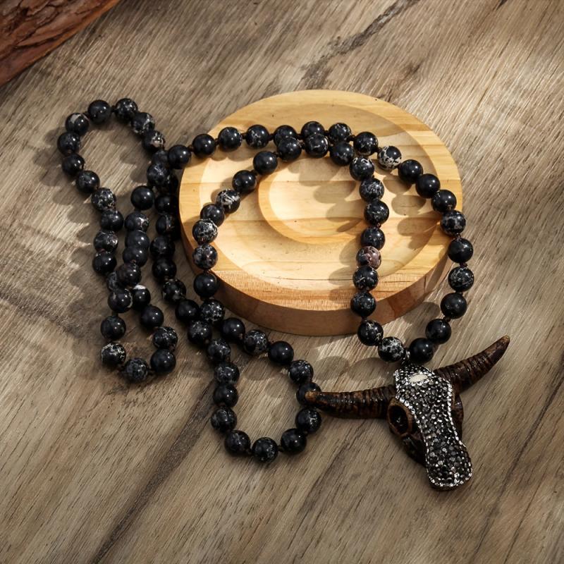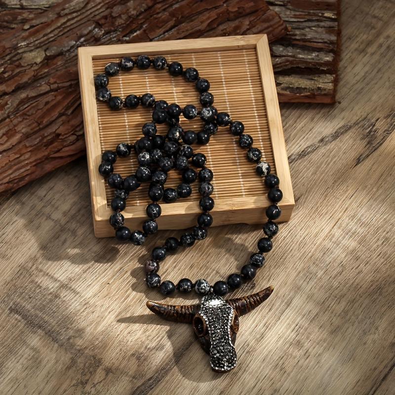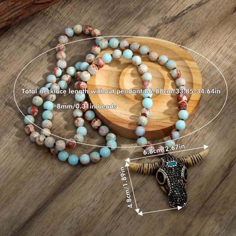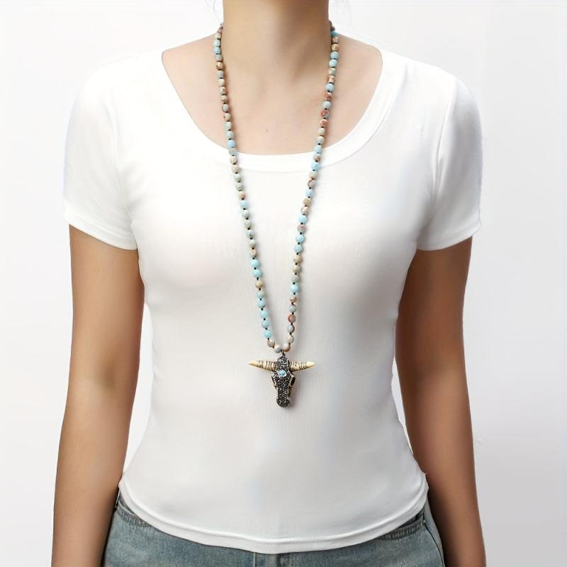 Elevate your style with this bohemian tribal jewelry featuring a rhinestone ox head pendant on a colored beaded chain. Perfect for spring and summer.