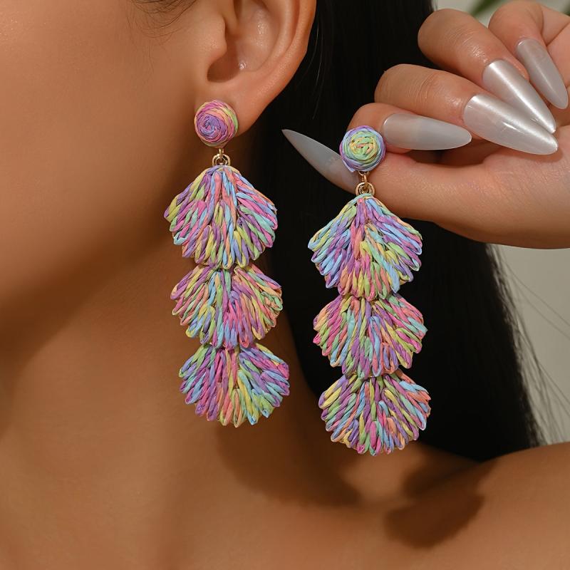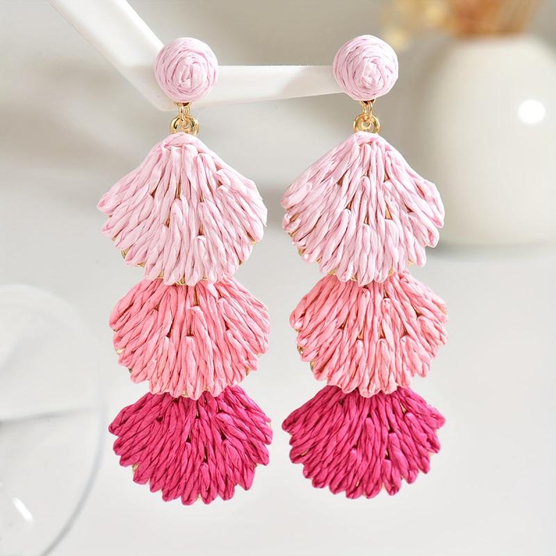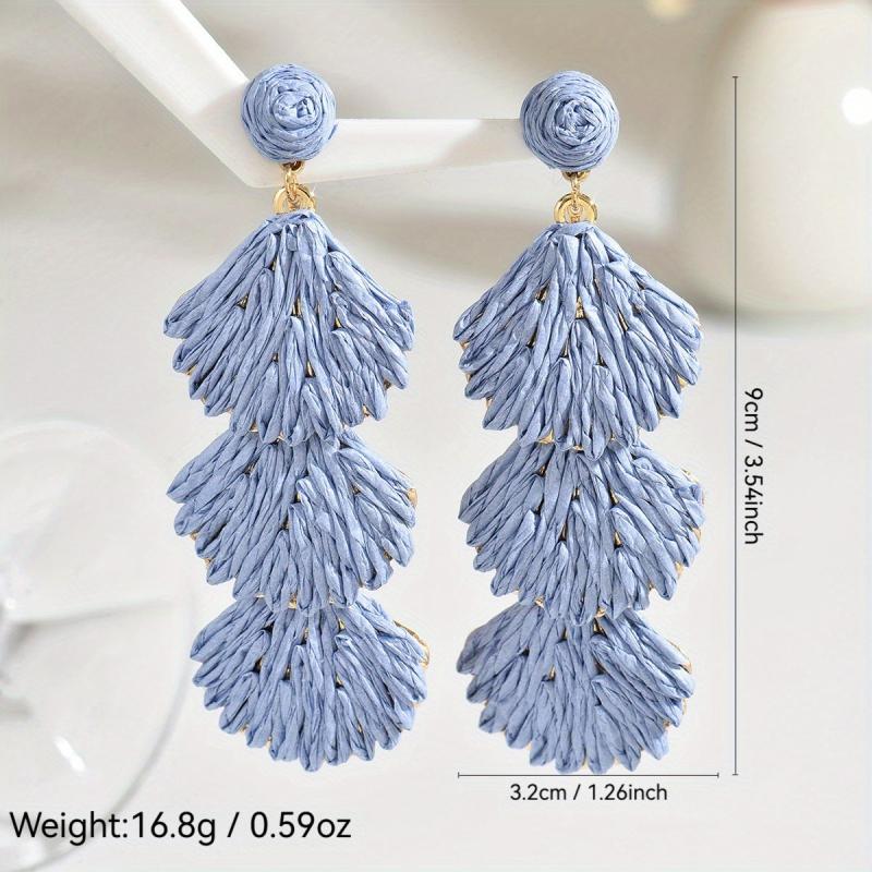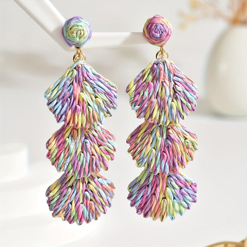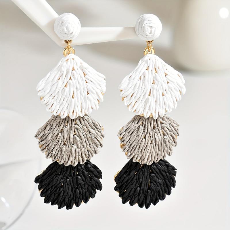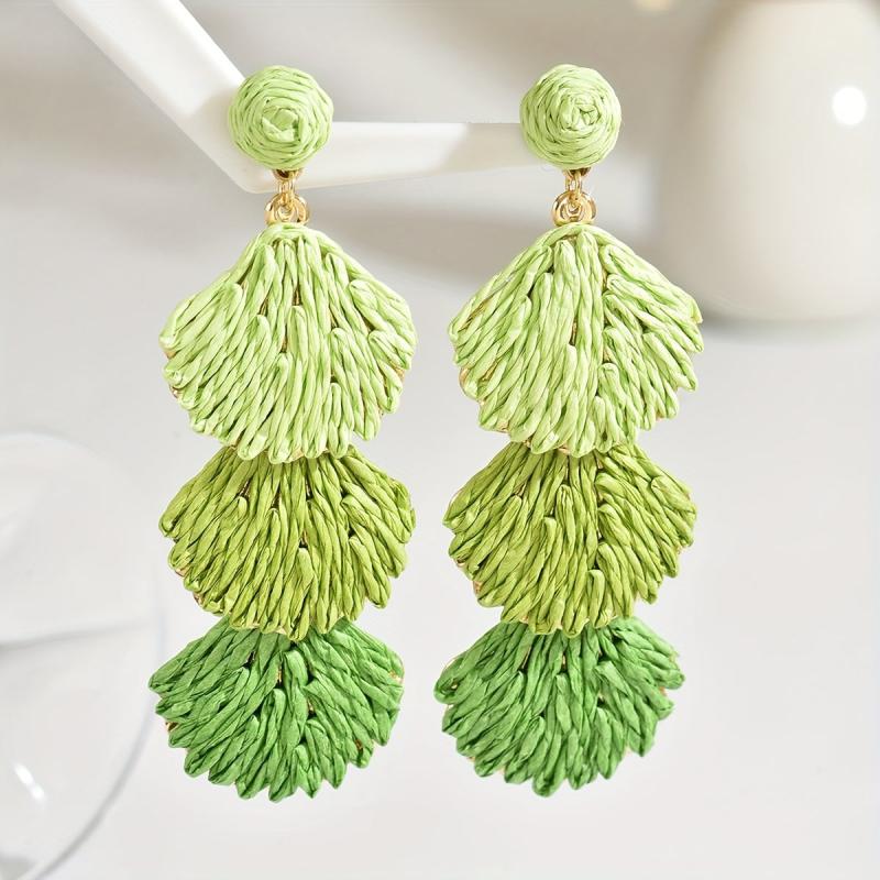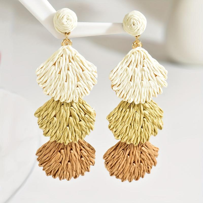 Elevate your vacation look with these handwoven raffia earrings featuring a mix of shells. Perfect for a beach getaway or summer outing.