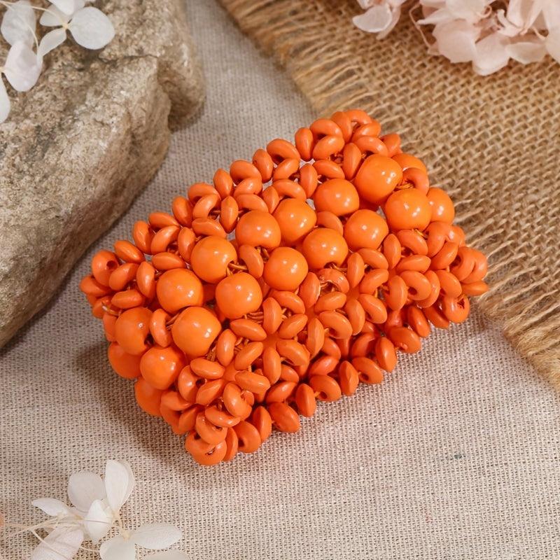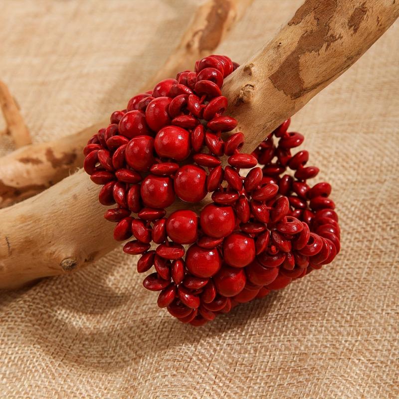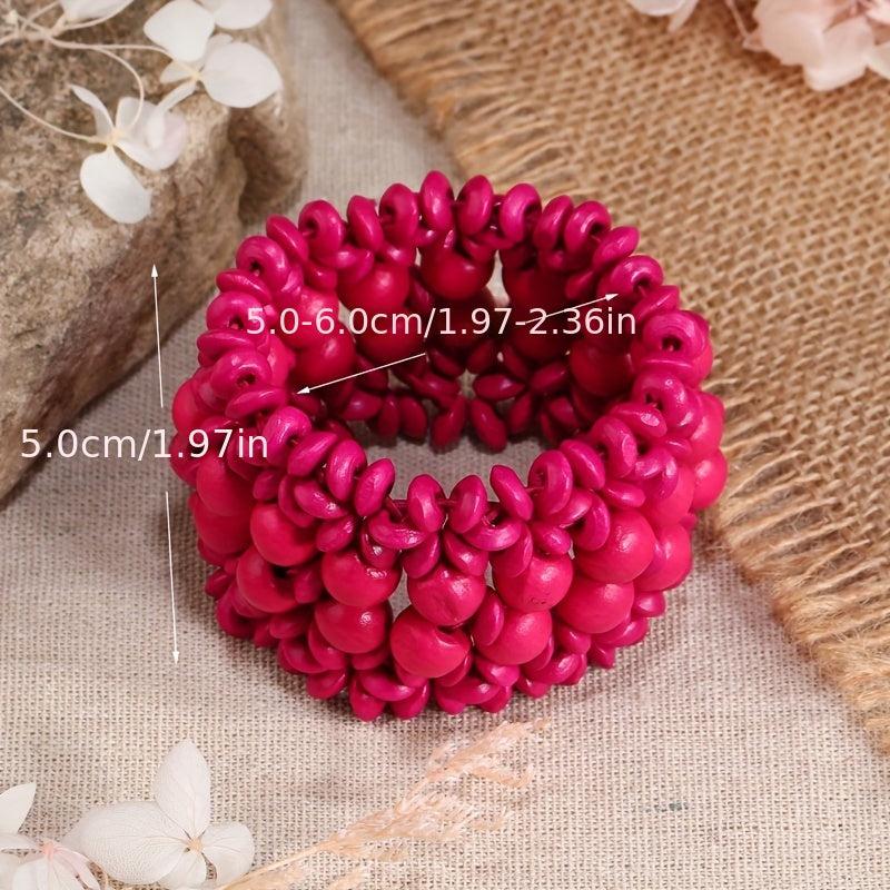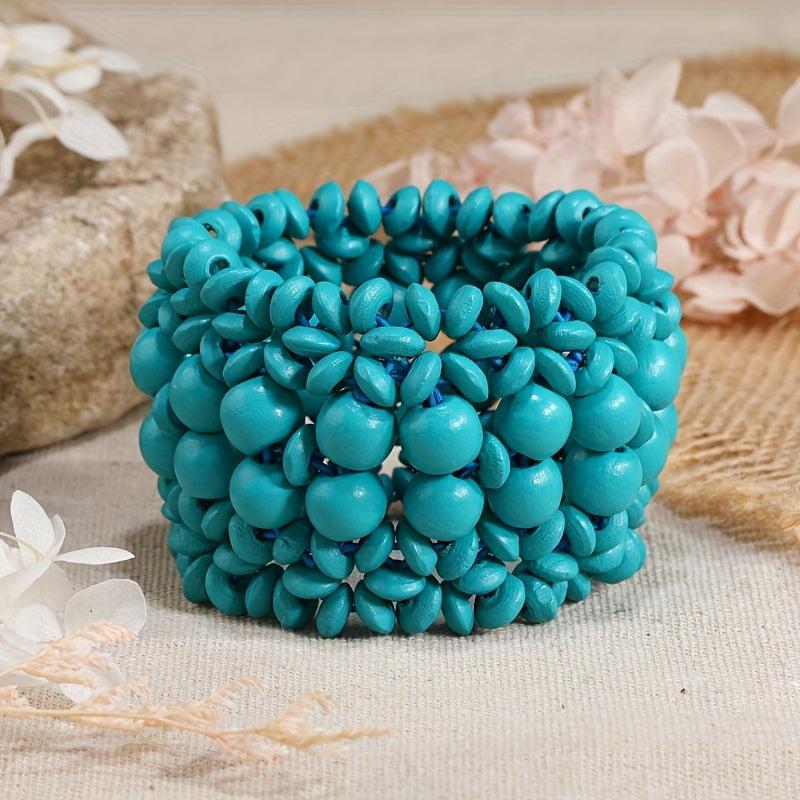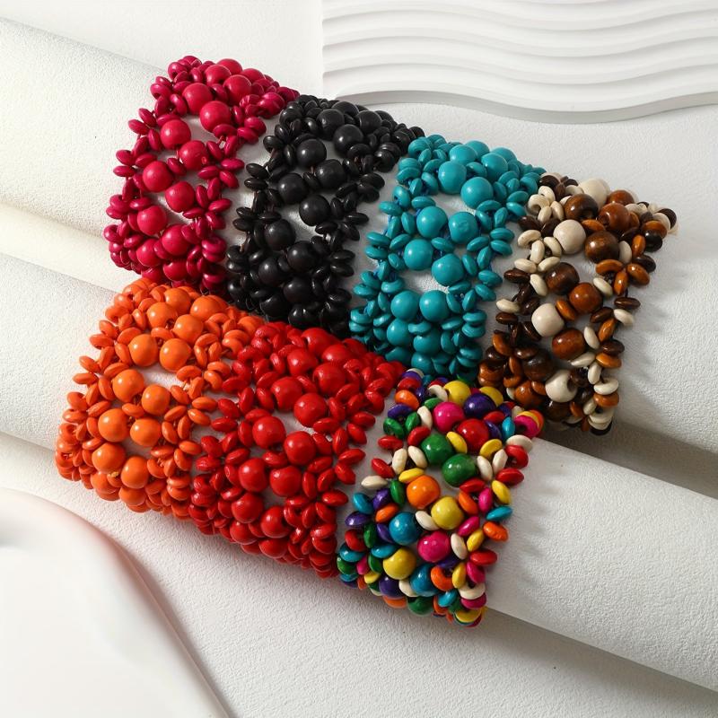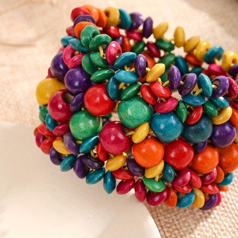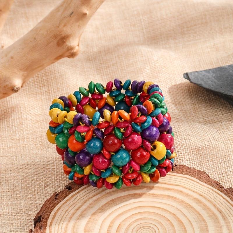This bohemian beaded bracelet features an elastic design with wood beads and multicolor beadwork for a stylish and colorful look.