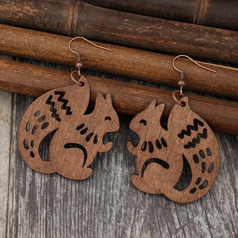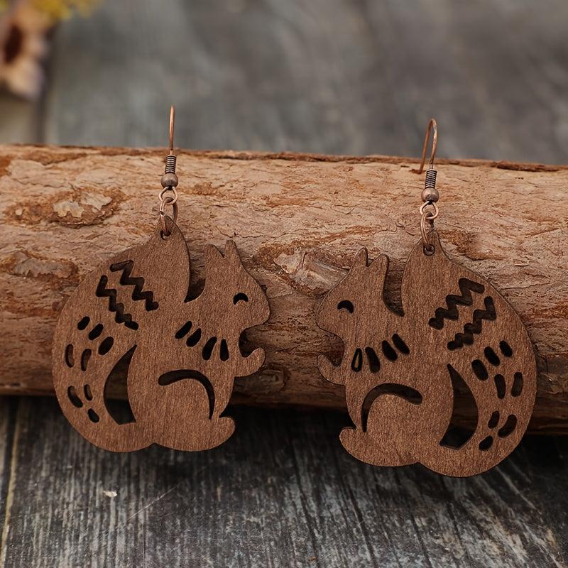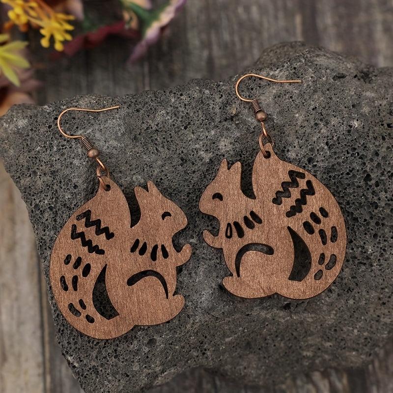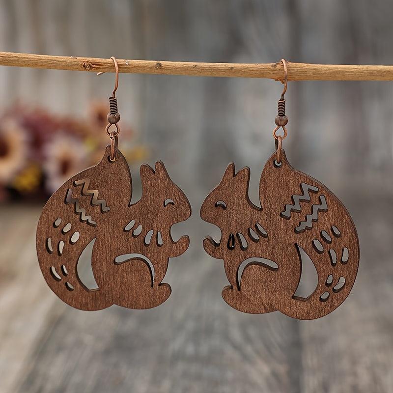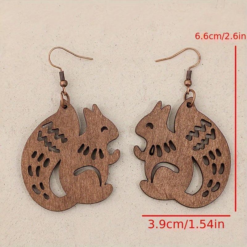 Handcrafted from wood with deep brown finish, these lightweight dangle earrings feature a retro squirrel design. Perfect for nature lovers!