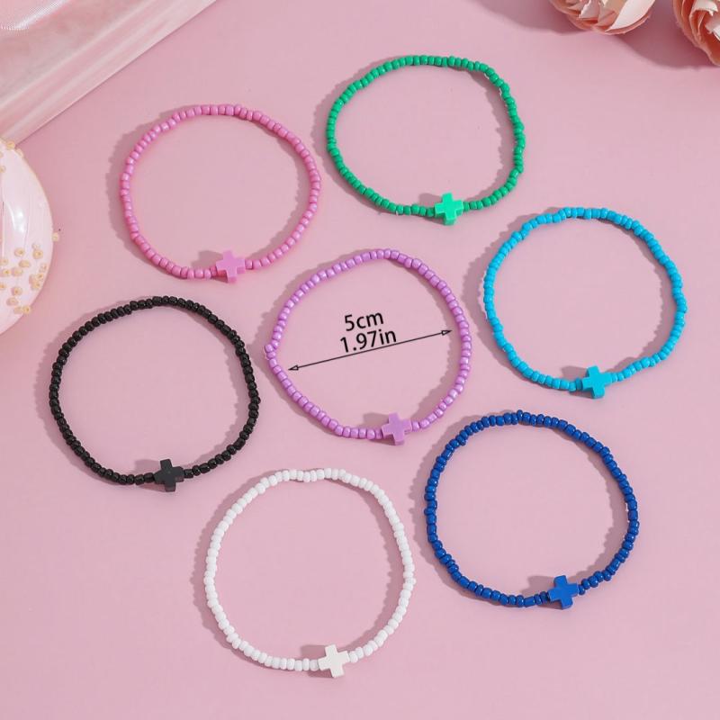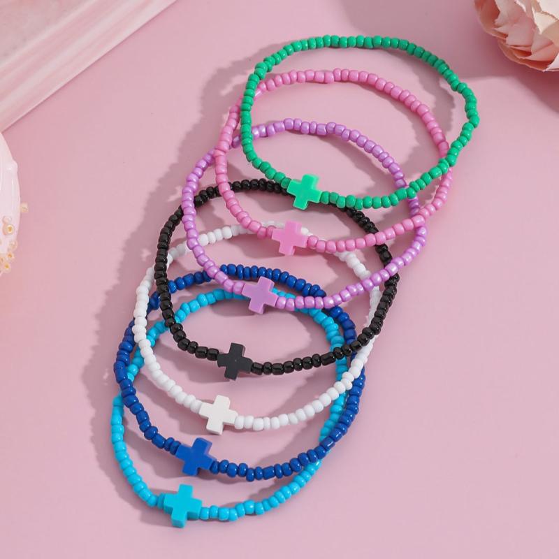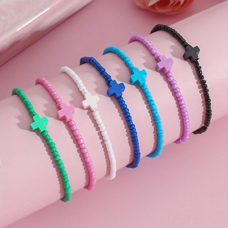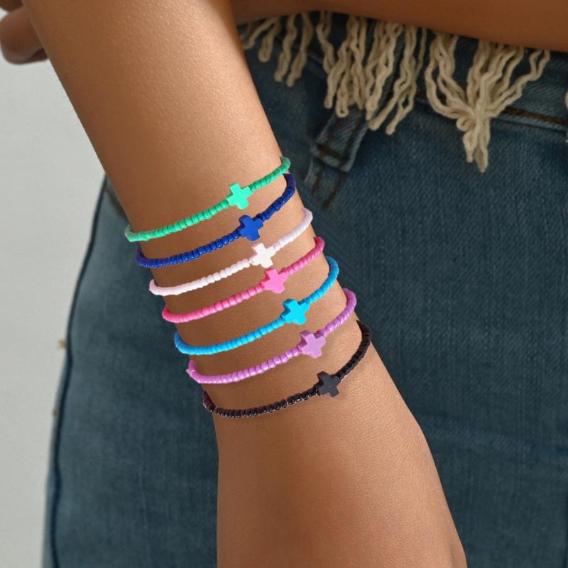 Add a pop of color to your outfit with this set of 7 bohemian cross woven bead stacking bracelets. Ideal for daily wear and vacations.