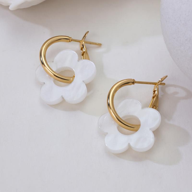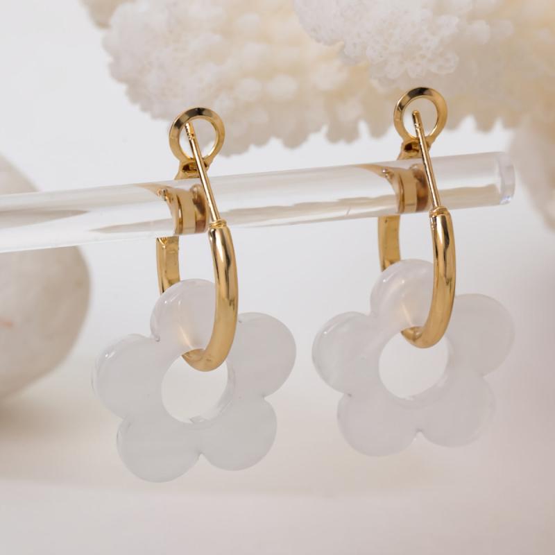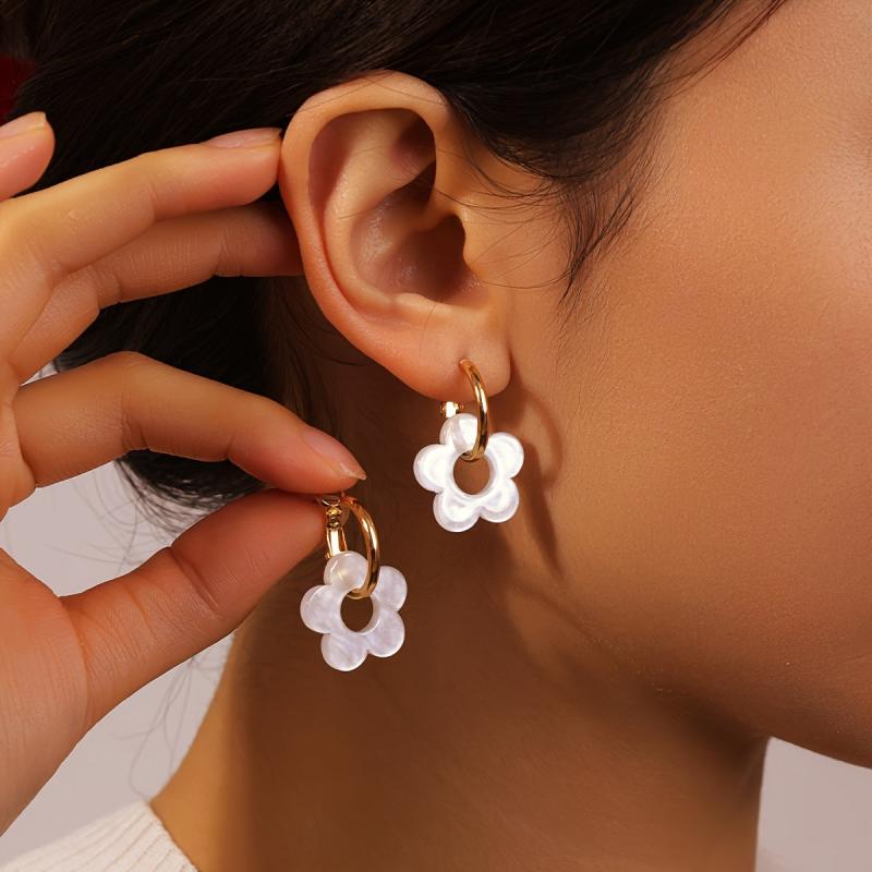 These Bohemian floral acrylic dangle earrings feature a five-petal design with golden tone hooks. Perfect for year-round wear, these earrings make a great everyday jewelry gift.