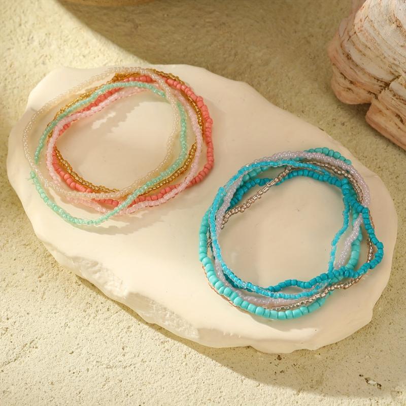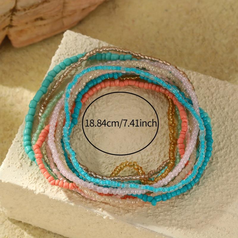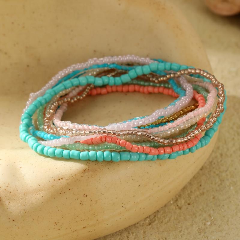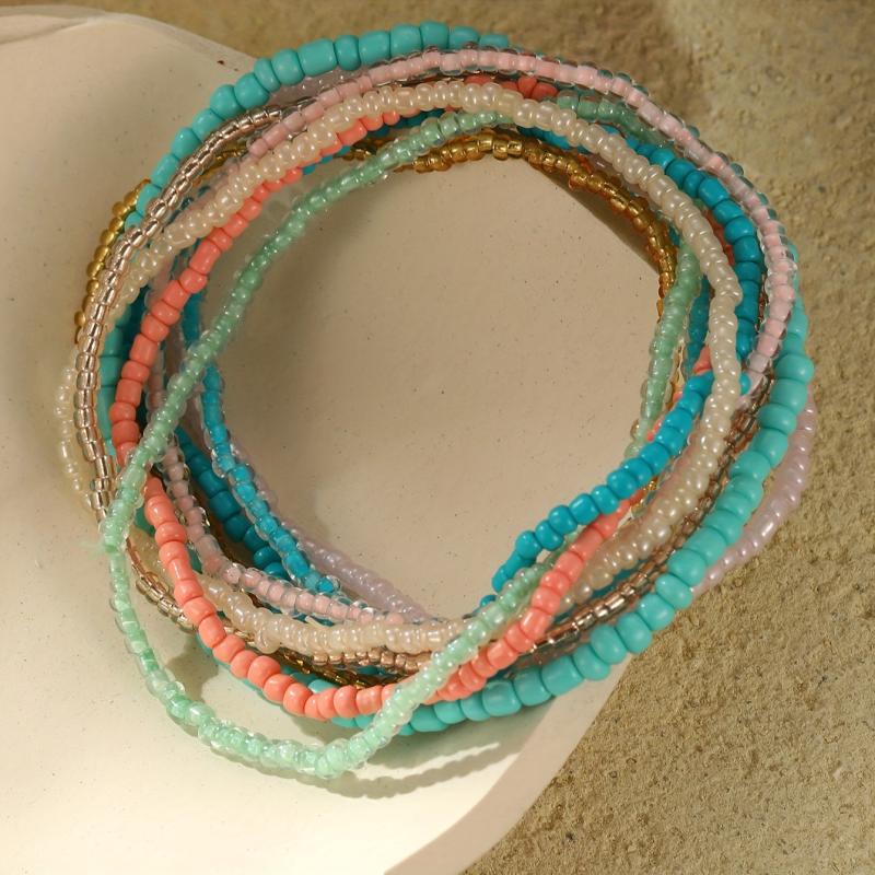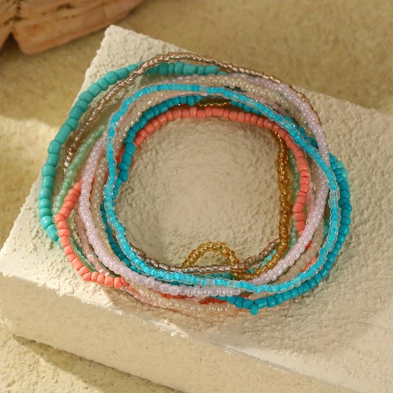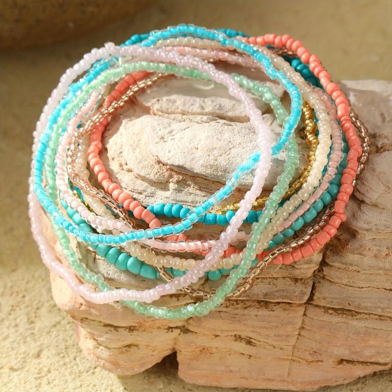 Elevate your style with this set of 10 colorful glass bead bracelets, perfect for adding a bohemian touch to your outfit.