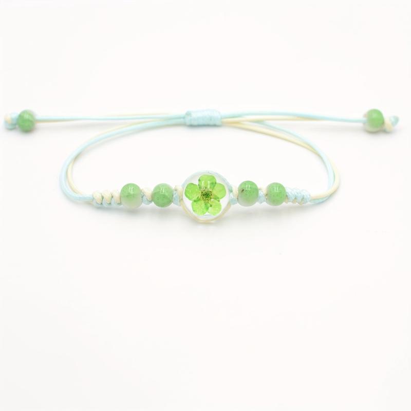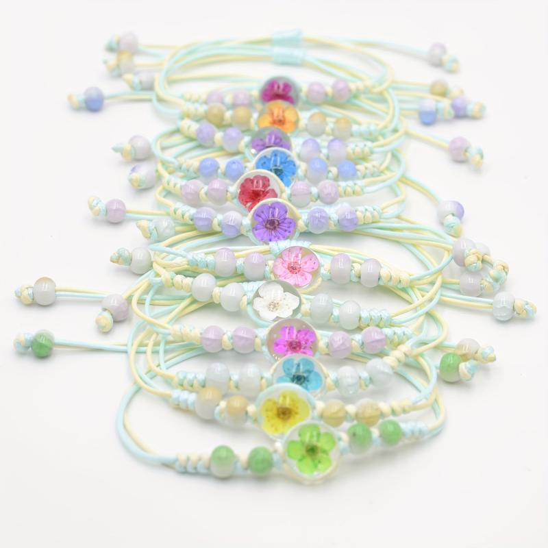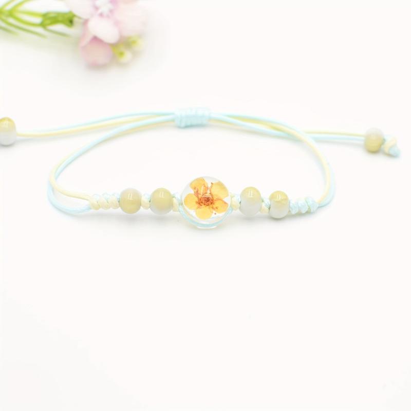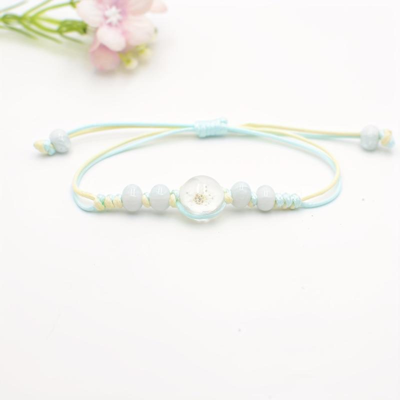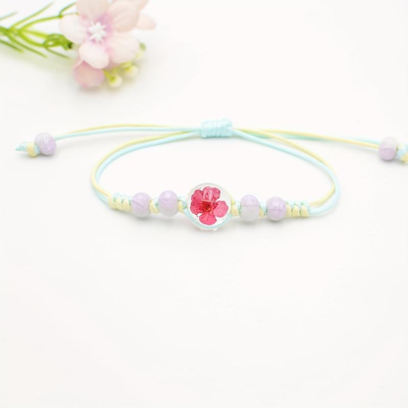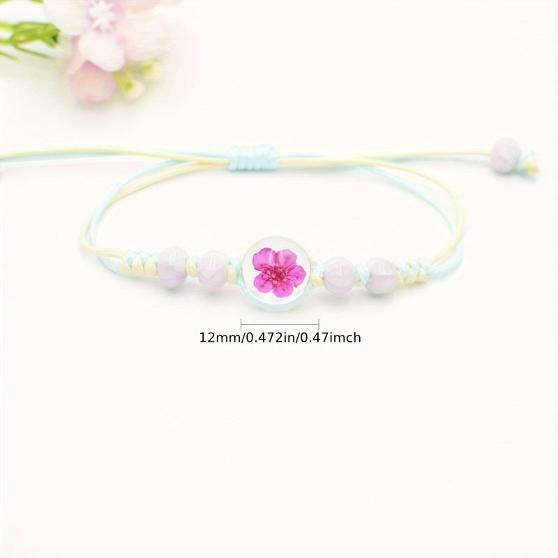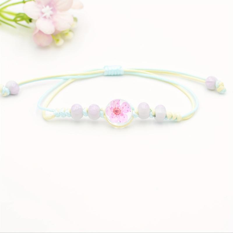 This bracelet features real preserved cherry blossoms, pastel colorful glass beads, and natural wood accents. Perfect for everyday wear, this jewelry piece is durable and stylish.