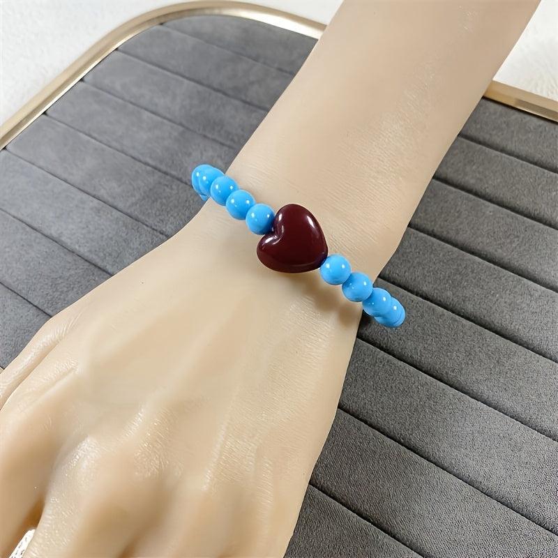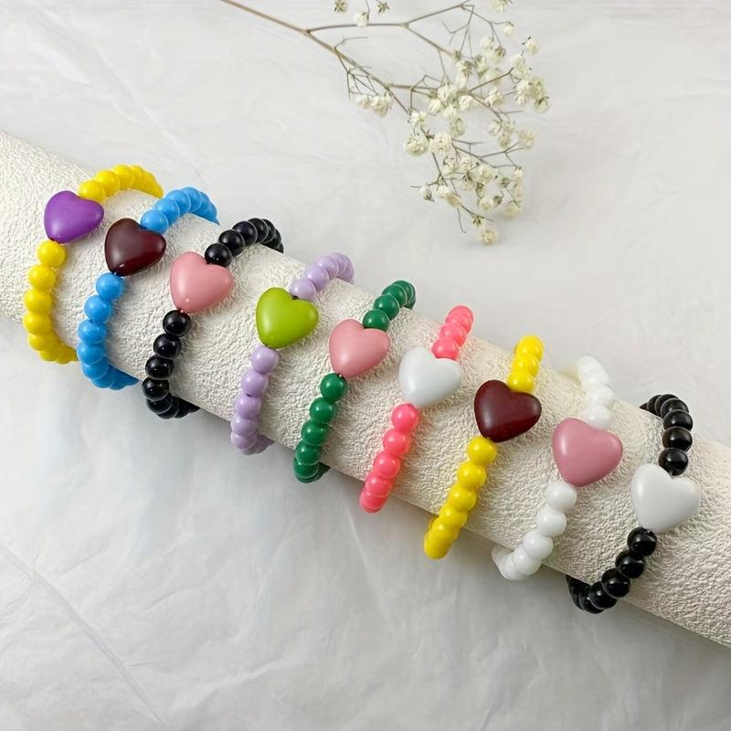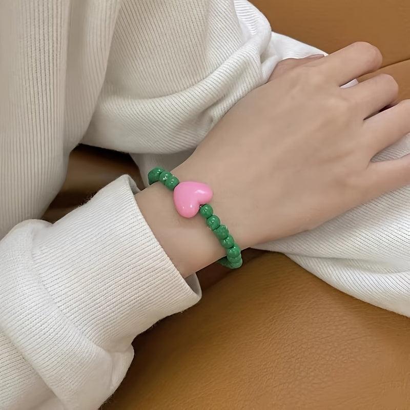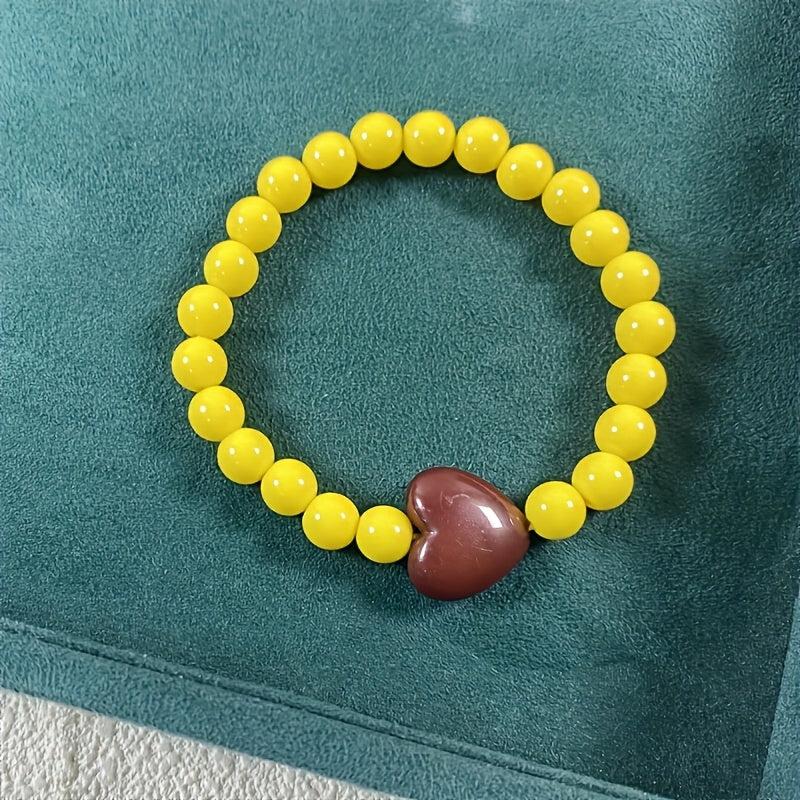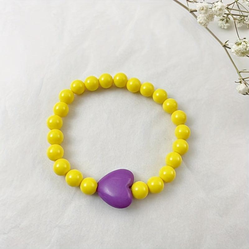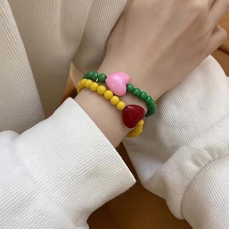 Add a pop of color to your casual attire with this lightweight stretch bracelet featuring pink, yellow, green, and red charms. The heart-shaped design adds a touch of romance to your look.
