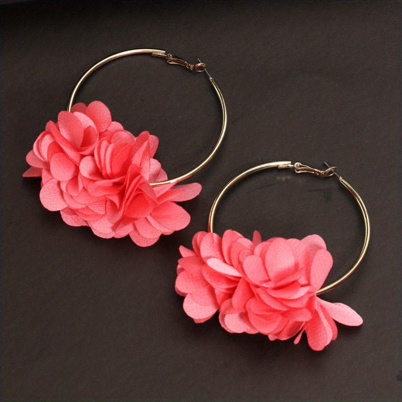 These unique hoop earrings feature fabric flowers for a bohemian look. They make a perfect gift for any female, and are ideal for weddings and special occasions.