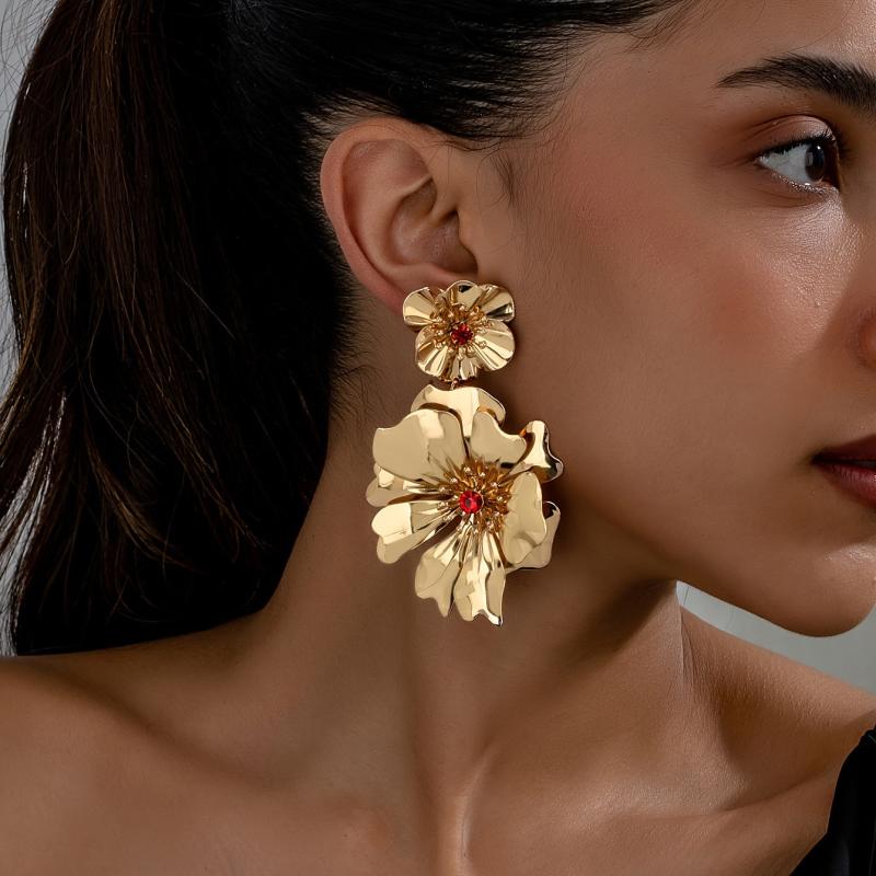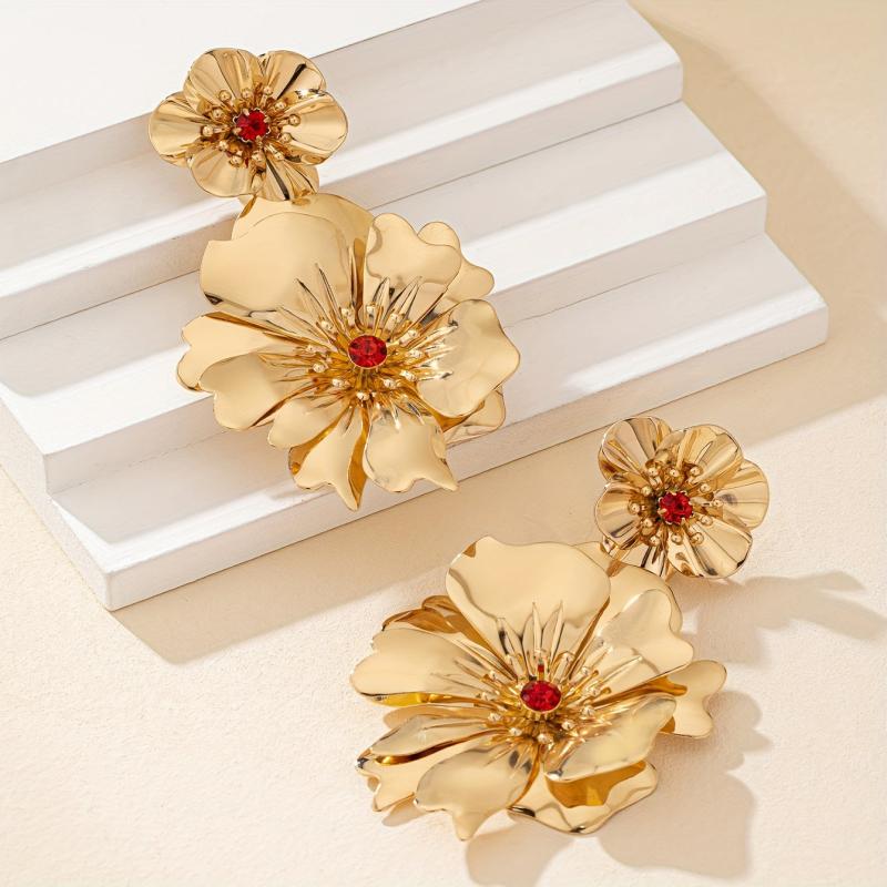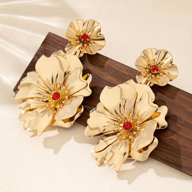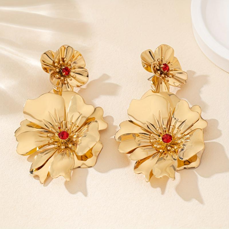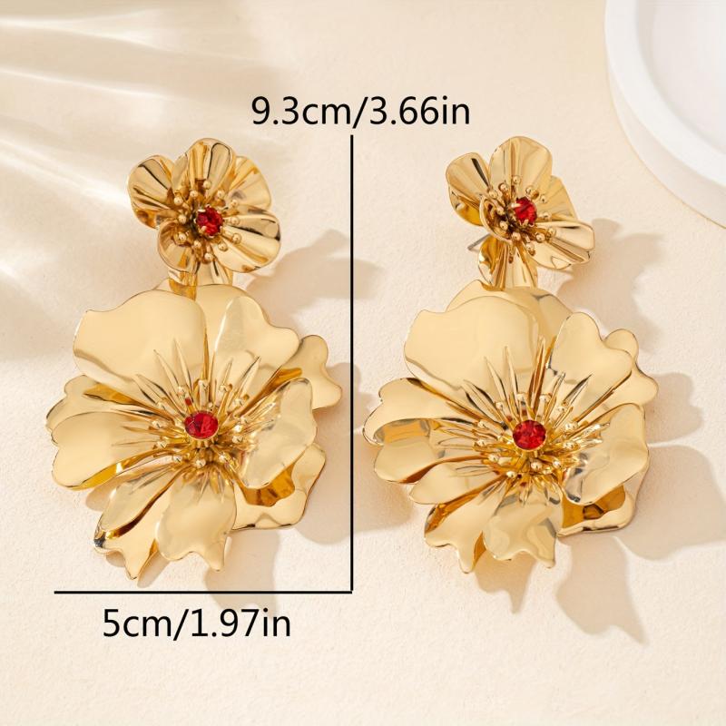 Make a statement with these stunning and extravagant leaf-shaped Bohemian style flower earrings, adorned with red gemstones. Perfect for women's parties, nightclubs, and fashion.
