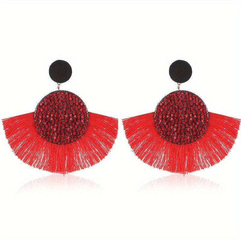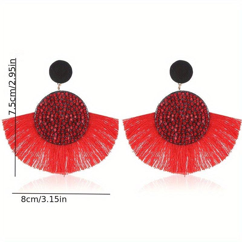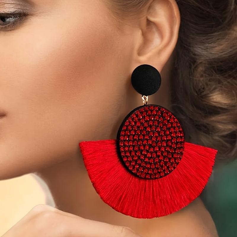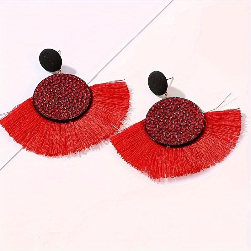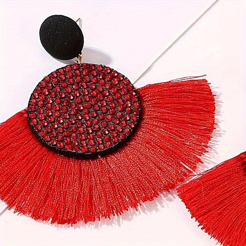These retro bohemian style earrings feature a fan shape design with full red rhinestone inlay and dangling tassels. Perfect holiday ear ornaments.