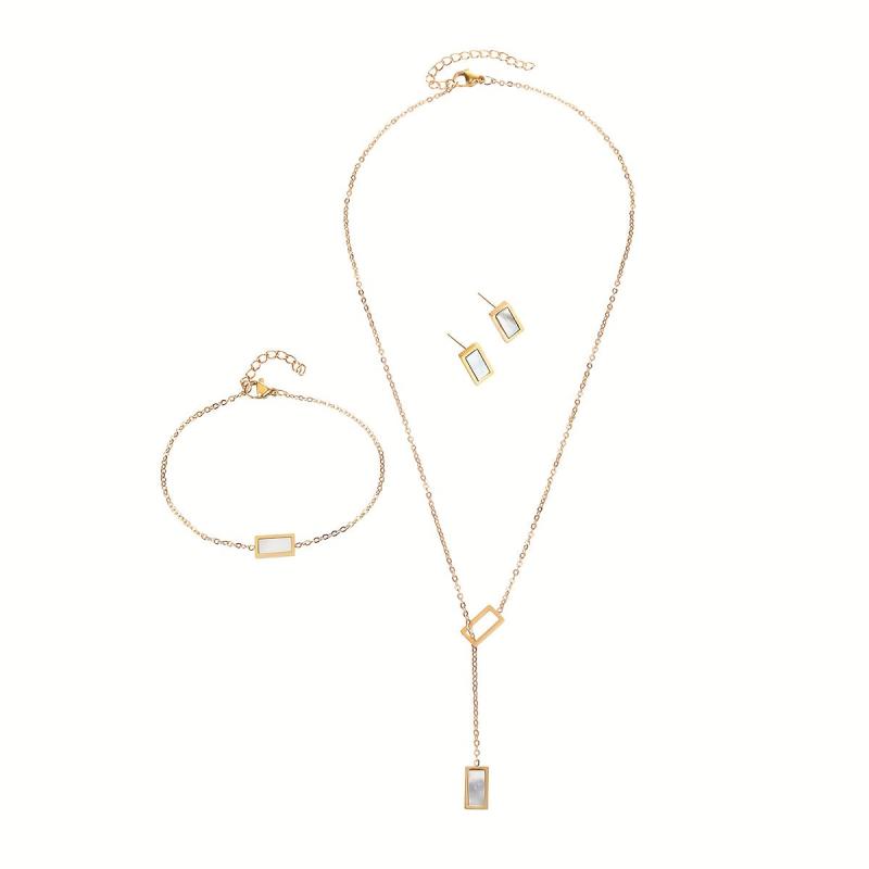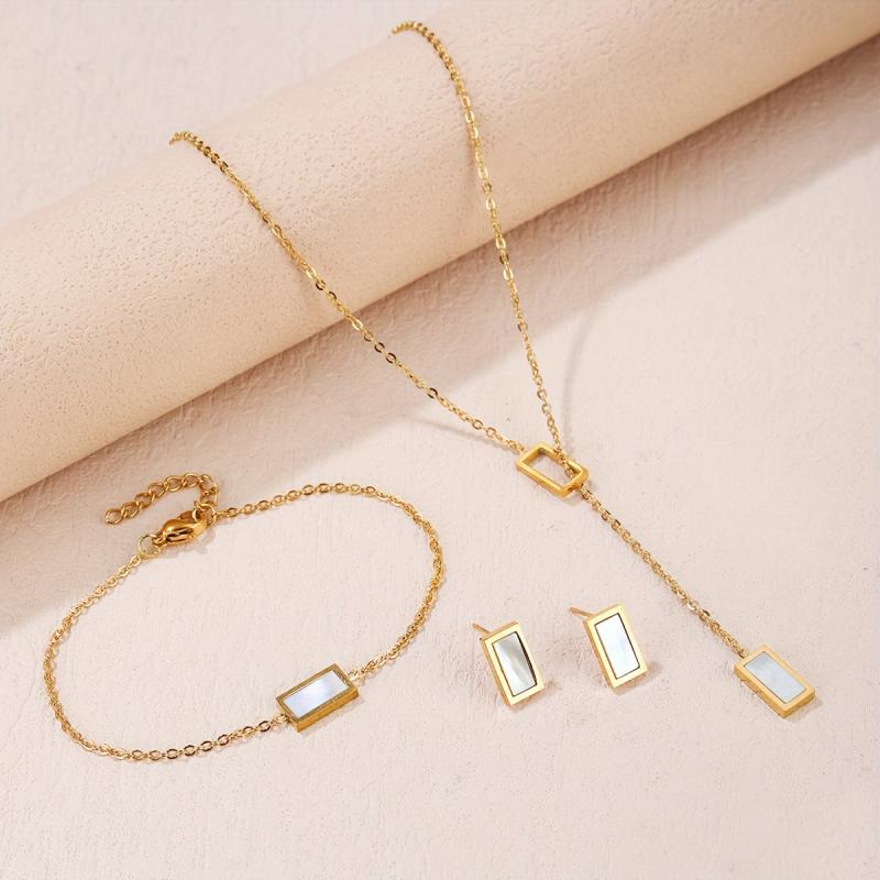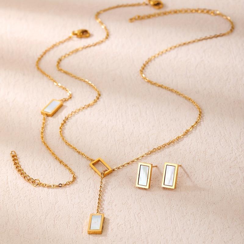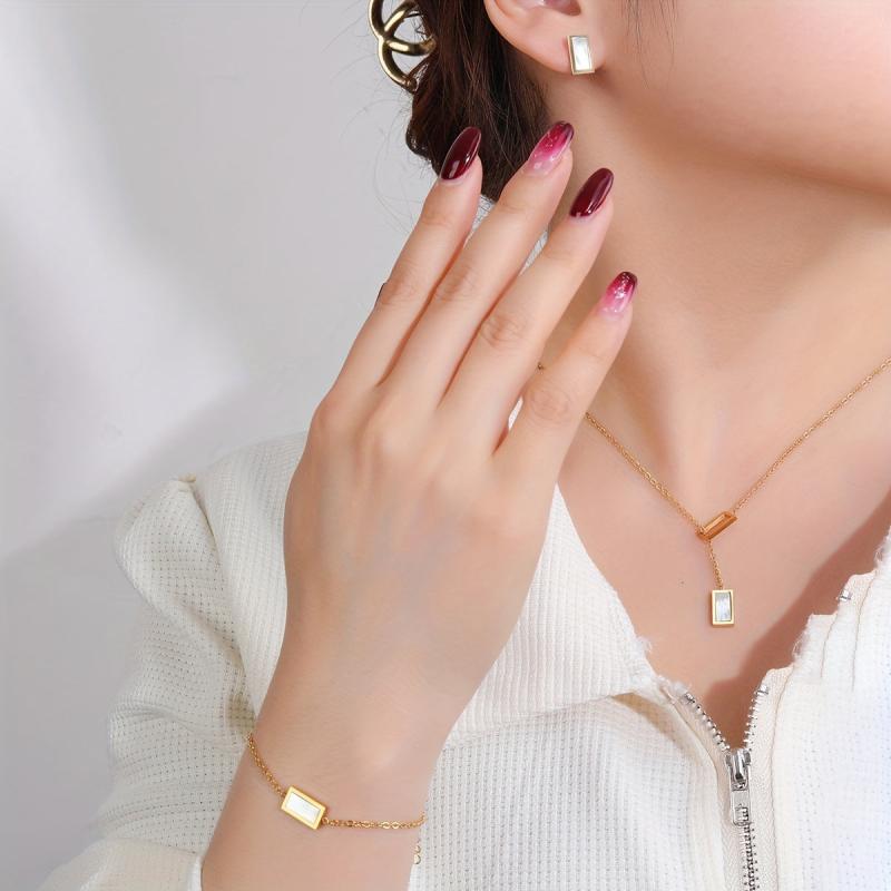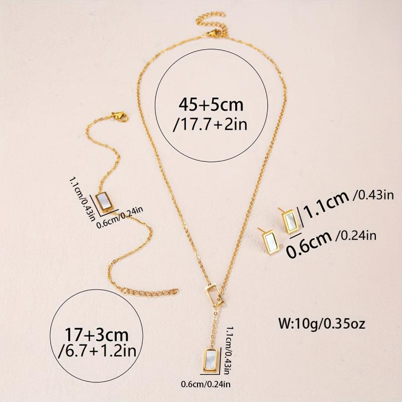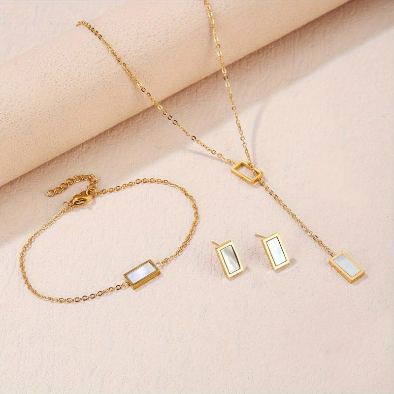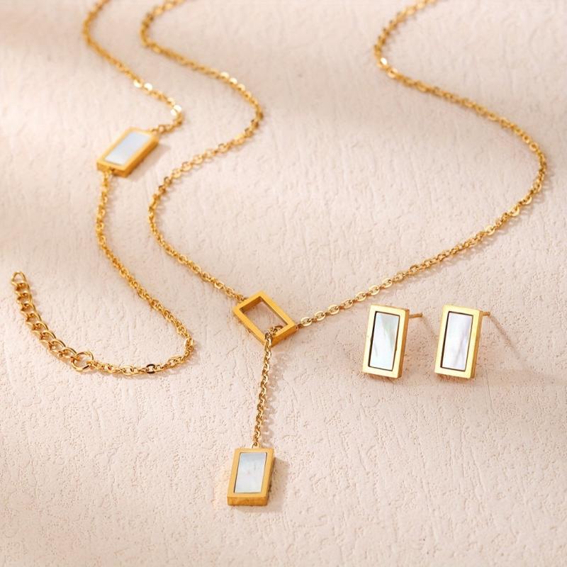 Add a touch of bohemian charm to your look with this stainless steel rectangular seashell necklace, bracelet, and earrings set. Perfect for birthdays, dates, or dance nights, this accessory set is a versatile addition to your jewelry collection.