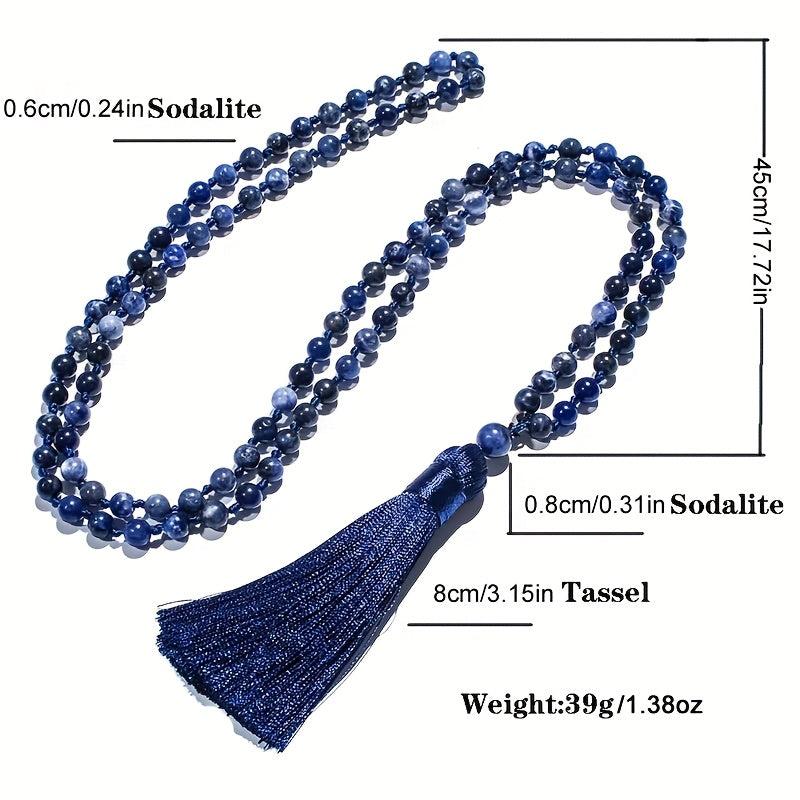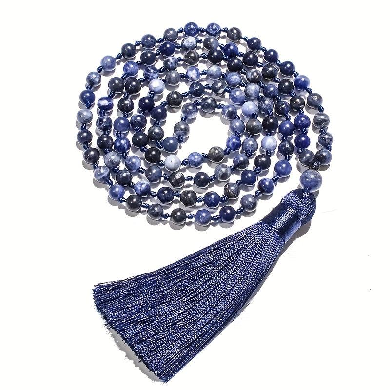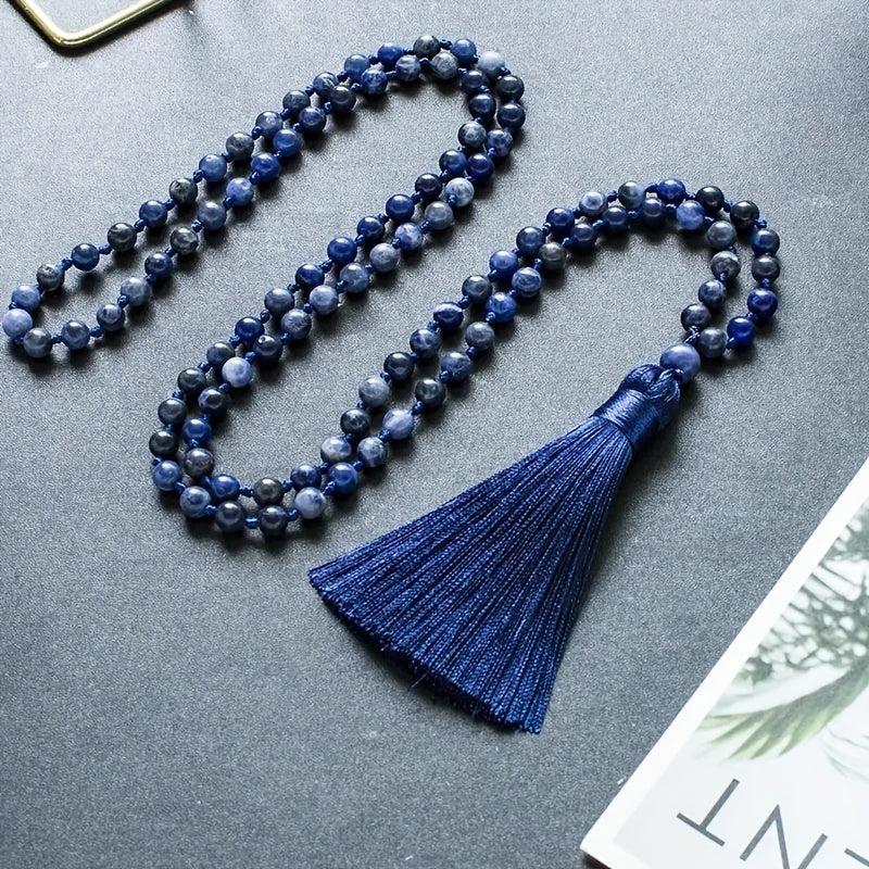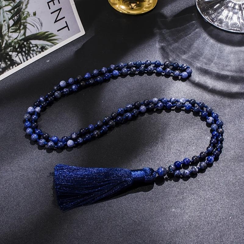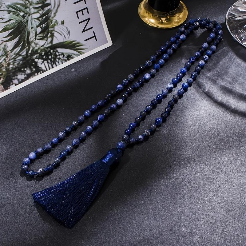 Elegant 6mm square sodium stone necklace with 108 marala beads. Perfect for daily wear or gifting, this versatile all-season accessory adds a touch of bohemian charm to any outfit.