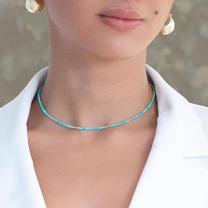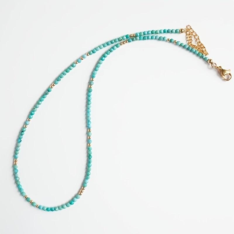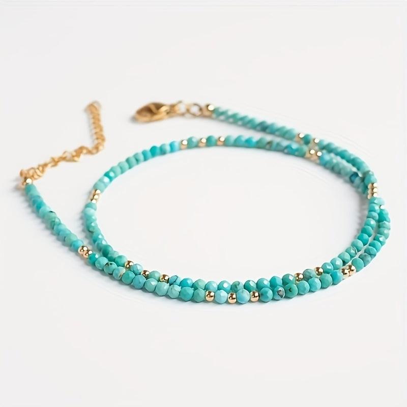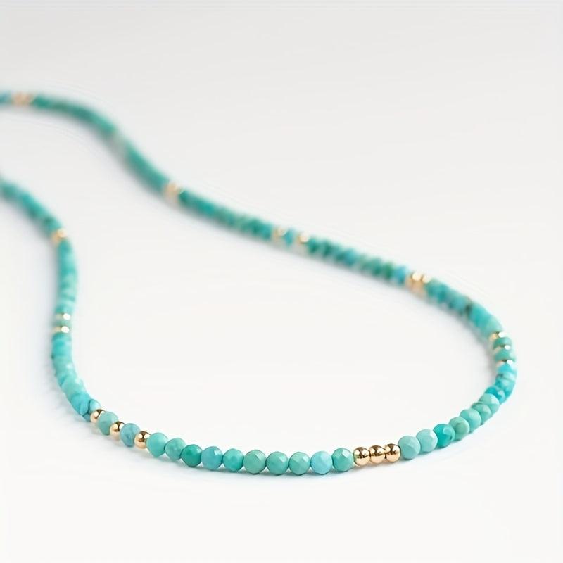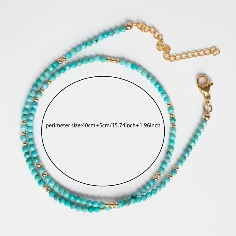 This beautiful necklace features natural turquoise beads with golden tone accents, perfect for daily wear and adding a touch of bohemian flair to your outfit.
