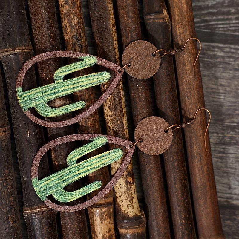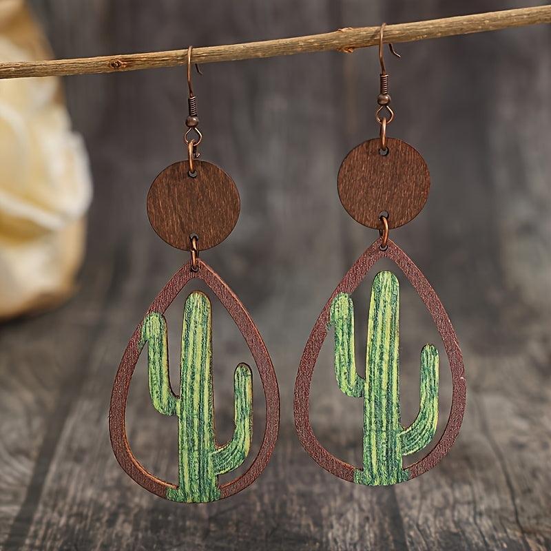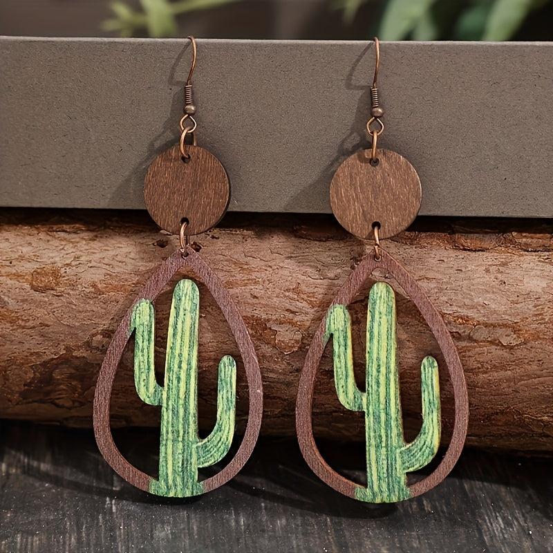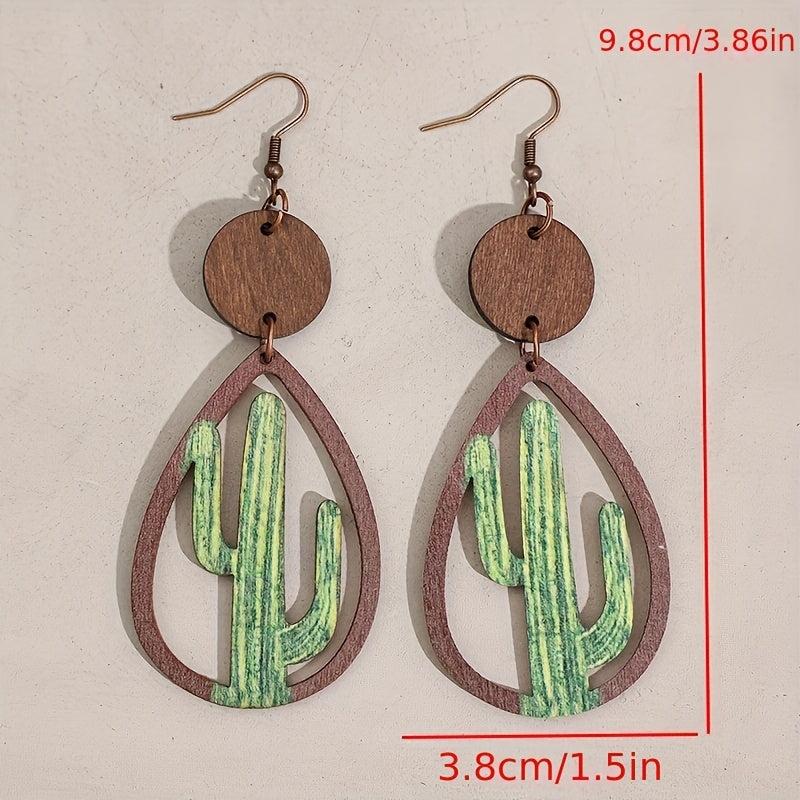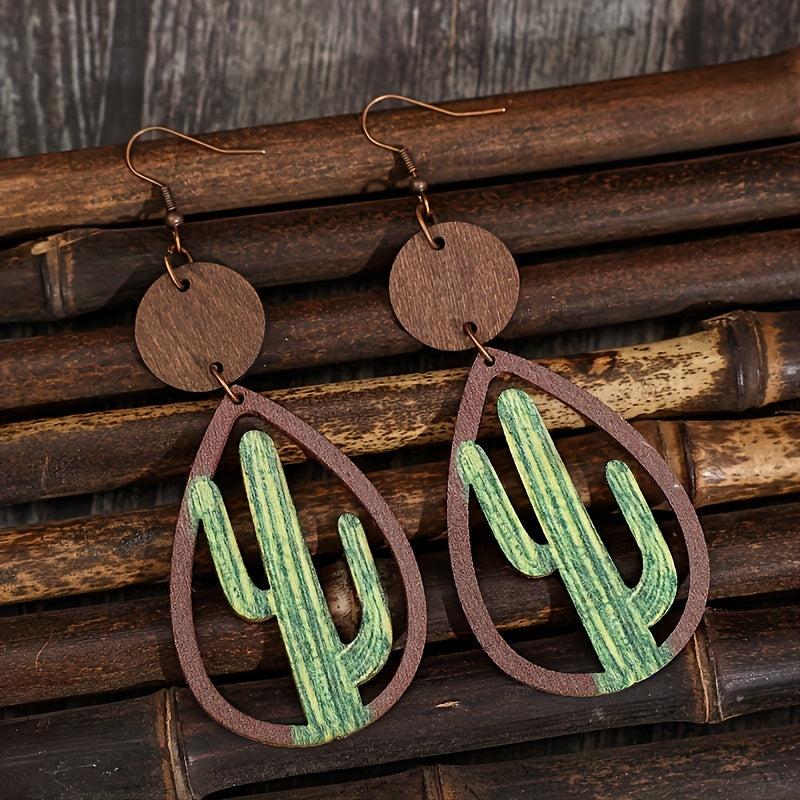 Add a touch of Bohemian flair to your outfit with these wooden cactus teardrop earrings. The vintage Western-inspired iron hooks give them a unique charm.