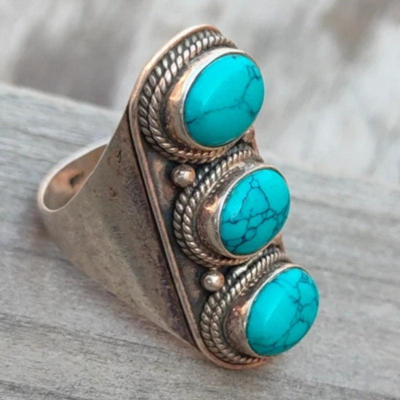 Handcrafted Bohemian declaration ring set with synthetic turquoise, suitable as a daily accessory or a thoughtful holiday gift.
