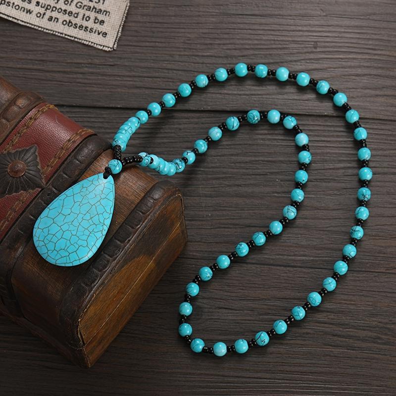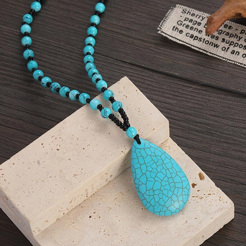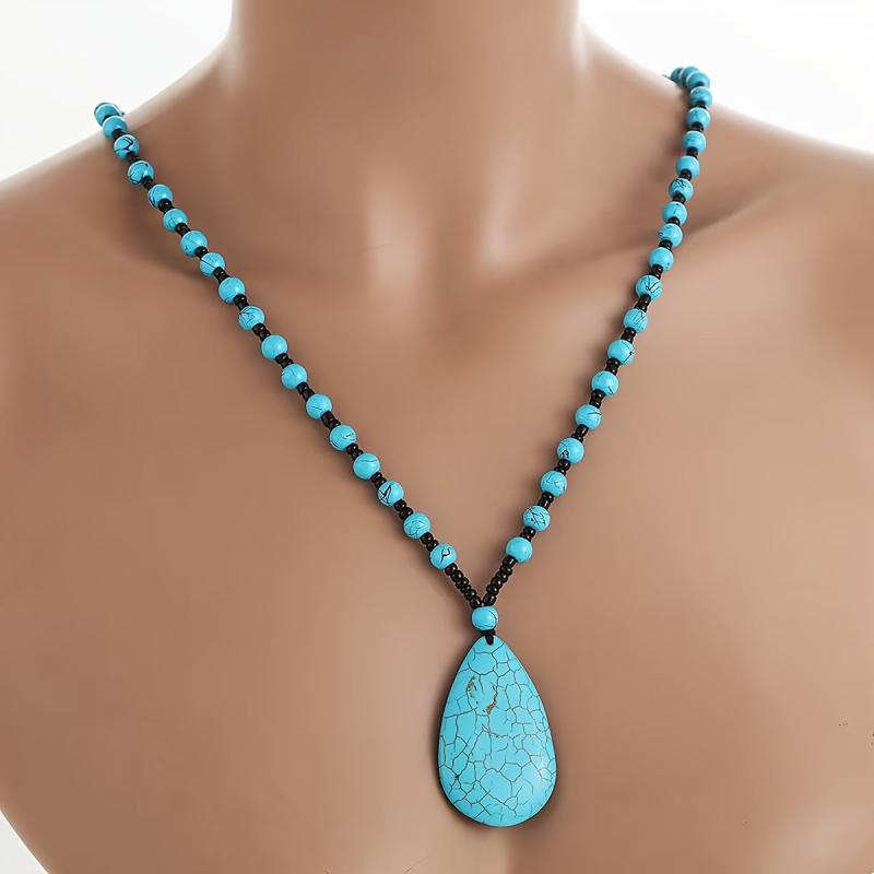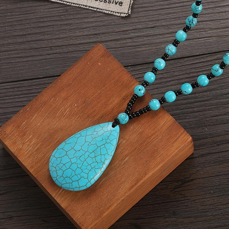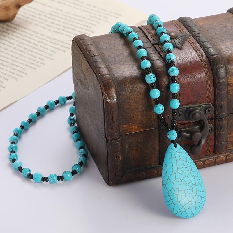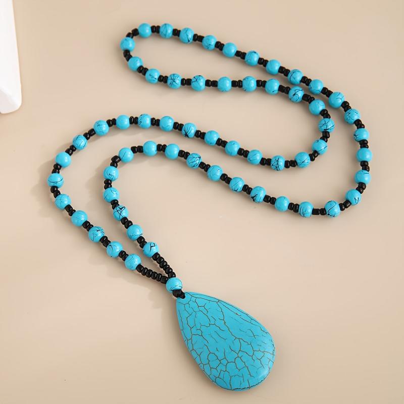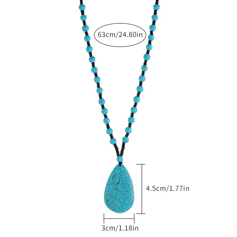 Add a pop of color to your outfit with this Bohemian Turquoise Beaded Teardrop Pendant Necklace. Perfect for parties, vacations, and casual attire.