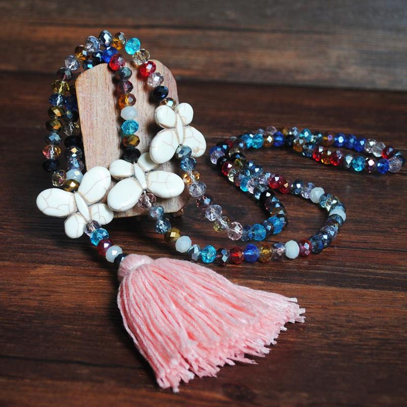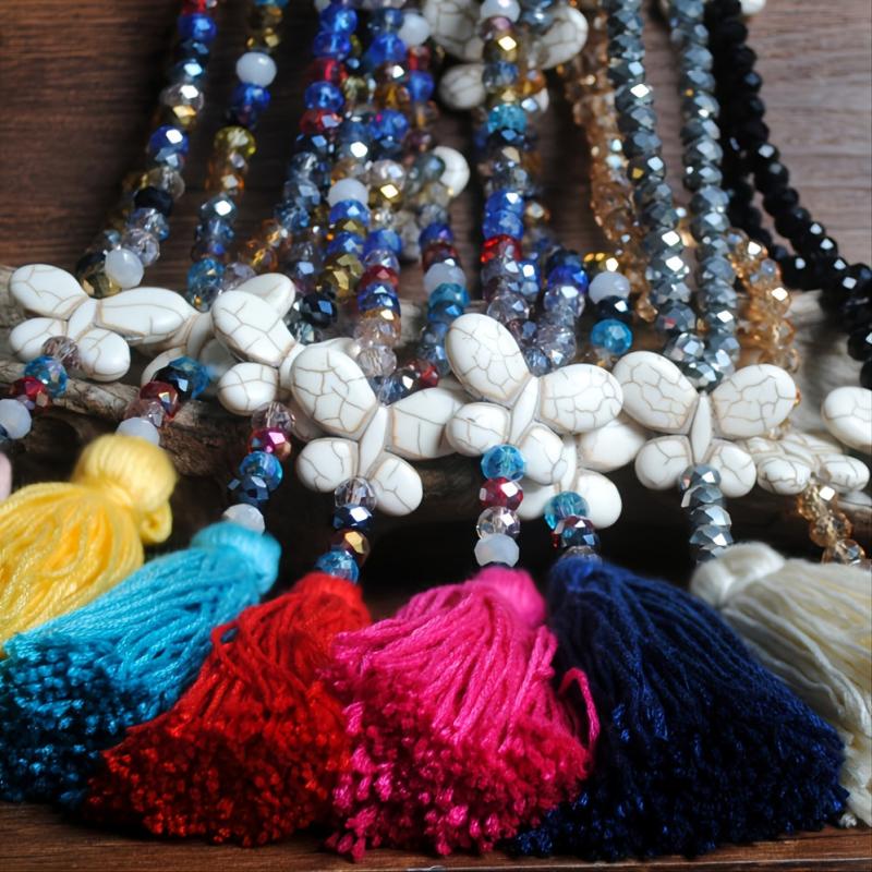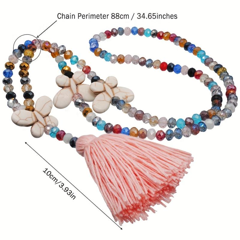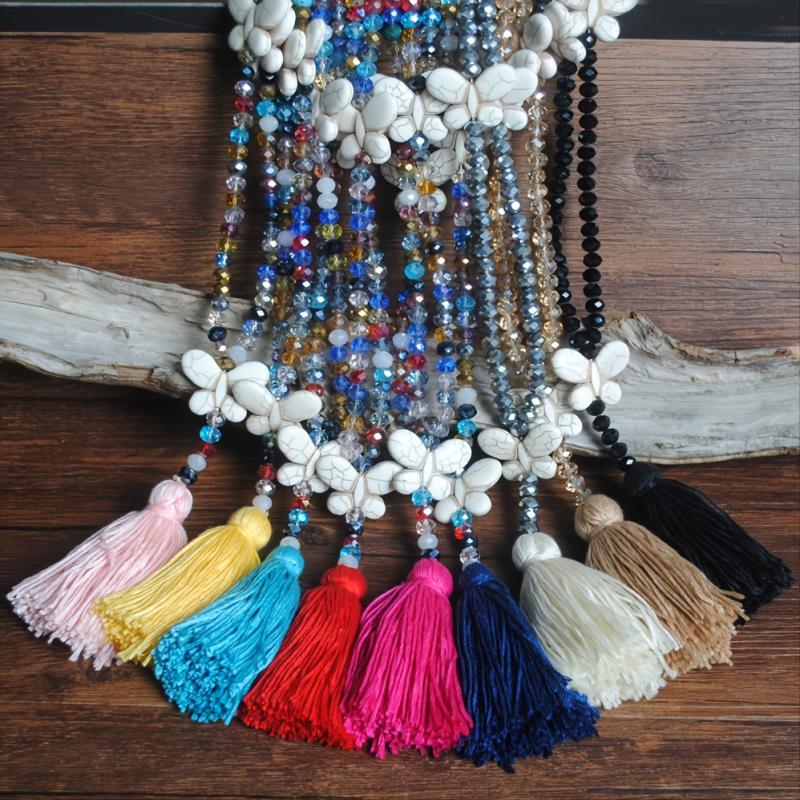 Add a touch of whimsical charm to your outfit with this long boho necklace featuring colorful tassels, crystal beads, and a butterfly charm.