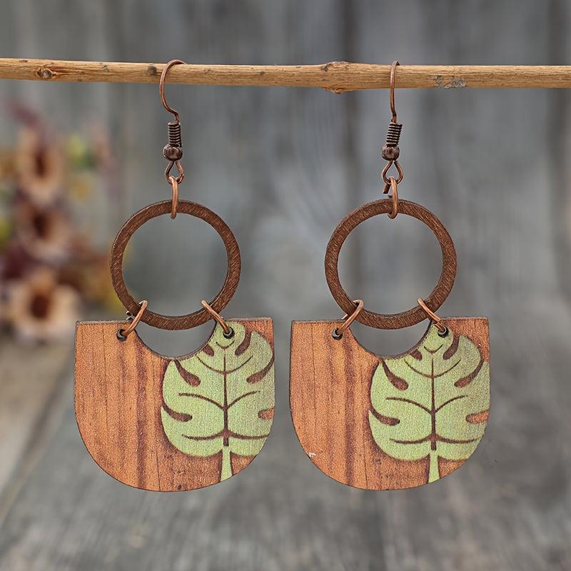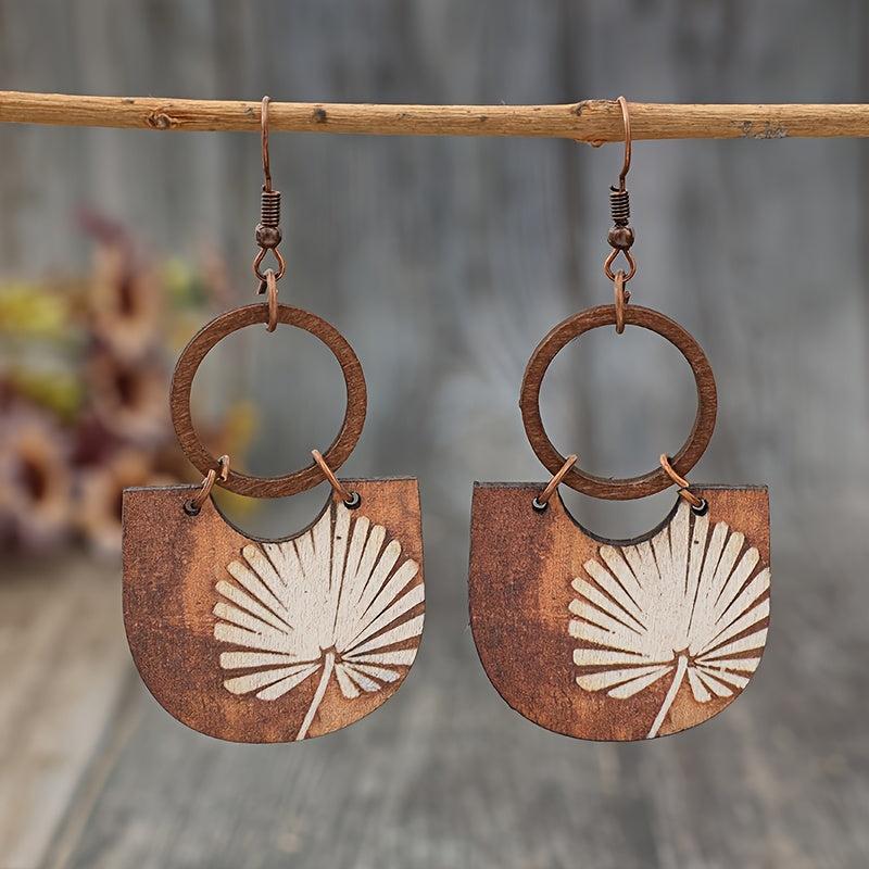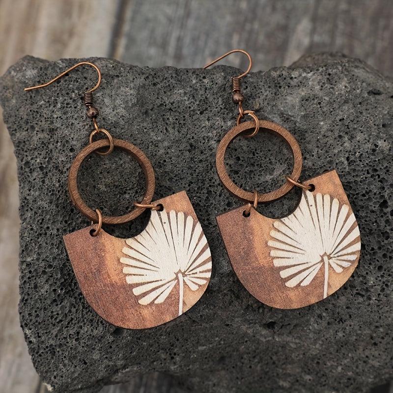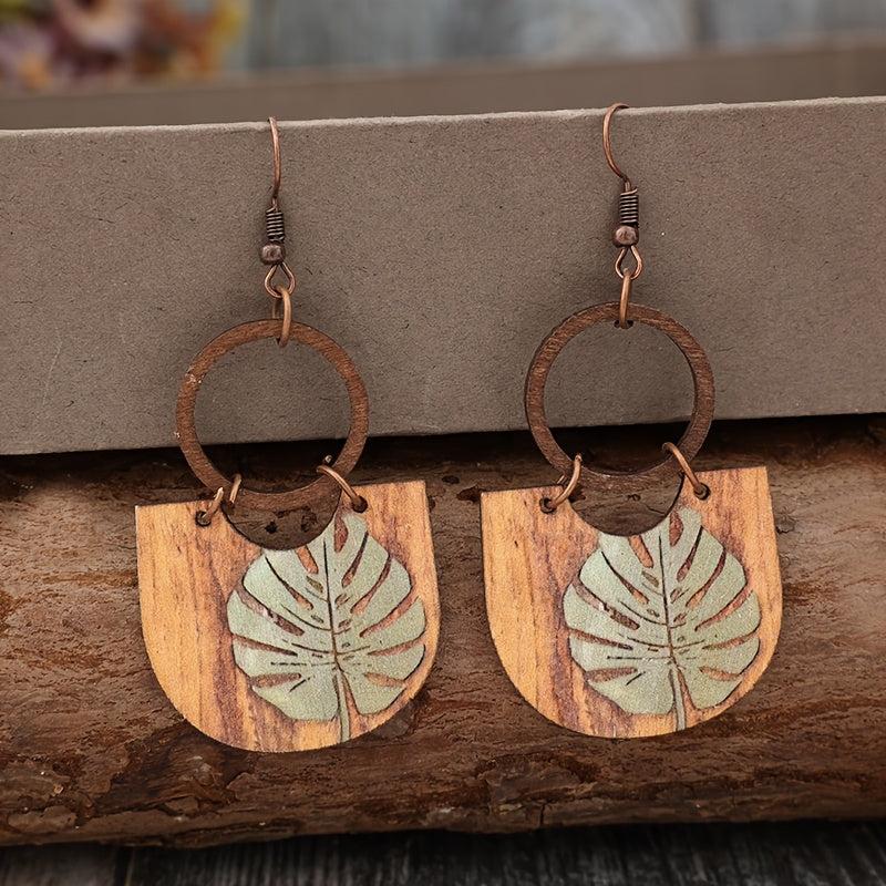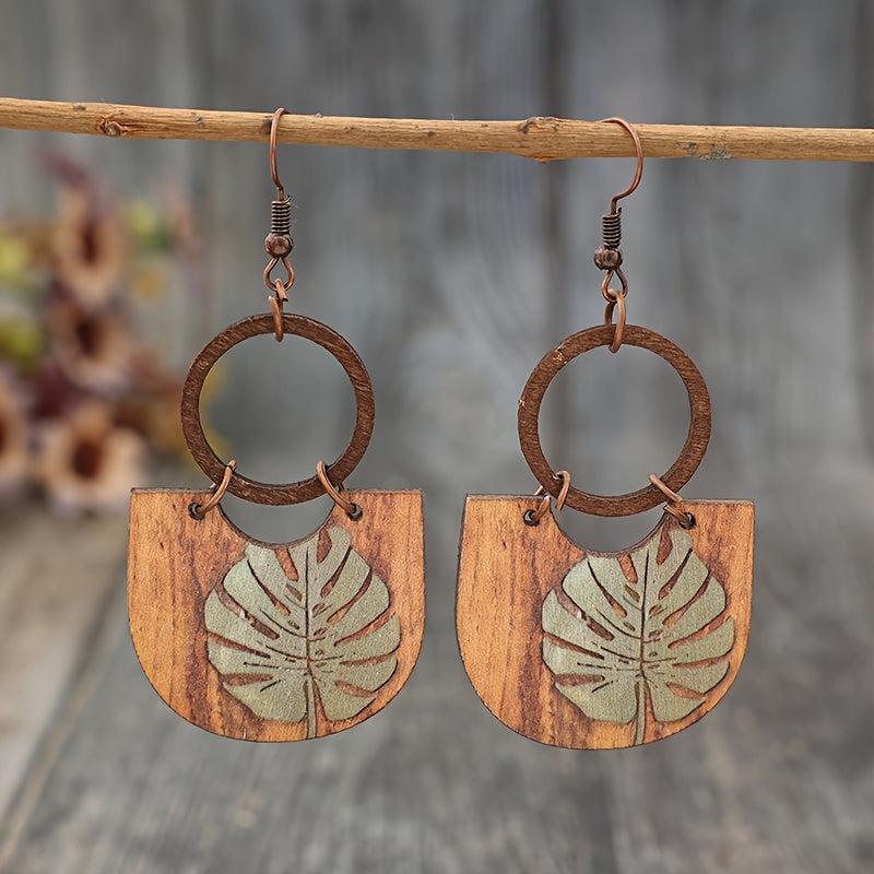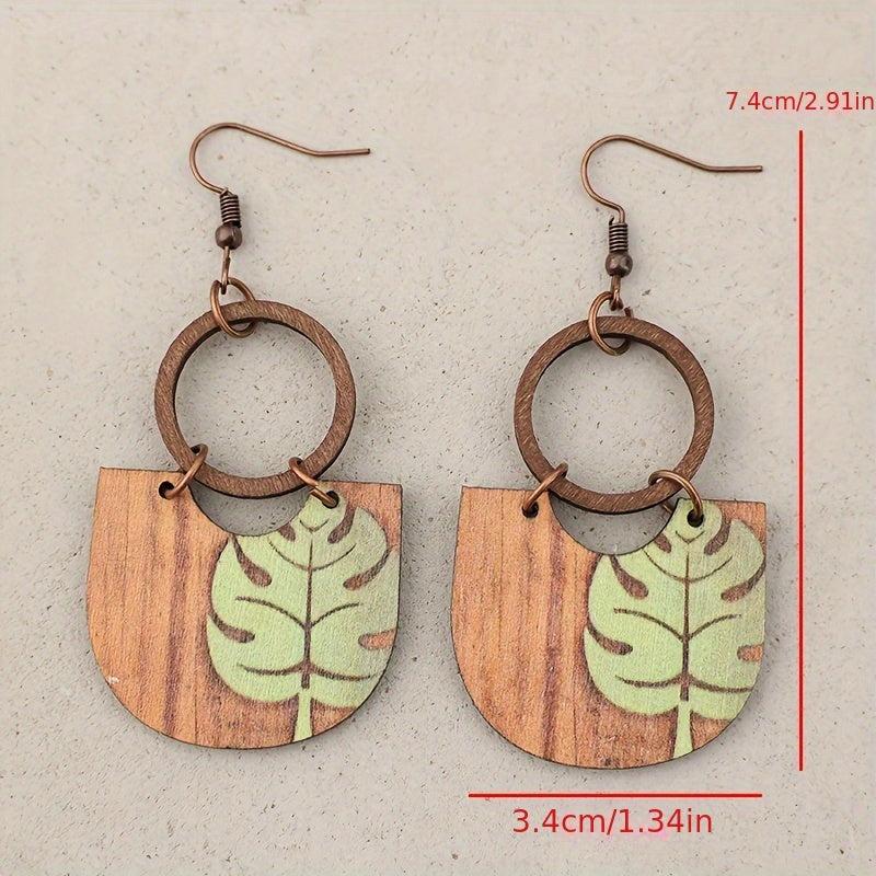 Boho Geometric Wooden Earrings, Leaf Pattern, Casual Style