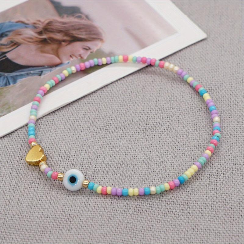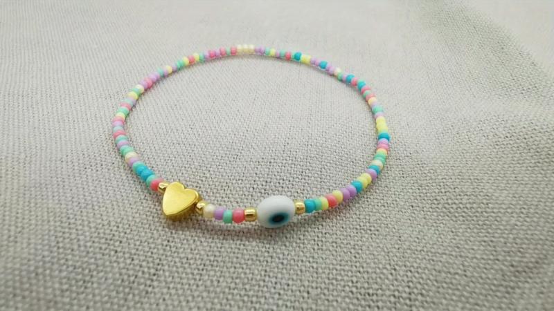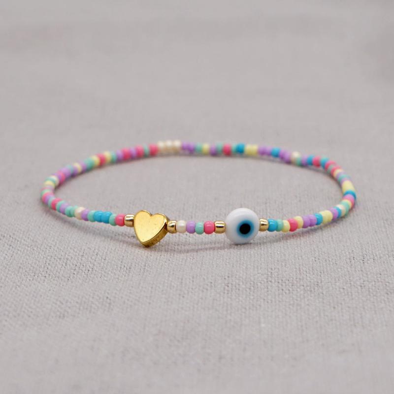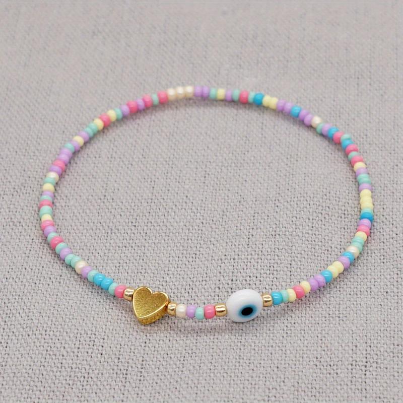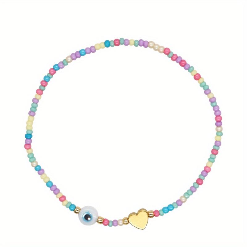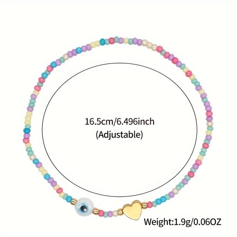 This handwoven bracelet features a mix of glass beads in various colors with a heart charm and evil eye accent. The adjustable design makes it perfect for daily wear or as a thoughtful gift. No plating used.