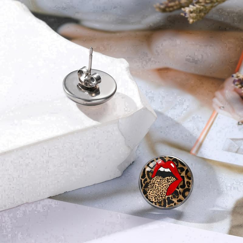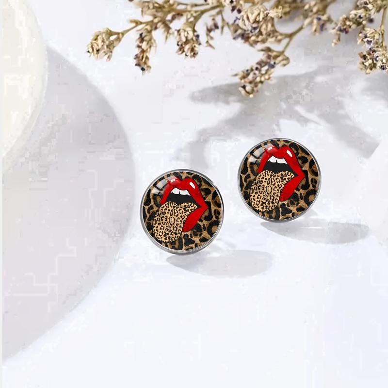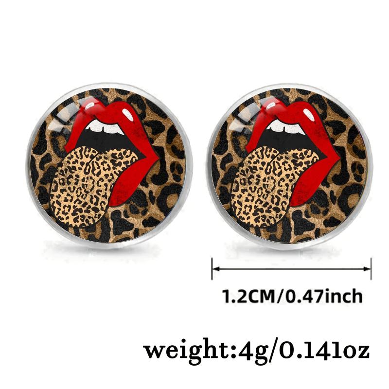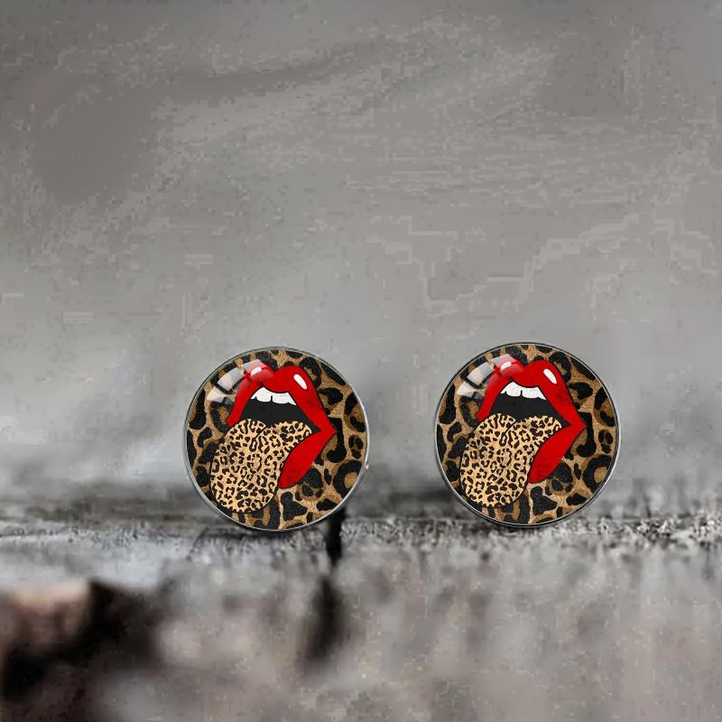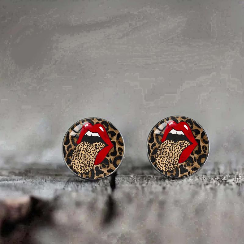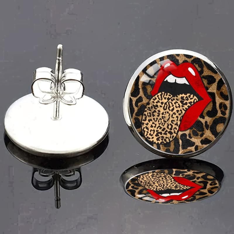 Chic and stylish stud earrings featuring a boho leopard print with red lips design. Made with synthetic glass and 304 stainless steel post. Perfect for both men and women.