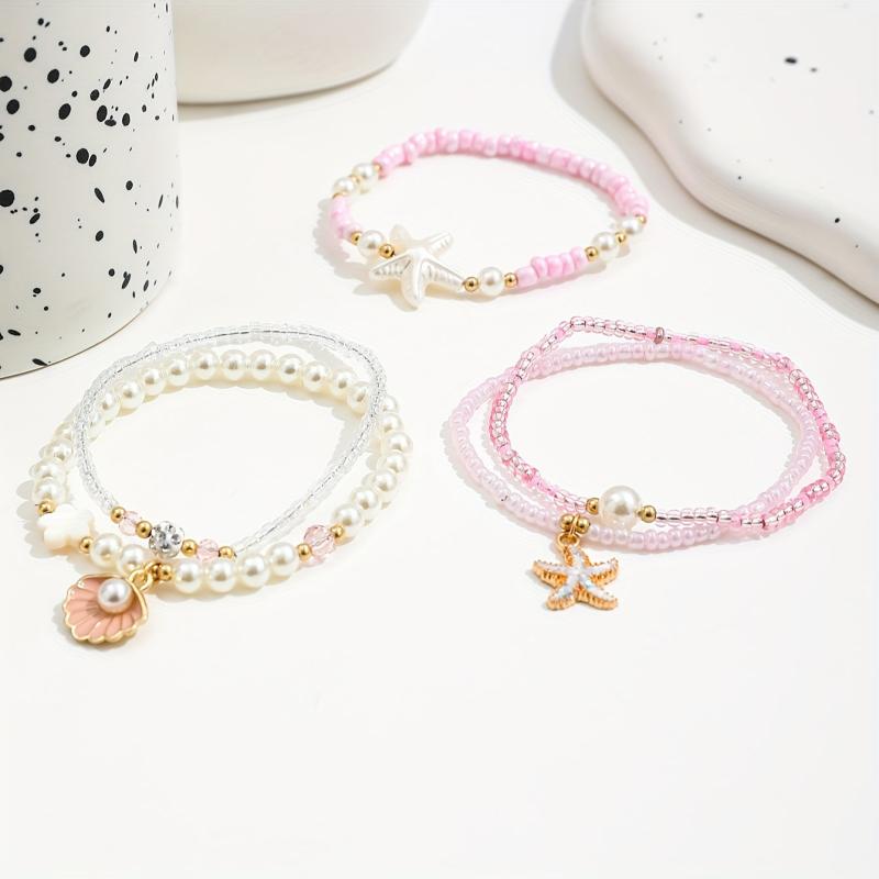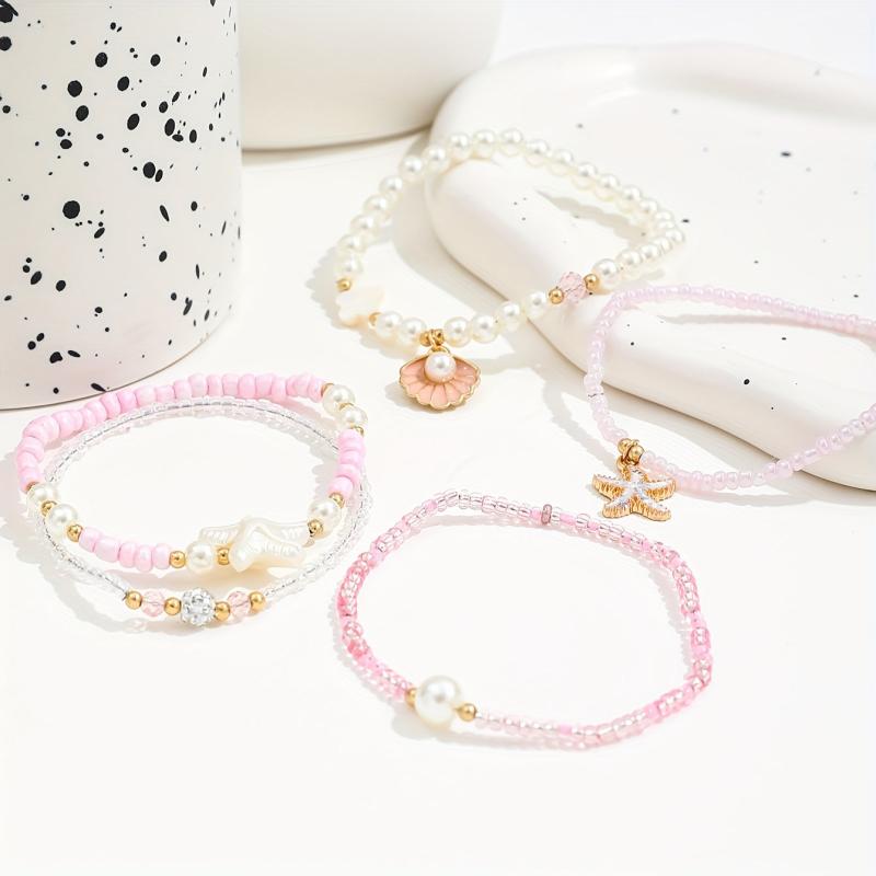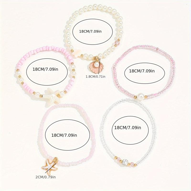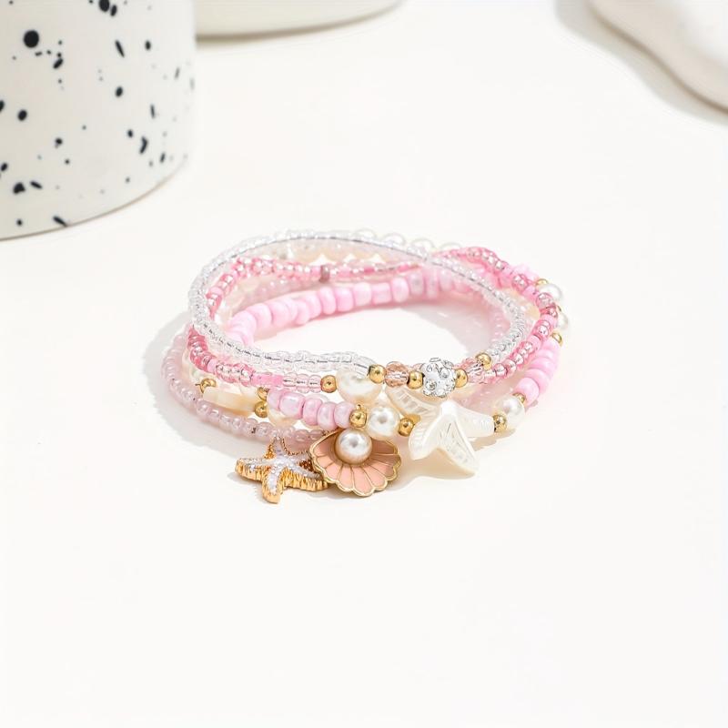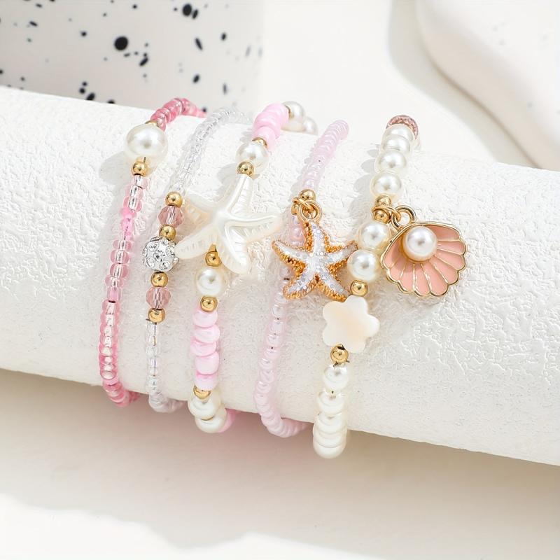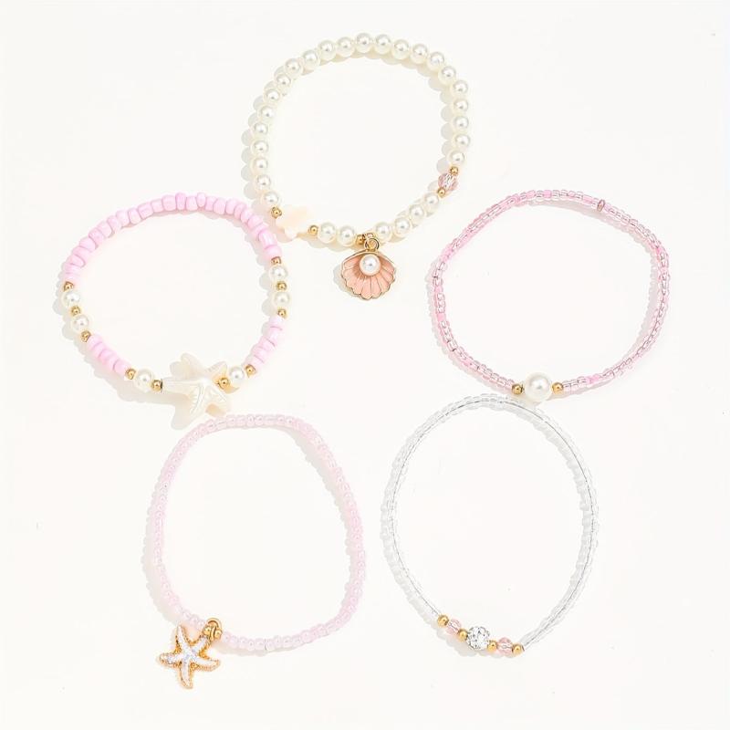 Add a touch of bohemian style to your outfit with this 5-piece bracelet set. Featuring pink glass seed beads and charms like faux pearls, seashells, and starfish pendants, these bracelets are perfect for festivals and parties.