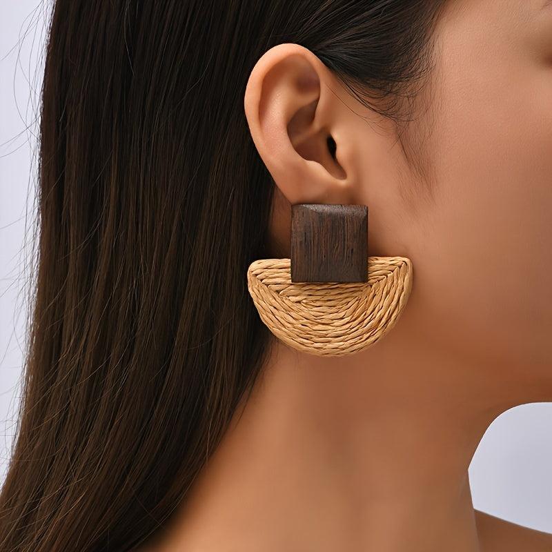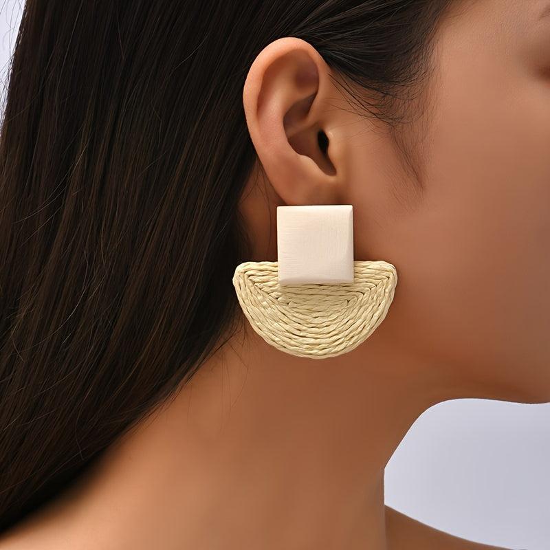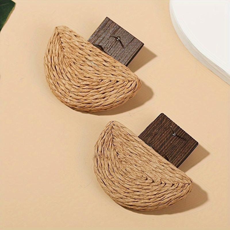 Elevate your vacation and casual attire with these handcrafted rattan fan shaped earrings featuring stainless steel posts.